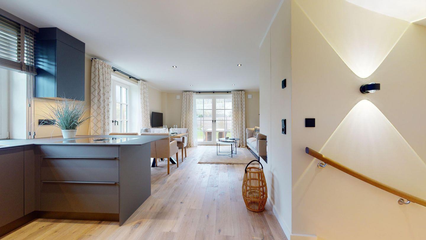Im Erdgeschoss erwartet Sie ein heller, offener Wohn- und Essbereich mit integrierter Küche – der perfekte Ort für gesellige Stunden mit Familie oder Freunden. Die gemütliche Sofaecke mit Gaskamin lädt zum Verweilen ein, und der eingebaute Weinkühlschrank sorgt dafür, dass Ihre Lieblingsweine stets perfekt temperiert sind. Ein Gäste-WC ergänzt den Komfort auf dieser Ebene.
