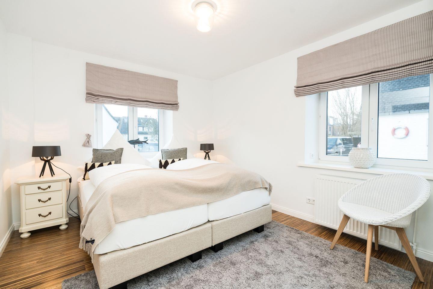 Das Schlafzimmer verfügt über ein bequemes und hochwertiges Boxspringbett in Hotelqualität und befindet sich im EG der Wohnung.