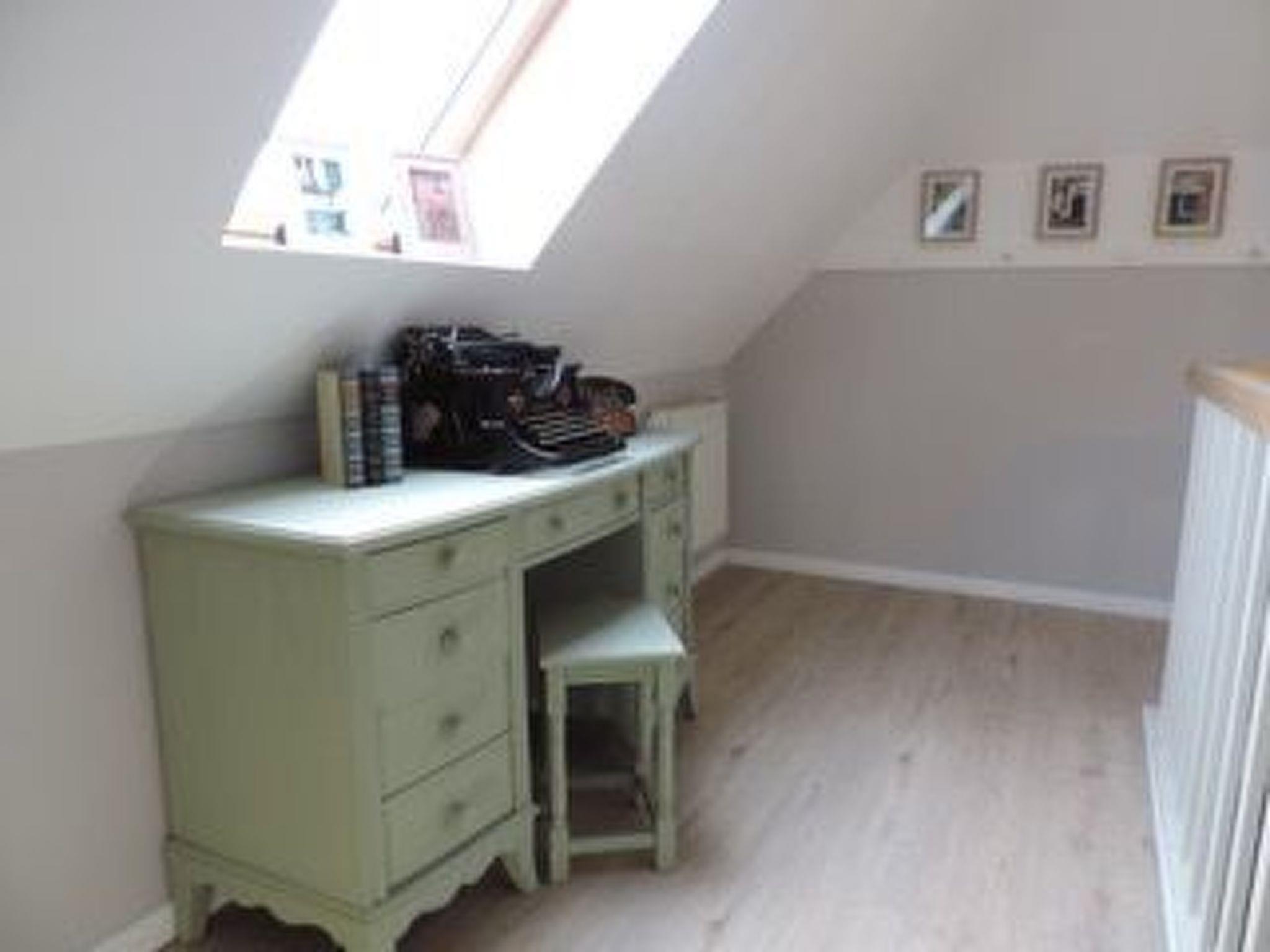 Das Erdgeschoss ist ca. 65 qm groß und verfügt über ein helles lichtdurchflutetes Wohnzimmer, helles Schlafzimmer mit Doppelbett 180 x 200, Schlafzimmer oder Lesezimmer mit einem Einzelbett 100 x 200, Badezimmer mit begehbarer Dusche, Waschbecken, Toilette und Fenster, großer Hauswirtschafts-Raum und die wunderschöne Küche mit Kaminofen und fantastischem Blick in den Garten. Im Dachgeschoss befindet sich ein großes helles Schlafzimmer mit Doppelbett 1,80 m x 2,00 m (hier ist die Möglichkeit gegeben ein Zustellbett aufzustellen). Ein Badezimmer mit Dusche, Waschbecken, Toilette und Fester.