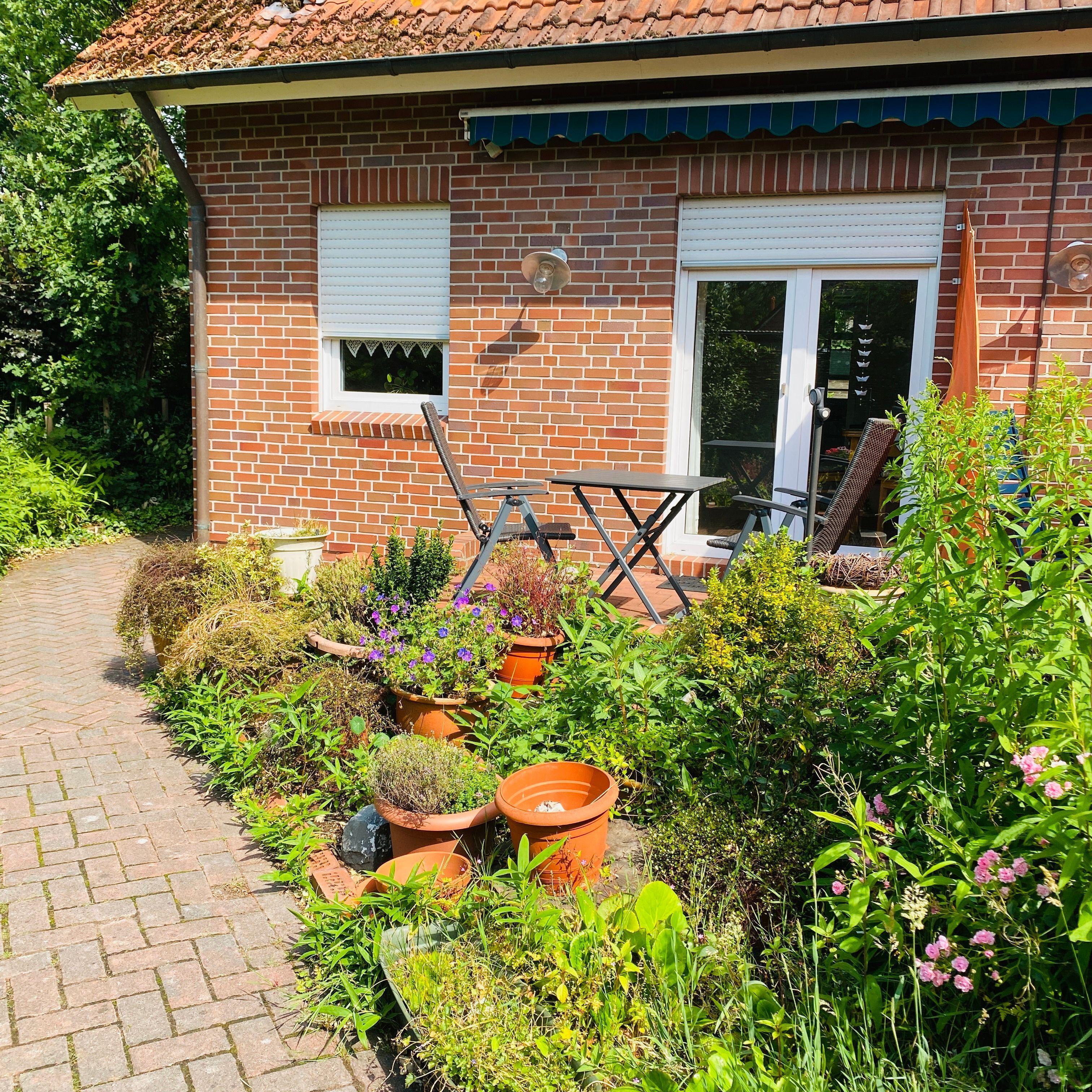 Der Außenbereich der Ferienwohnung besticht durch eine einladende Terrasse, die sich hervorragend eignet, um die ruhigen Morgen- oder Abendstunden in vollen Zügen zu genießen. Der Garten verspricht entspannte Tage im Freien, wo Sie die Seele baumeln lassen können.