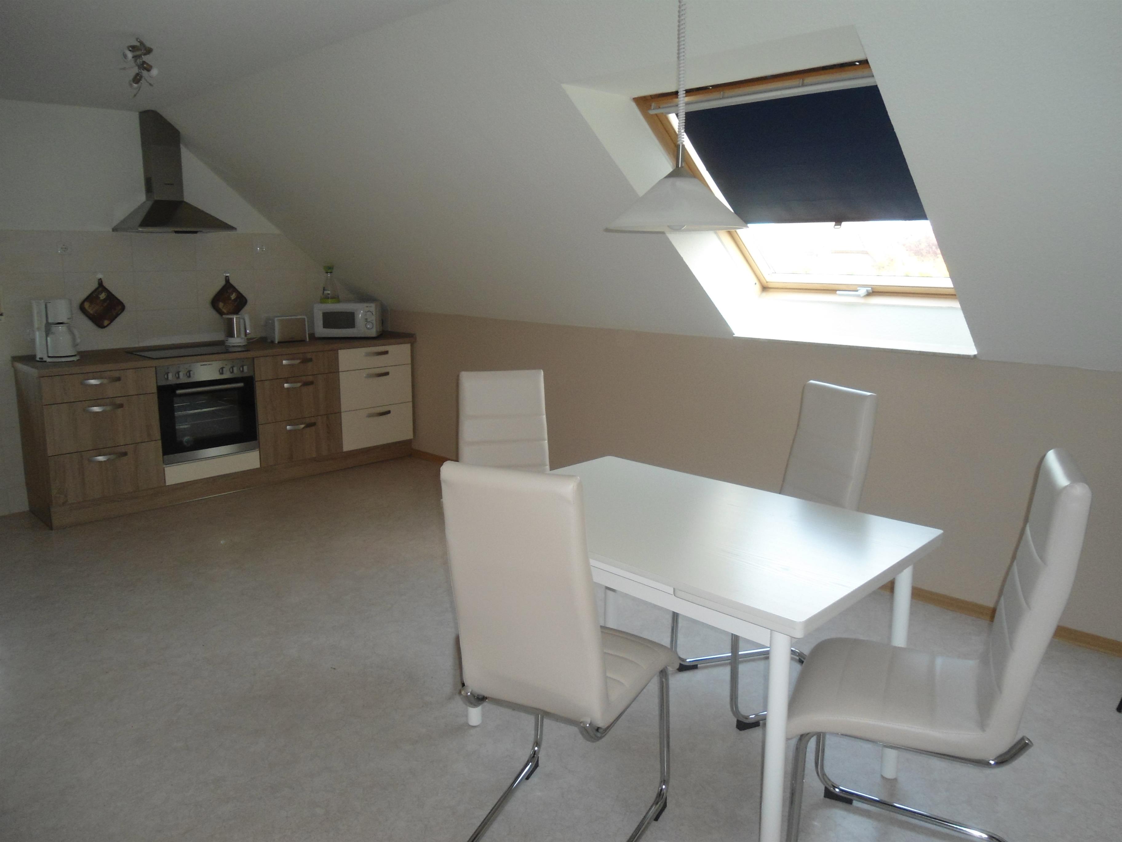 Ceranfeld, Backofen, Mikrowelle, Spülmaschine, Kühlschrank mit Gefrierfach, Kaffeemaschine, Toaster, Wasserkocher und einem Essplatz für 4-6 Personen.