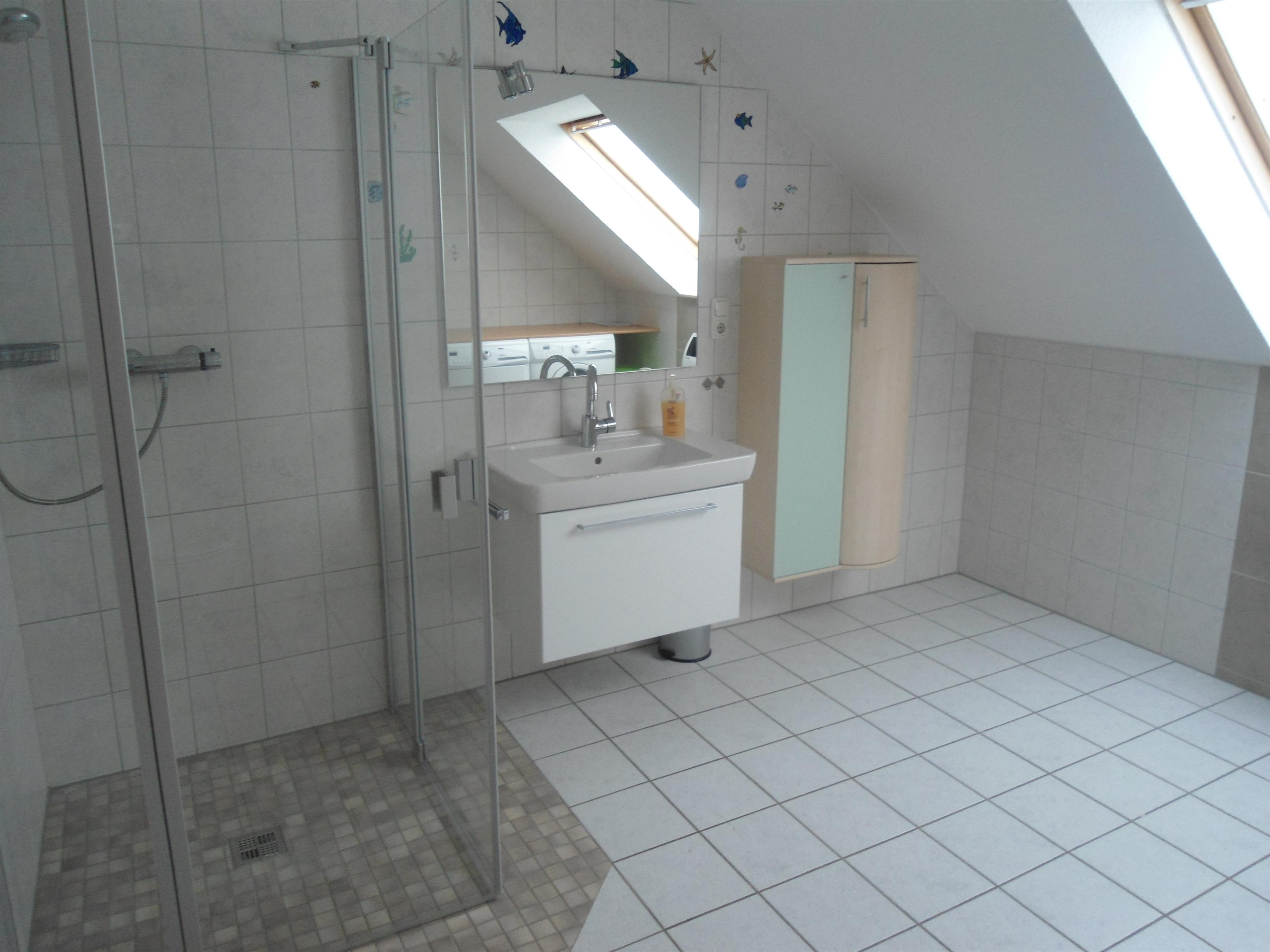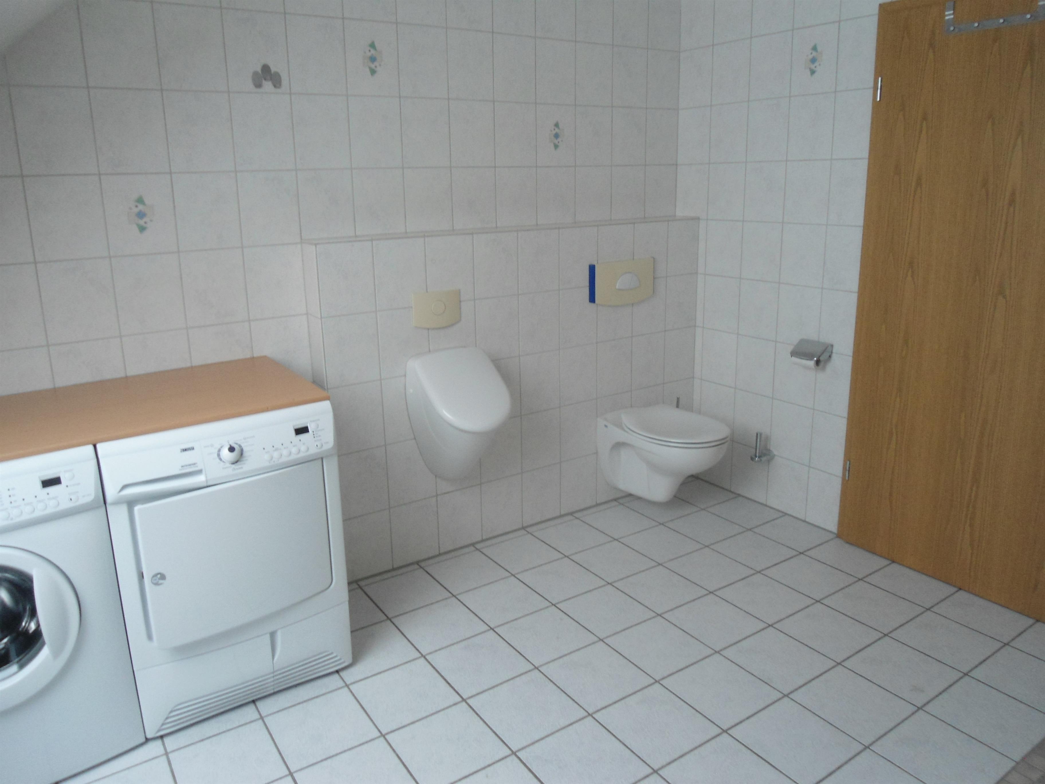 Große begehbare Dusche, WC, Urinal, Waschtischanlage, beleuchteter Spiegel,Waschmaschine, Wäschetrockner und ausreichend Ablageflächen.