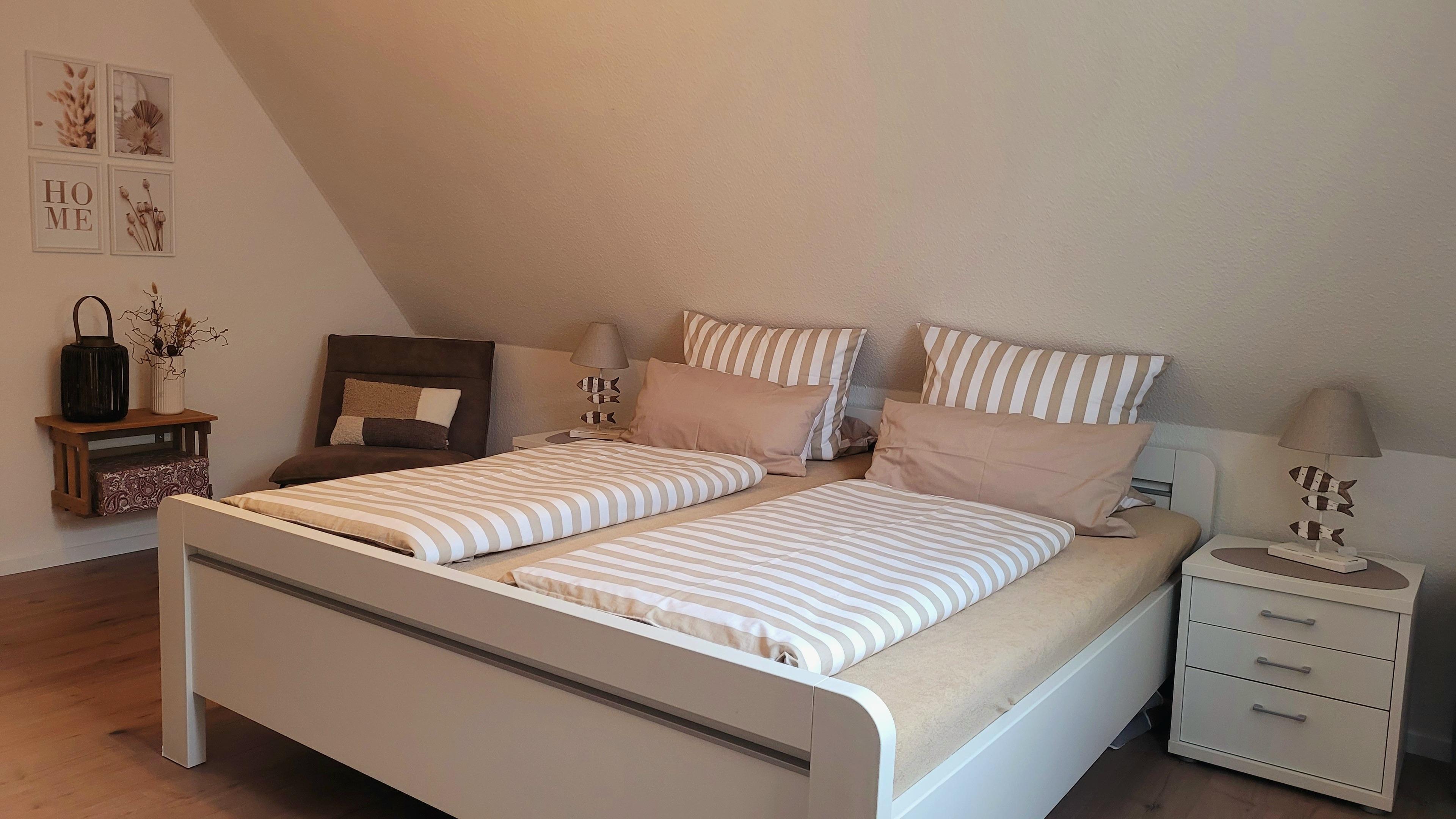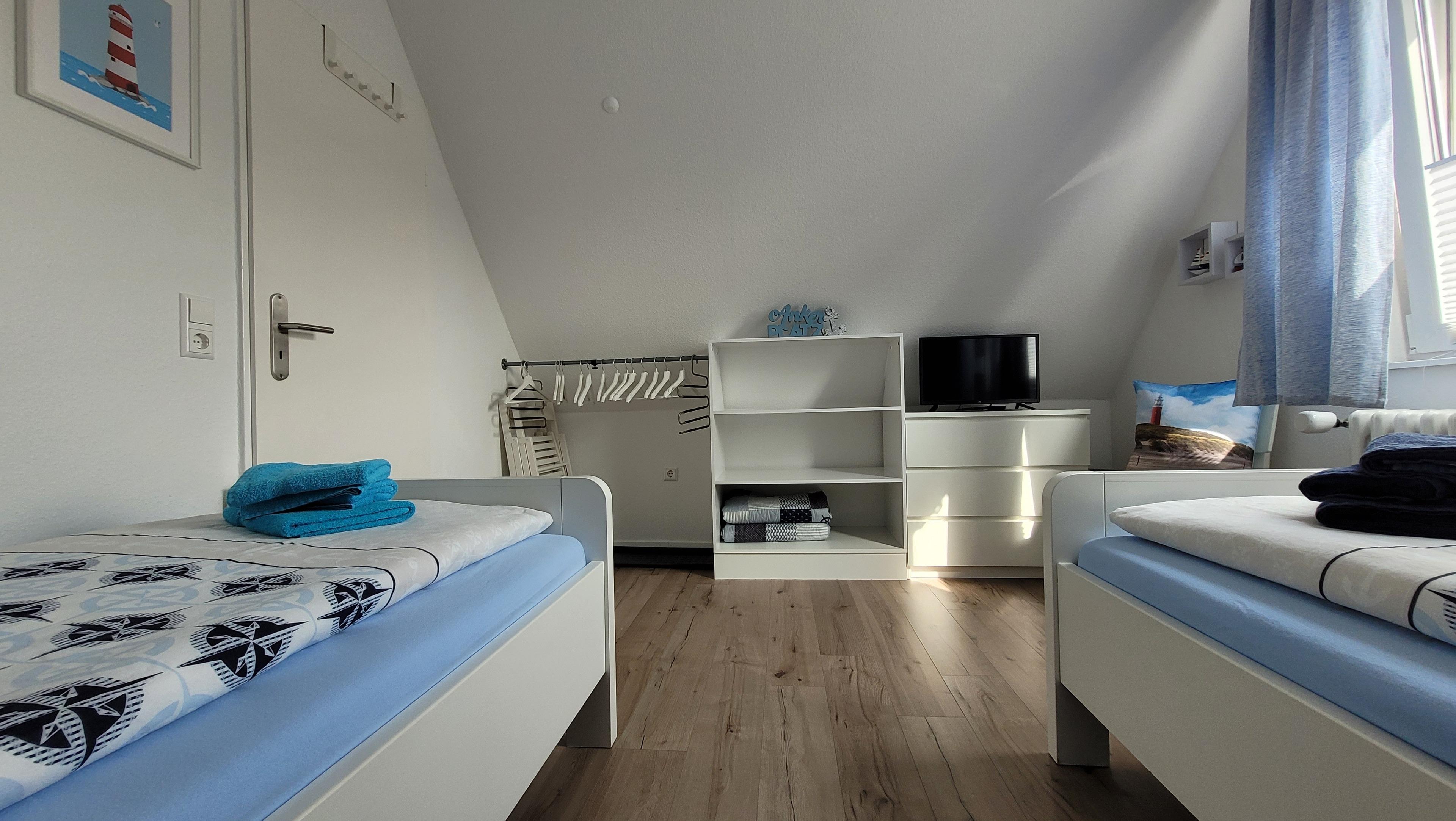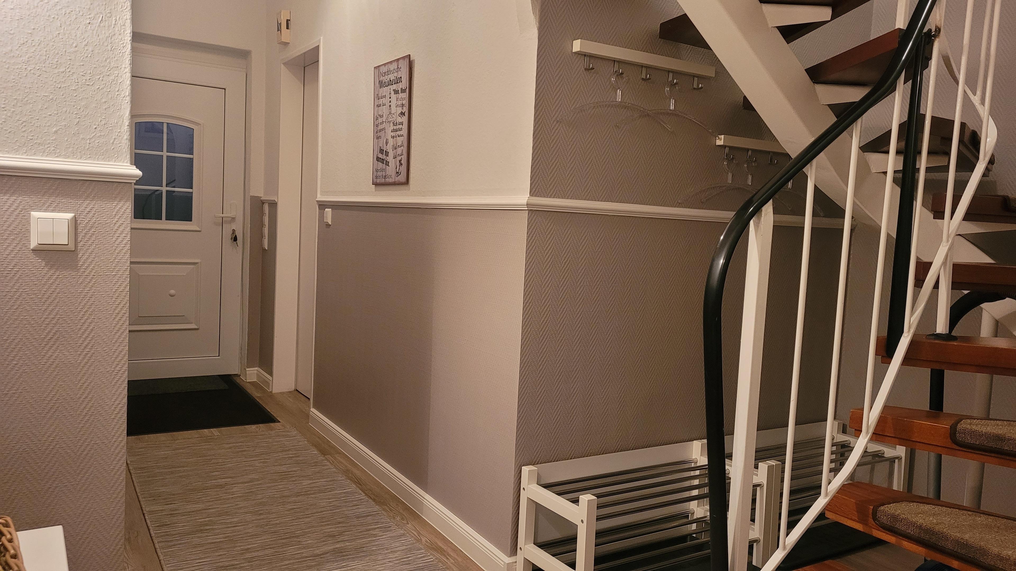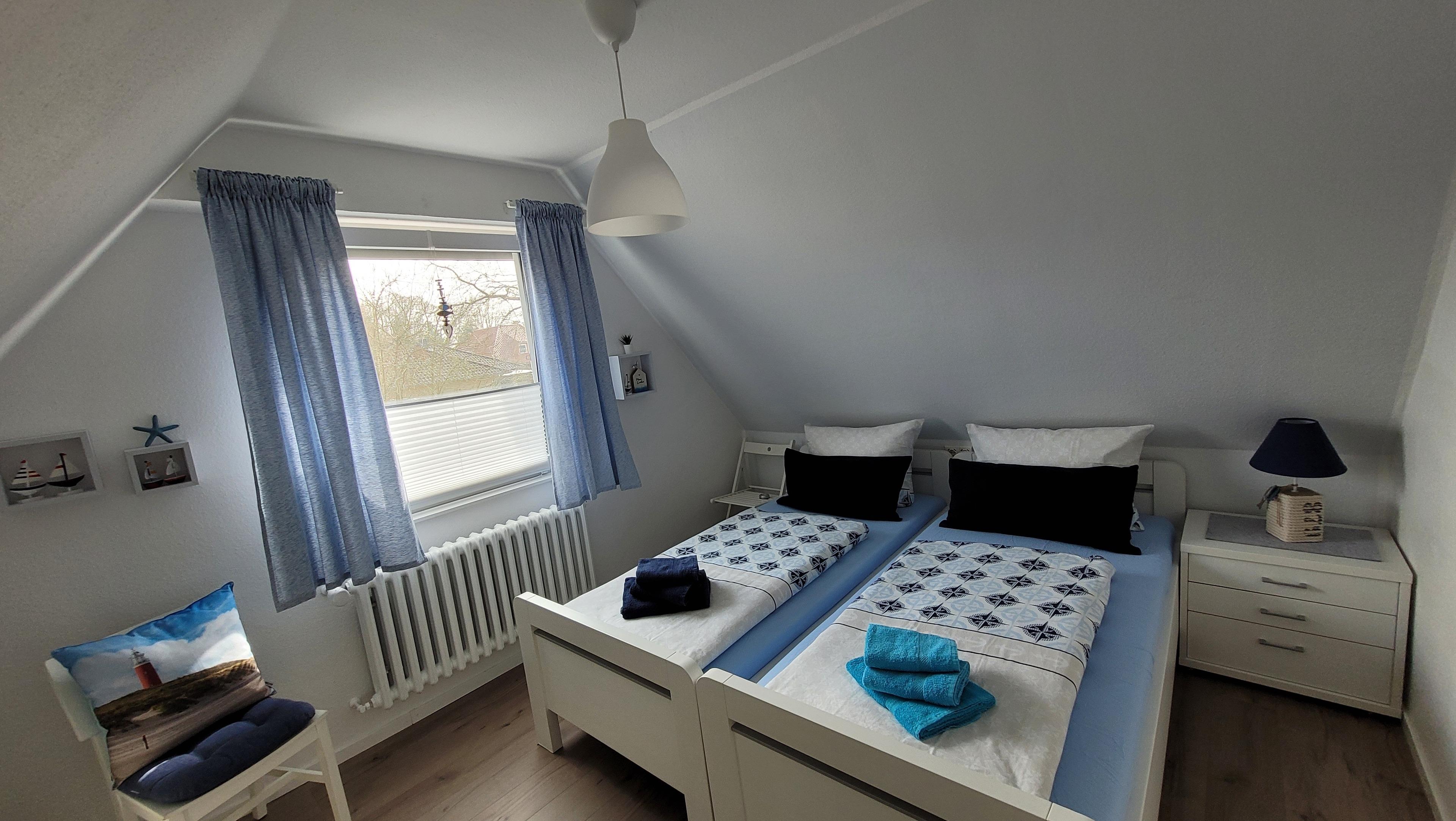 Hausbeschreibung: Im Erdgeschoss befindet sich ein schöner Hausflur mit angrenzendem Treppenhaus. Wenn Sie die Eingangstür betreten haben, geht es gleich links in ein Tageslicht-Duschbad, rechtsseitig kommen Sie in die lichtdurchflutete Küche, geradeaus erreichen Sie das Wohn/Esszimmer mit großer Fensterfront. Über die Terrassentür gelangen Sie auf die gepflasterte Terrasse mit Überdachung. Ein kleiner umzäunter Garten wurde neu angelegt. Vom Treppenhaus gelangen Sie in die beiden oberen Schlafzimmer. Das größere verfügt über ein Doppelbett 180 x 200 cm (inkl. Topper) bietet zusätzlich Platz für ein Babyreisebett oder eine Klapp-Gästematratze (beides kostenlos für Sie vorhanden). Das zweite Schlafzimmer ist mit zwei Einzelbetten 90 x 200 cm ausgestattet, selbstverständlich können Sie die Betten auch aneinander stellen oder umgekehrt. Jedes Schlafzimmer ist mit einem offenen Kniestock-Kleiderschrank und einer Schubladenkommode ausgestattet, ebenso mit einem Smart TV-Gerät. Im oberen Flur wurde ein Einbauschrank eingebaut in dem Sie den Hochstuhl, das Baby-Reisebett, die Klappmatratze sowie die dazugehörigen Bettdecken, Kissen und Spielsachen vorfinden. Wir bieten Ihnen mit unserem modern eingerichteten Ferienhaus ein Wohlfühlambiente mit einem wunderbaren Ausgangspunkt zu Ihren Unternehmungen.