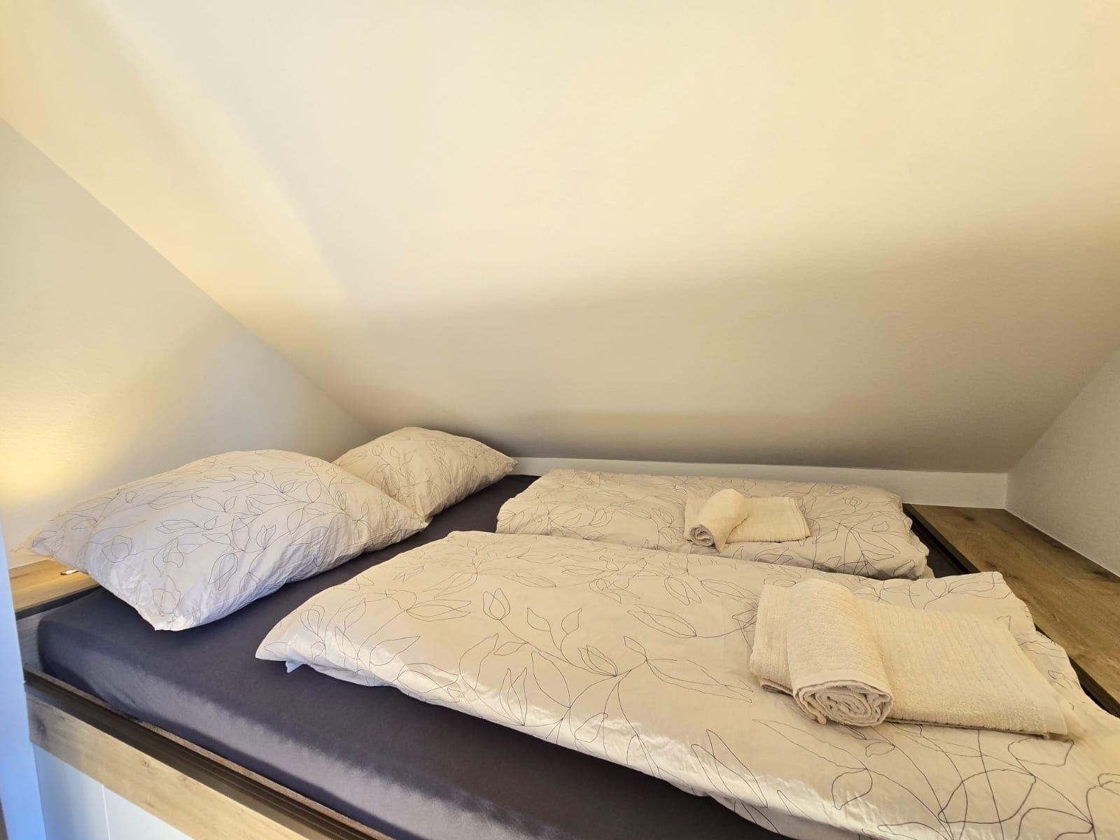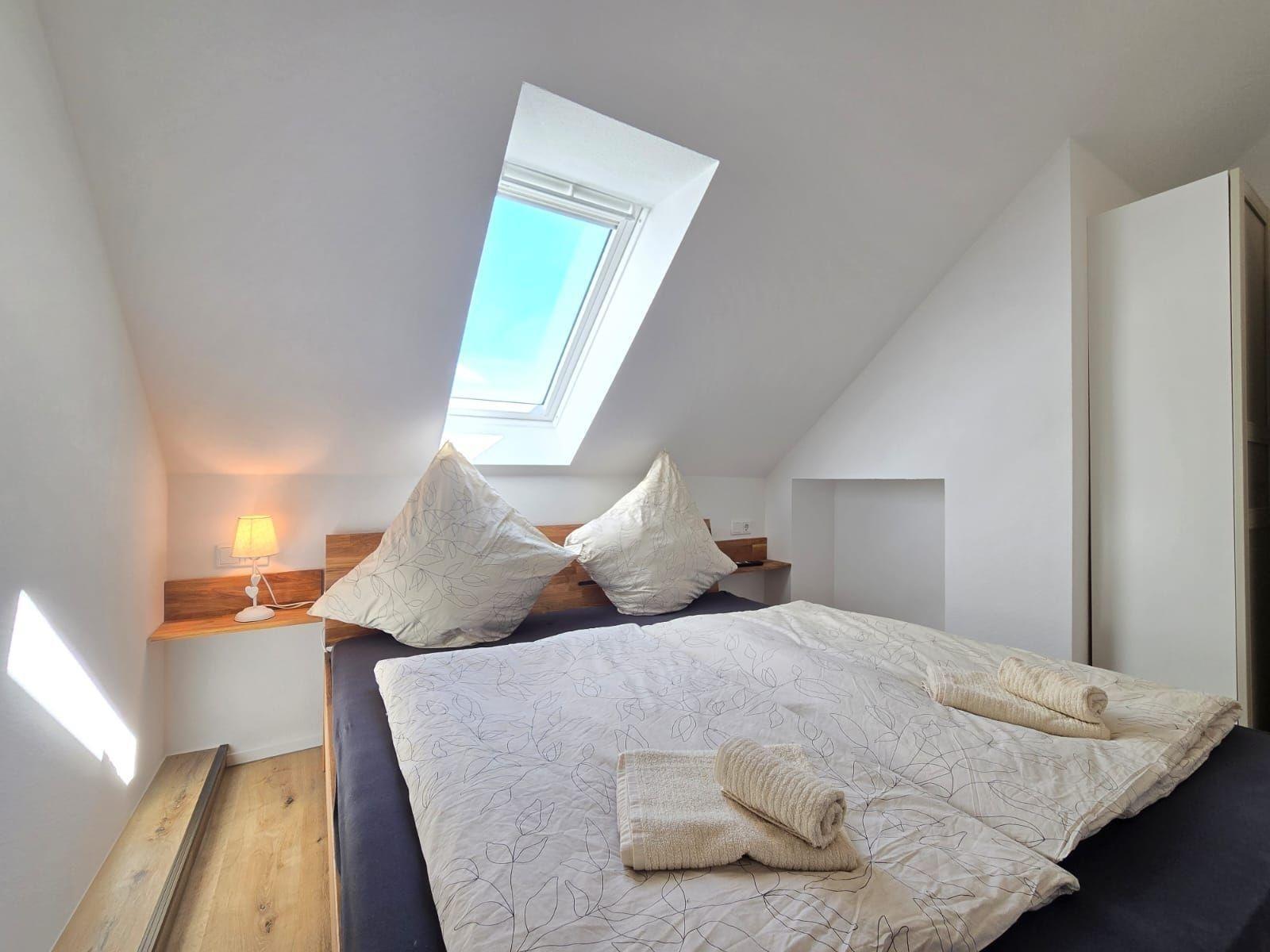 Die Ferienwohnung bietet ein großzügiges und komfortables Ambiente, ideal für entspannte Urlaubstage. Sie verfügt über ein Schlafzimmer mit zwei Doppelbetten sowie ein helles Wohnschlafzimmer, das mit einem Sofa und einem Esstisch ausgestattet ist. Die offene Küche lädt zum Kochen ein und ist mit modernem Equipment wie einem Geschirrspüler, einem Elektro-/Gasherd, einem Backofen und einem Kühlschrank ausgestattet. Ein Kinderhochstuhl, Toaster und Kaffeemaschine gehören ebenfalls zur Grundausstattung.