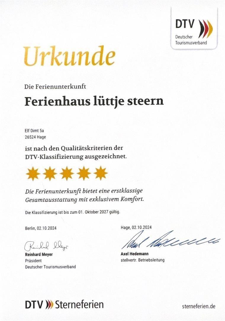 Die Ferienwohnung Lüttje Steern wurde im Oktober 2024 vom DTV mit der höchsten Kategorie von 5 Sternen ausgezeichnet, und bietet Ihnen demzufolge eine erstklassige Gesamtausstattung mit exklusivem Komfort."