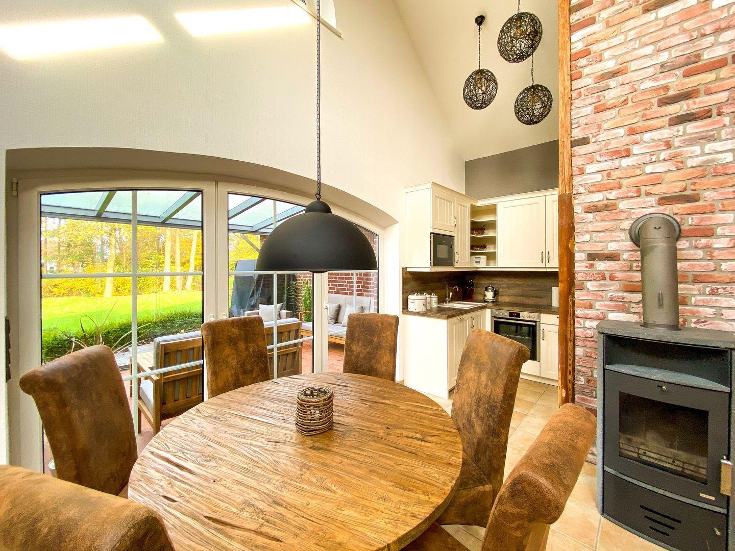 Der über zwei Etagen reichende Wohnbereich mit Fußbodenheizung ist offen und großzügig gestaltet und verfügt über eine große gemütliche Ledercouch und einen 4K-Smart-TV mit 65" mit Ambilight und Apps wie Netflix, Amazon Prime Video und viele mehr. Zur Unterhaltung steht nicht nur ein Blu-Ray-Player mit vielen aktuellen Blu-Rays und Kinderfilmen, sondern auch eine Wii-U-Spielekonsole von Nintendo bereit. Weiterhin steht ein hochwertiger smarter Lautsprecher von Bose zur Verfügung. An kühleren Tagen schafft das beruhigende Knistern der Flammen im Kamin ein Stück Gemütlichkeit. Der rustikale Esstisch und die halboffene, großzügig gestaltete Küche laden zum Essen und Genießen ein. Die drei Schlafzimmer mit Betten in King Size und Queen Size vermitteln Dank einer durchdachten Innenarchitektur Entspannung pur und verfügen allesamt über Testsieger-Matratzen sowie Smart-TVs.