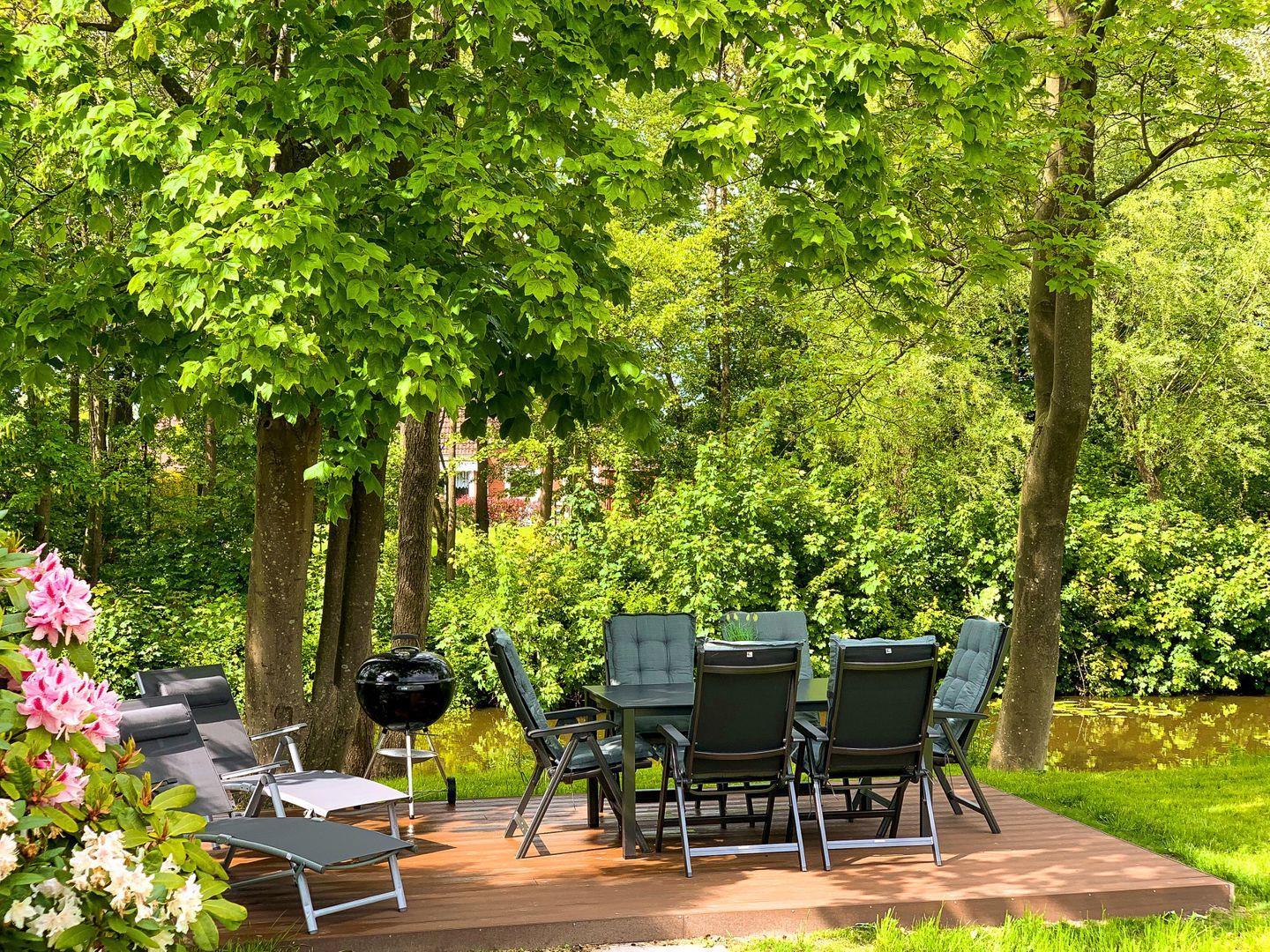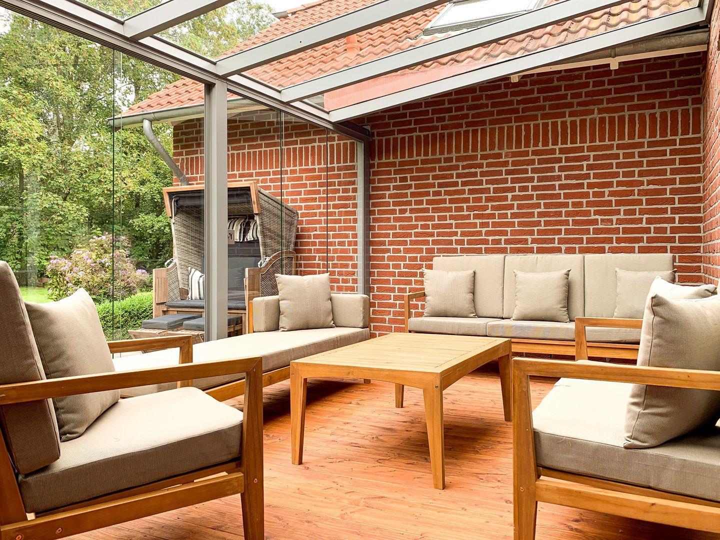 Direkt am Haus befindet sich zudem ein großer, vollverglaster Wintergarten mit Blick auf das Wasser und den alten Baumbestand. Auch wenn sich das Wetter einmal nicht von seiner besten Seite zeigt, kann man hier auf den gemütlichen Lounge-Möbeln die ostfriesische Natur genießen.