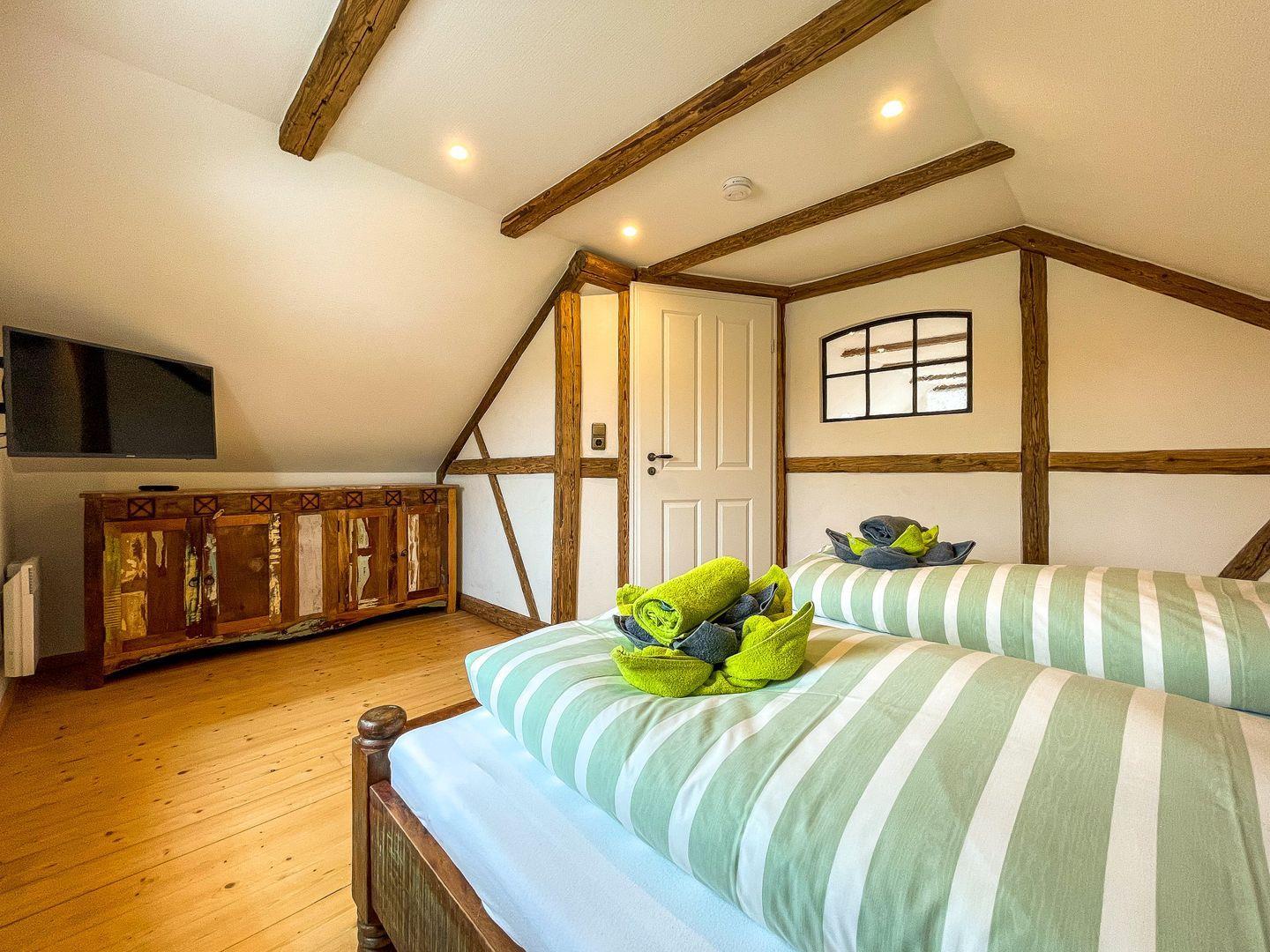 • 1 Schlafzimmer im Obergeschoss (2,00 m Doppelbett) mit einem Smart-TV mit 32"