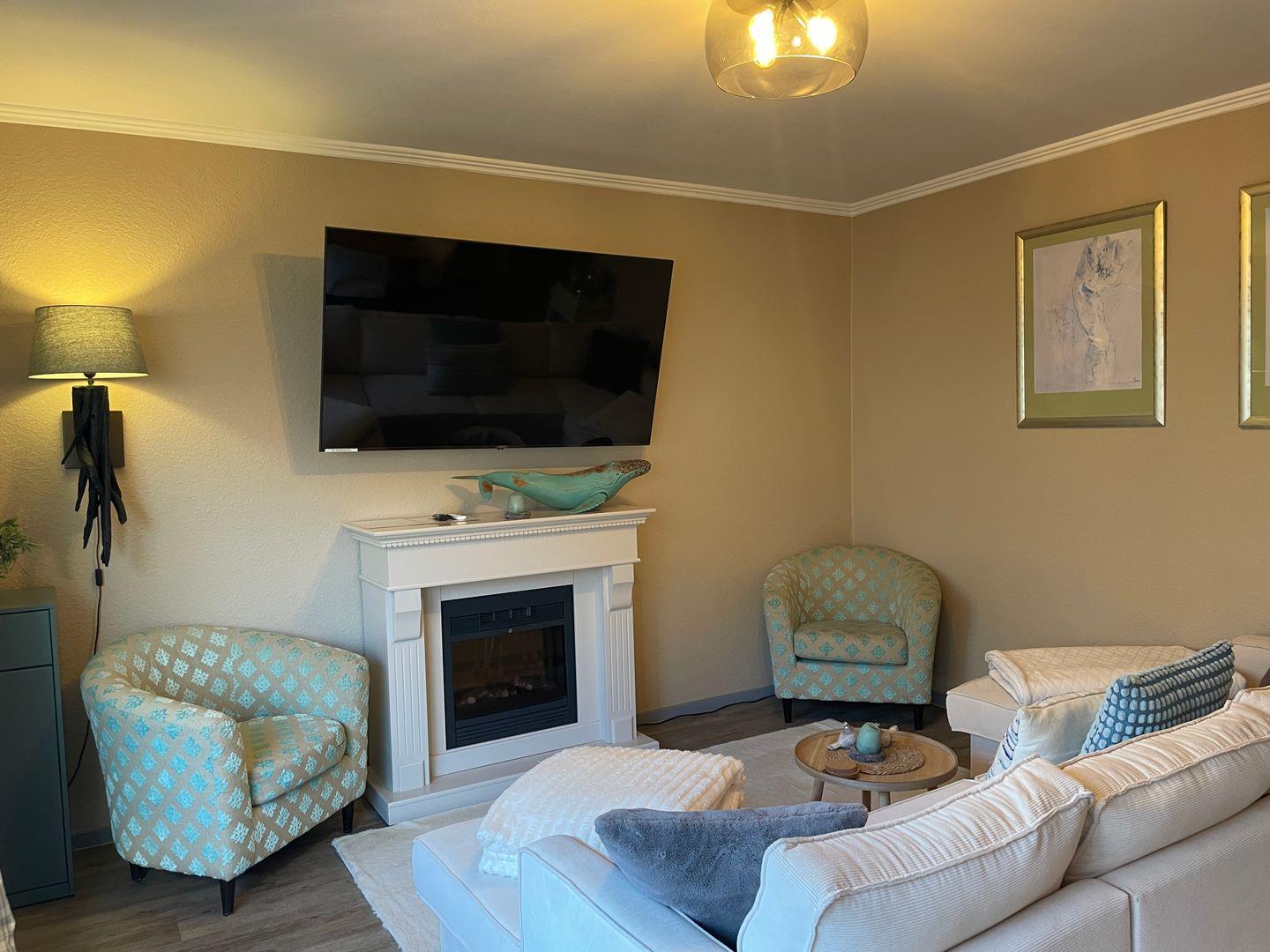 Vom Flur gelangen Sie direkt in den hellen Wohn- und Essbereich. Eine gemütliche Couch lädt zu entspannten Stunden ein, während der große Flatscreen-Fernseher für unterhaltsame Abende sorgt. Der angrenzende Essbereich bietet ausreichend Platz für gemeinsame Mahlzeiten, Spieleabende oder Klönabende. Die liebevolle Dekoration verleiht dem Raum eine besonders heimelige Atmosphäre.