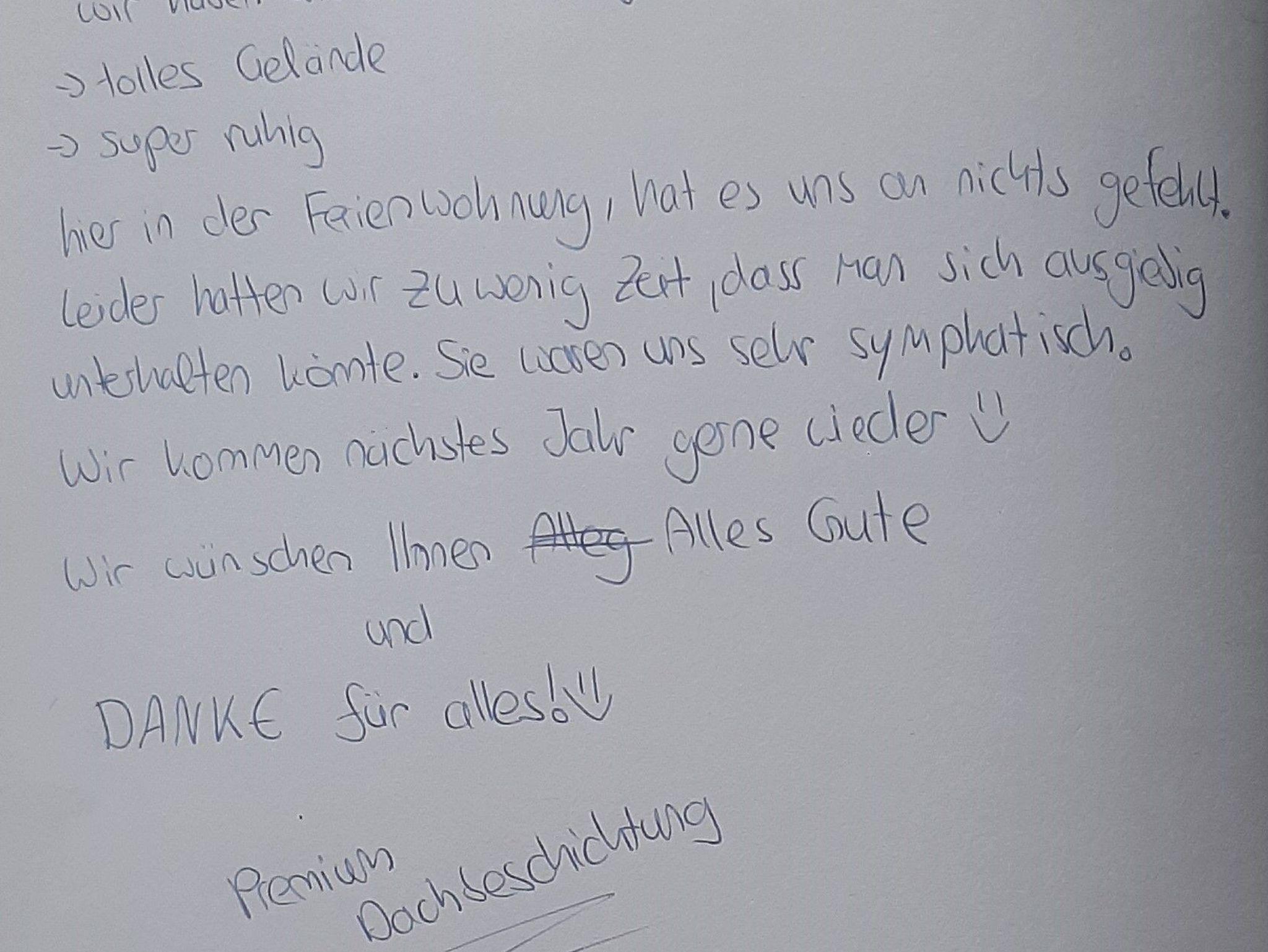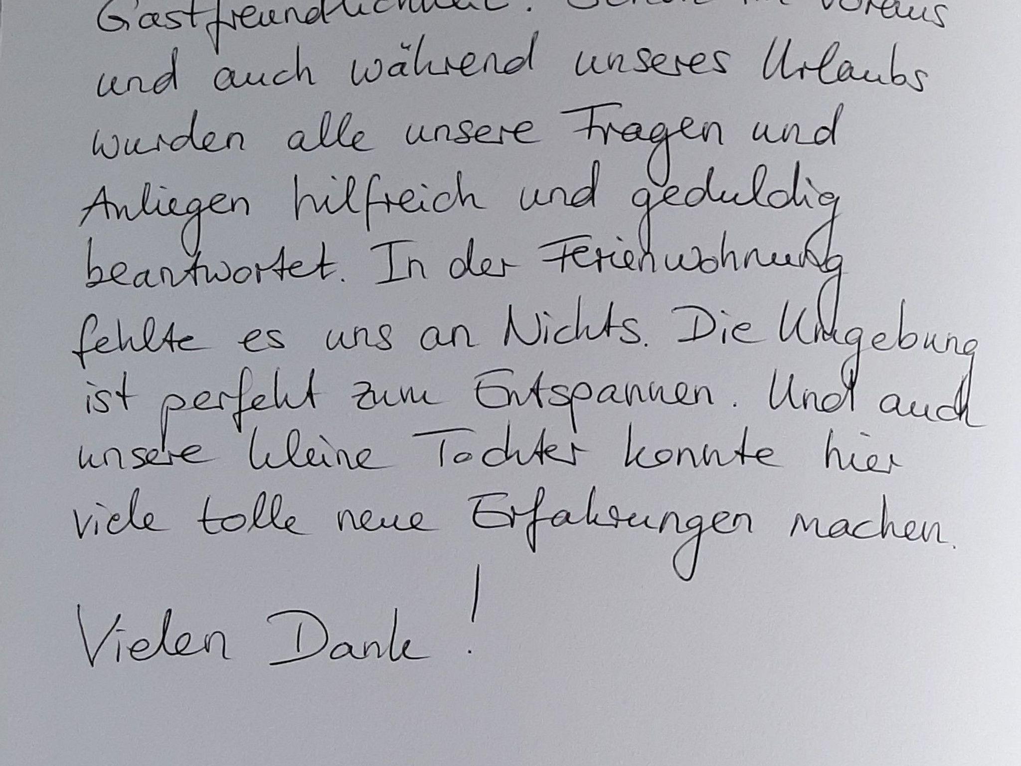 Einrichtung: Küche neu und vollständig ausgestattet; Wohnzimmer ca. 30 qm mit hellen Schränken, schwarze Sitz-Eckgarnitur, Lesecke mit 2 Ohrensesseln und kleinem Kaminofen ( Feuerholz kostenlos ); 1 Schlafzimmer für 2 Personen mit neuen Möbeln, französisches Bett 1,40 x 2 m; 1 Schlafzimmer mit neuen Möbeln für 1 Person, auf Wunsch zzgl. Kinder-Reisebett ( bis 2 Jahre ); Badezimmer mit Dusche, kleiner Flur mit geräumigen Vorbau. Terasse mit Gartenmöbeln und Blick in den großen Garten.