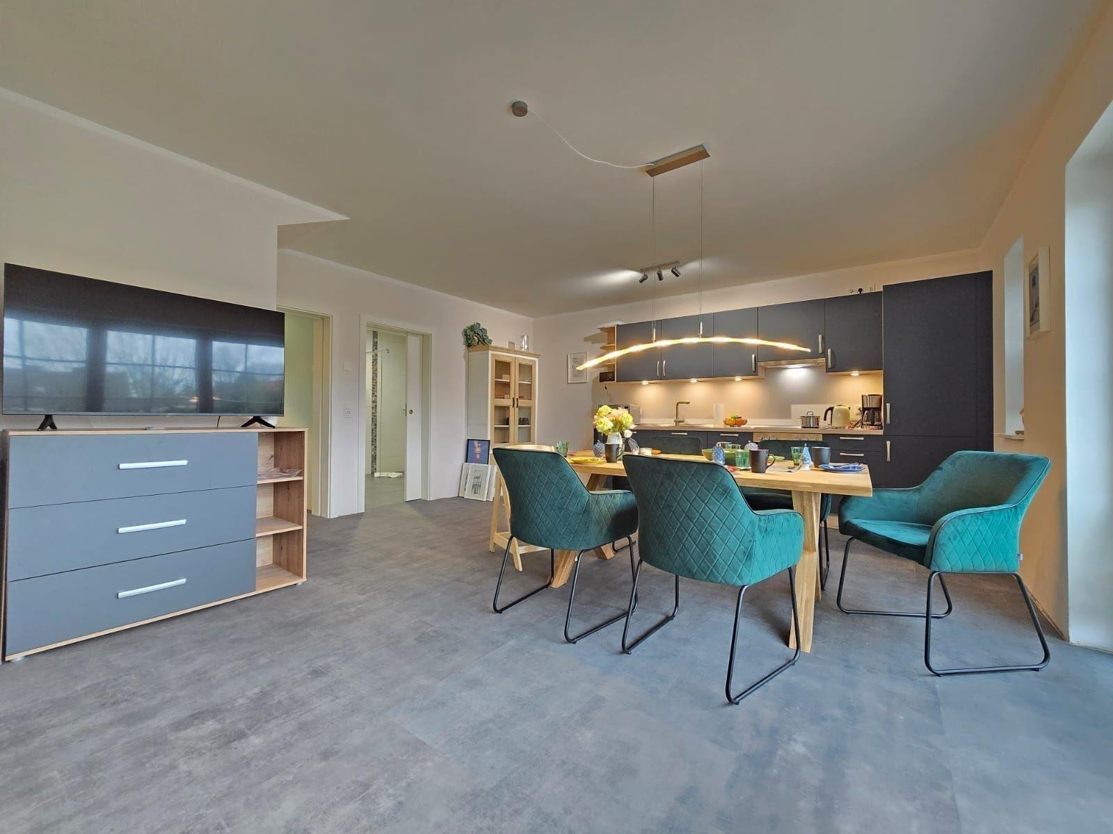 Die Ferienwohnung bietet großzügigen Raum und moderne Ausstattung für einen komfortablen Aufenthalt. Sie verfügt über drei Schlafzimmer, darunter ein Doppelbett und vier Einzelbetten, die ideal für Familien und Gruppen geeignet sind. Die offene Küche ist voll ausgestattet mit Geschirrspüler, Elektro-/Gasherd, Backofen und Kühlschrank, was das Zubereiten von Mahlzeiten zum Vergnügen macht. Für gemütliche Abende stehen eine HiFi-Anlage und ein DVD-/Blu Ray-Player zur Verfügung.
