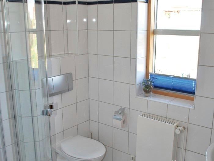 Am Wohnzimmer befindet sich ein geräumiger Abstellraum mit Waschmaschine und viel Stauraum. Ein halber Treppenabsatz nach oben führt Sie zum Duschbad und direkt anschließend zum Schlafzimmer. Die Fenster haben niedrige Brüstungen, sodass Sie bereits vom Bett aus den Blick über die Wiesen genießen können. Für Frühaufsteher steht hier auch ein gemütlicher Sessel bereit.