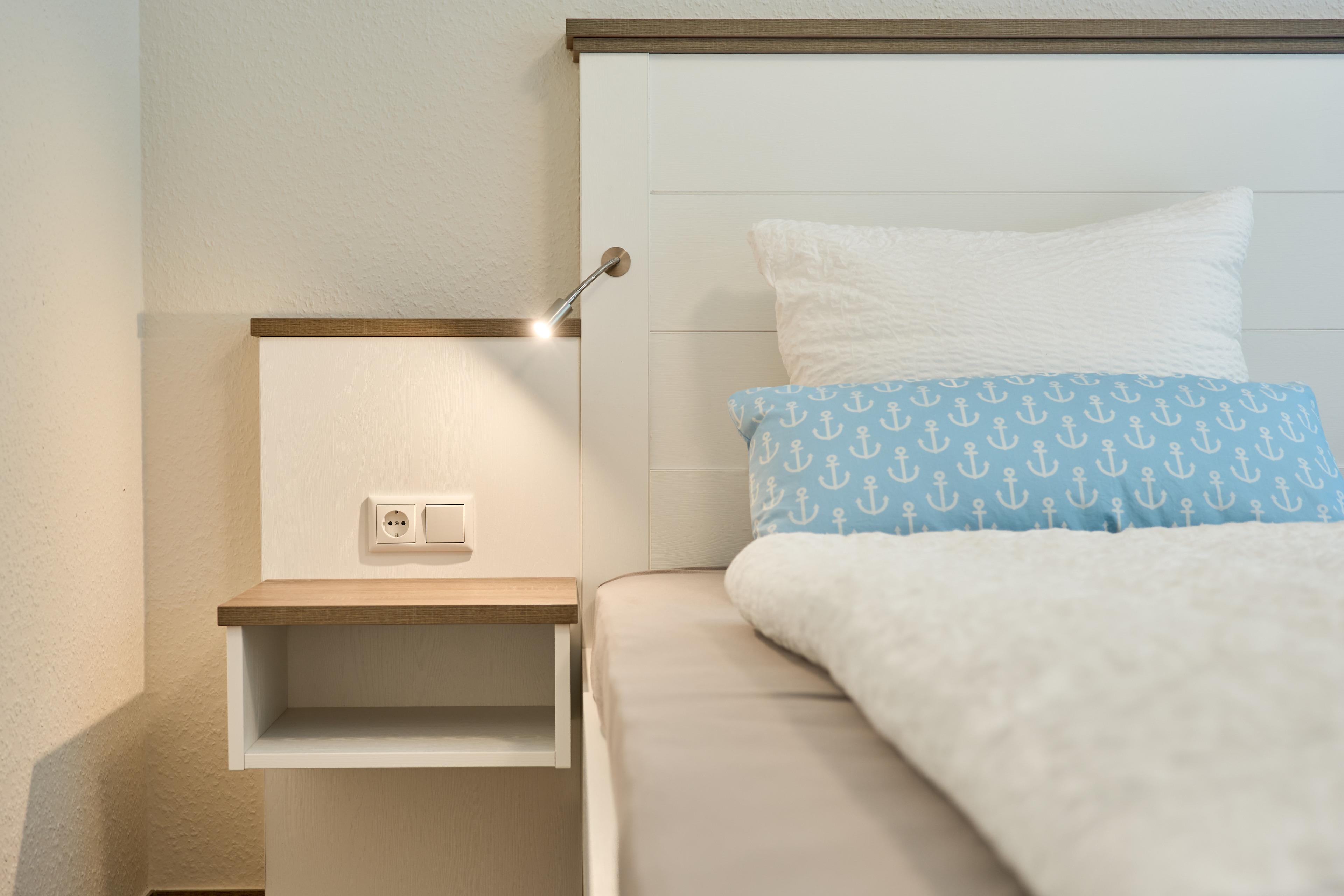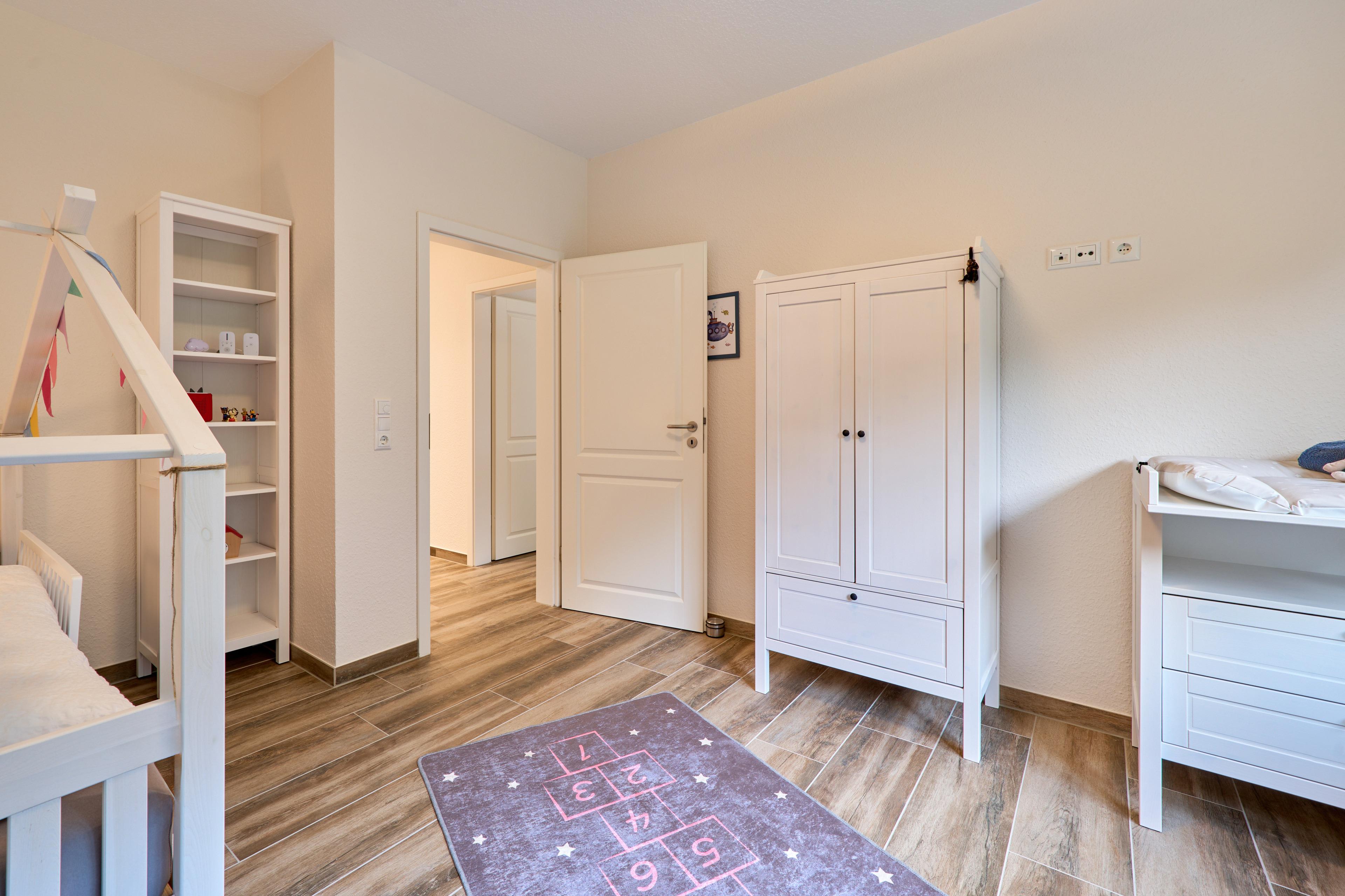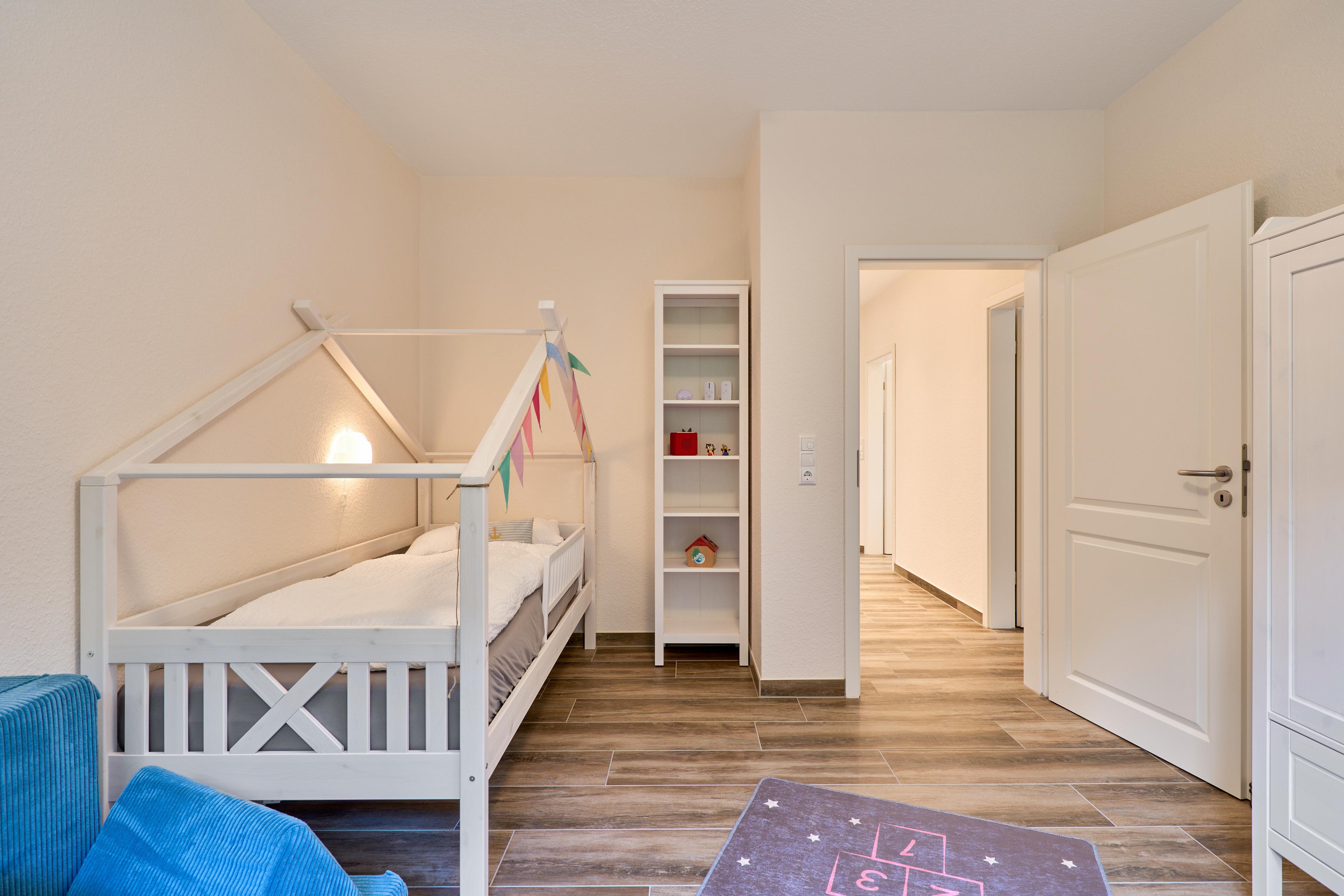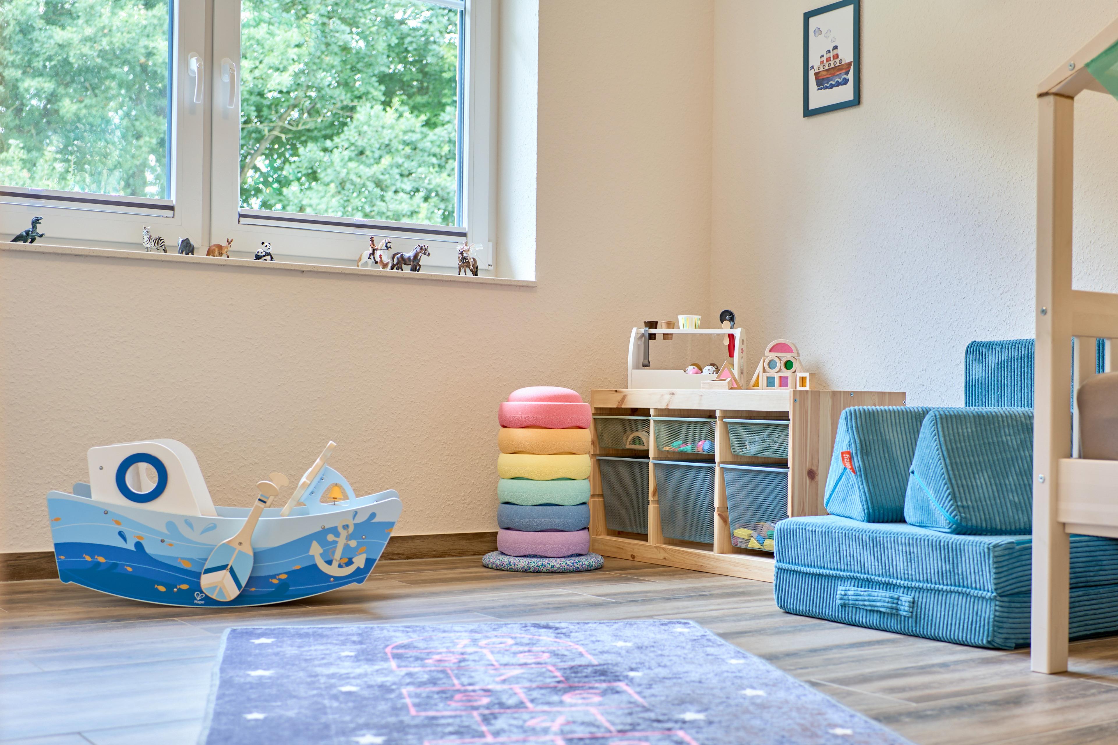 Dich erwartet in der Wohnung: Ein Schlafzimmer mit Familienbett (240x200), ein Kinderzimmer mit zwei Einzelbetten (90x200) und ein Kinderzimmer mit Kinderbett (90x200), Wickelkommode, hochwertiges Spielzeug, sehr gut ausgestattete Küche, Badezimmer mit Wellnessdusche & Badewanne, großer, eingezäunter Garten mit überdachter Terrasse.