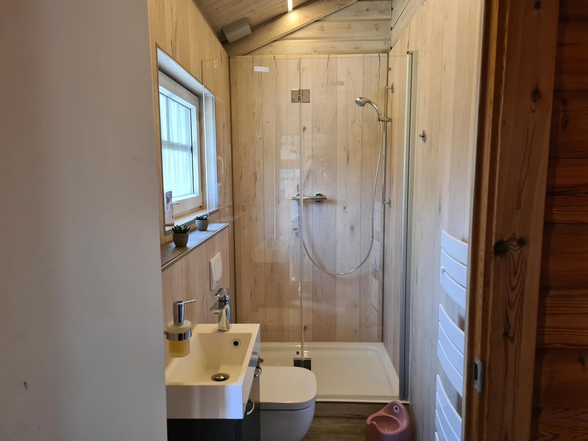 Das Duschbad mit Fenster bietet alle nötigen Annehmlichkeiten. Die Dusche wird von einer festen Kabine umschlossen. Spiegel, WC und Waschbecken sind ebenfalls vorhanden.