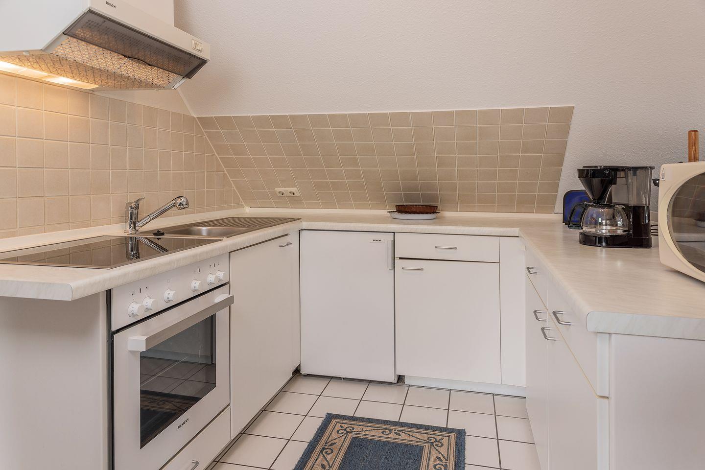 Ein offener Wohnbereich mit Sat-TV, Sitzecke, offenem Küchenbereich mit Herd/Backofen, Mikrowelle, schließt sich an das Schlafzimmer mit Doppelbett an. Das Bad hat neben Dusche und WC auch eine Waschmaschine.