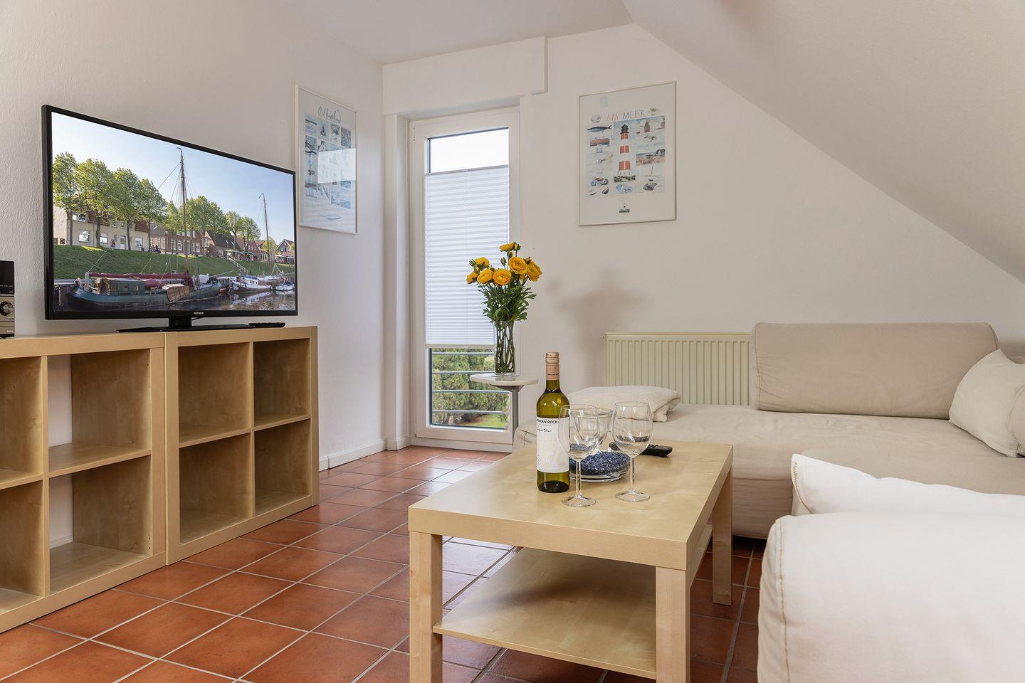 Gemütliche Obergeschosswohnung in Harlesiel mit Garten, WLAN und Fahrradverleih, ideal für Familien und Haustierfreunde.