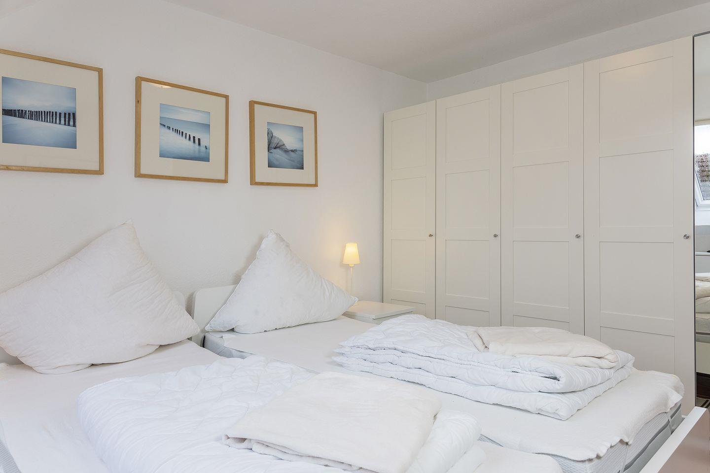 Schlafzimmer mit Doppelbett und zustellbarem Kinderreisebett