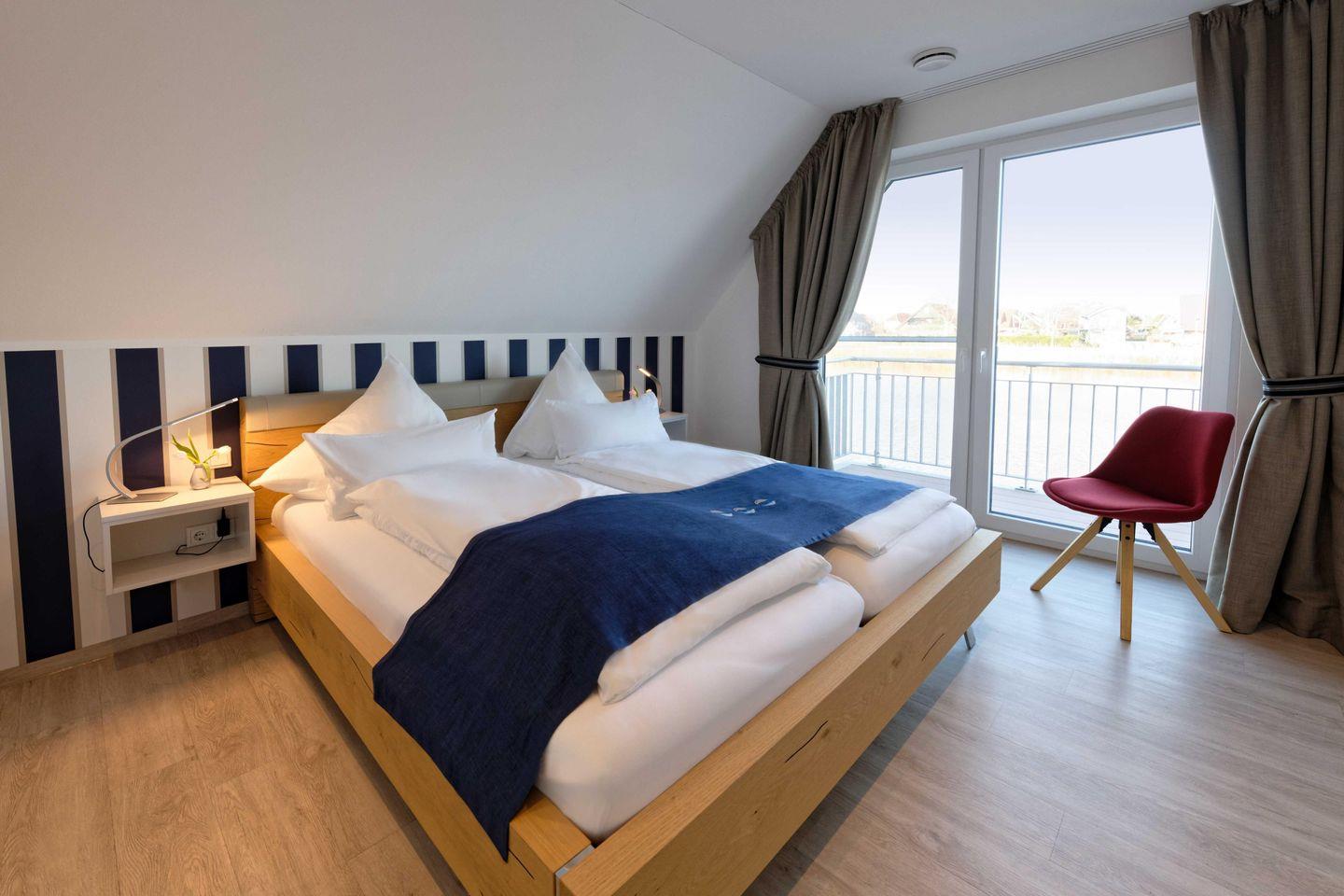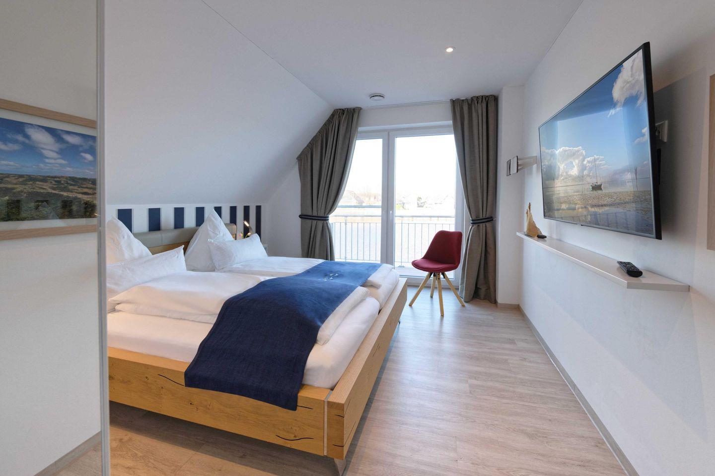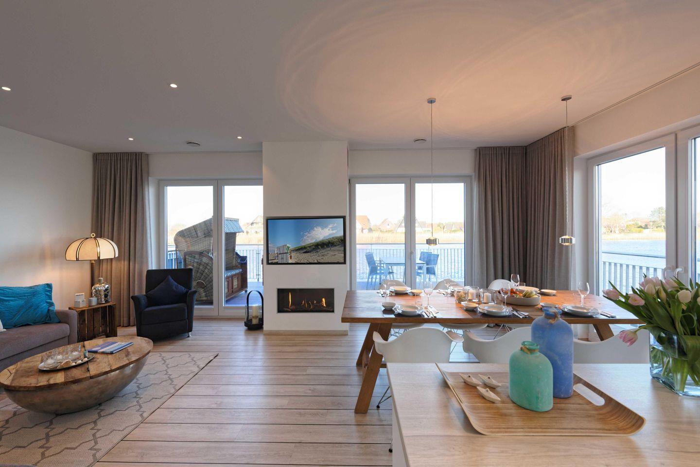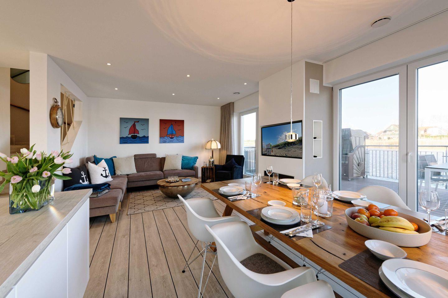 Die moderne Küche ist großzügig in den Wohn- und Essbereich integriert und hochwertig ausgestattet. Ebenso stehen mehrere Flachbildfernseher, eine Bose Musikanlage und kostenloses WLAN zur Verfügung. Das Internet und die Fernseher sind Netflix tauglich. Es bietet Komfort und Platz für bis zu 4 Personen. Es verfügt über zwei Schlafzimmer mit direktem Zugang zum Balkon, zwei Badezimmer, genügend Platz und viele weitere Annehmlichkeiten. Auf der 25 m² großen Plattform stehen 2 Strandkörbe zur Verfügung. Der zugehörige Parkplatz mit einer Ladestation für Elektroautos wird über eine Privatstraße befahren.
