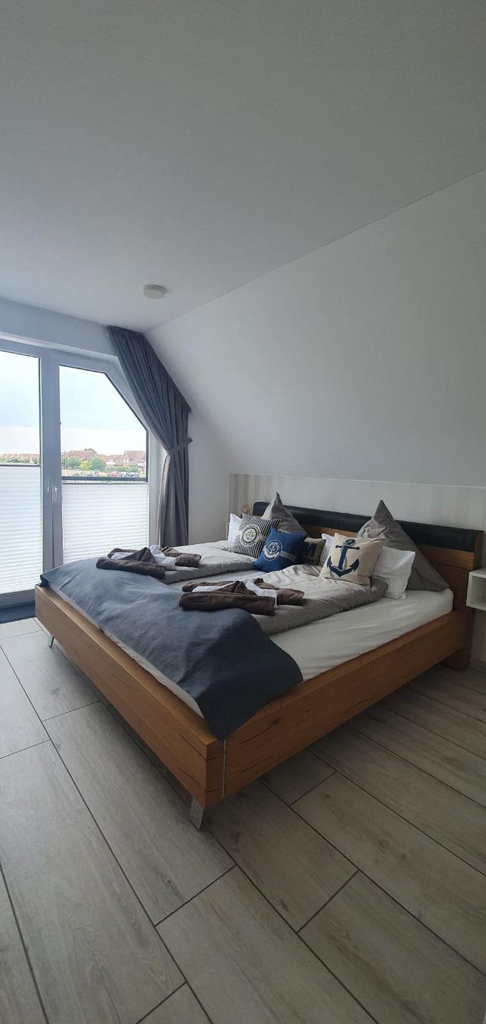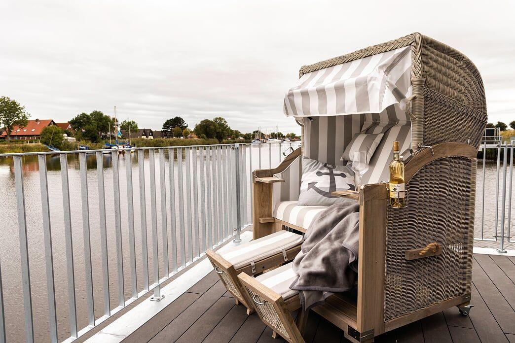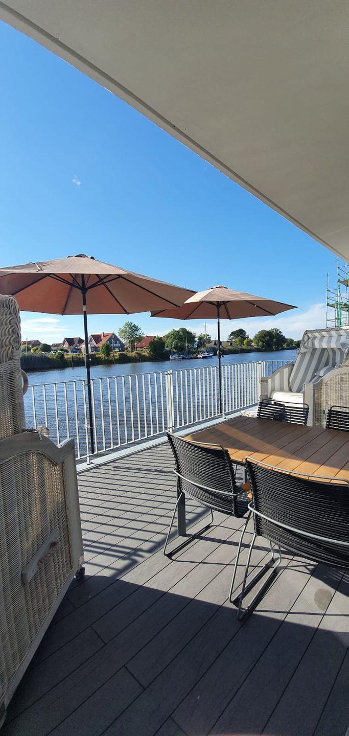 Das Obergeschoss verfügt über 2 Schlafzimmer mit komfortablen Betten (200 x 200 cm), viel Stauraum für Ihre Garderobe, sowie jeweils Smart-TV. Von hier aus haben Sie direkten Zugang zum bestuhlten Balkon zur Wasserseite.