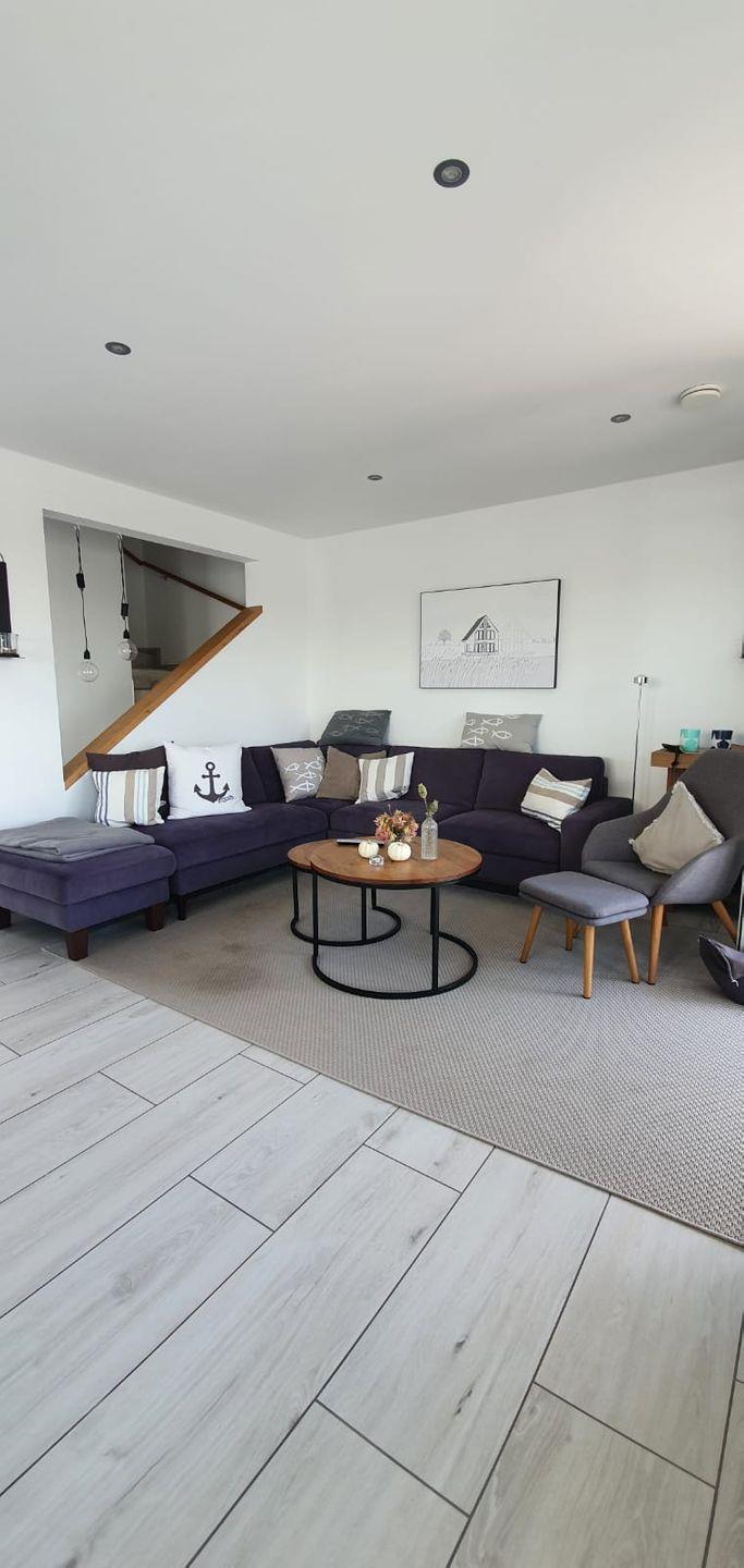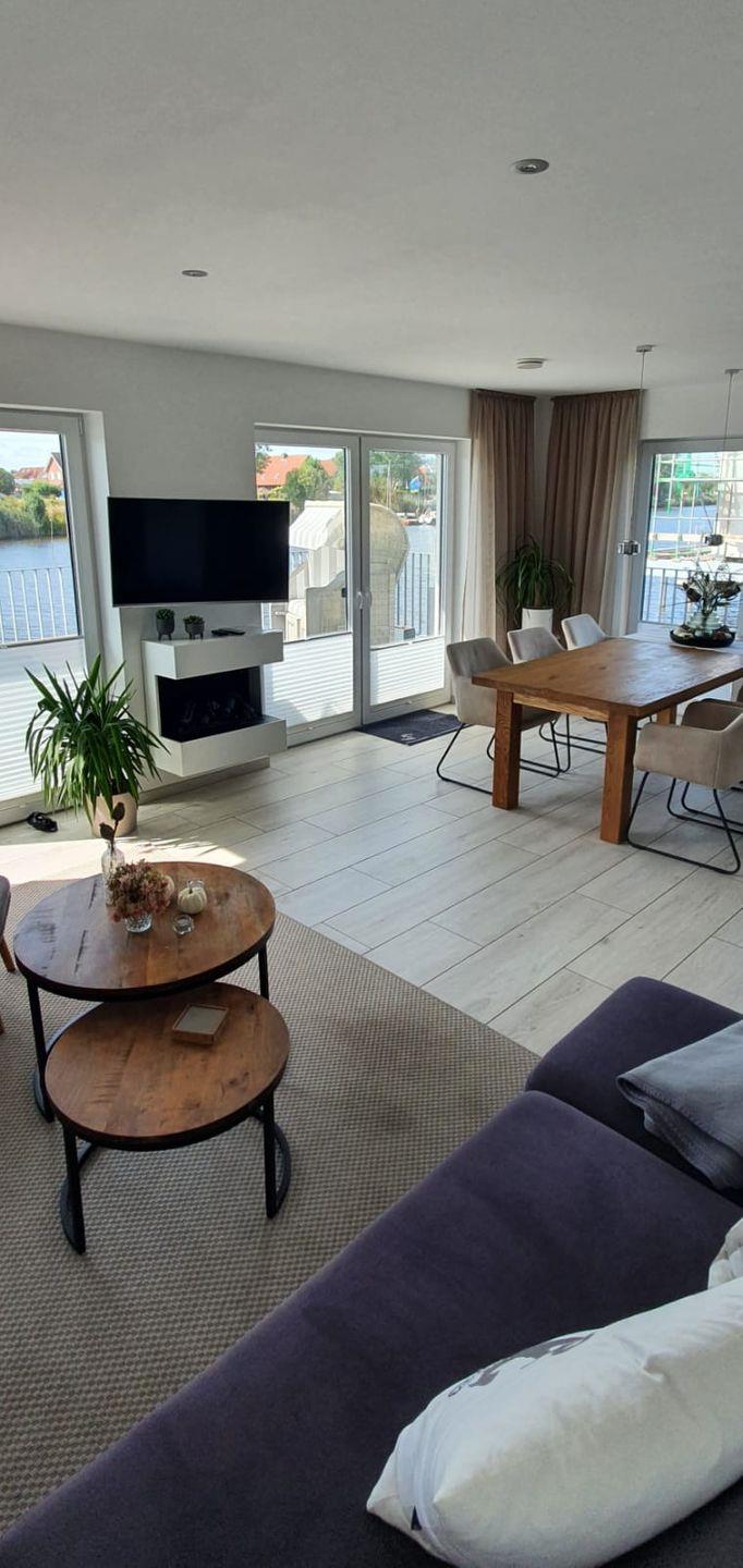 Der helle, offene Wohn-/Essbereich im Untergeschoss ist geräumig und modern eingerichtet. Von hier aus gelangen Sie unmittelbar auf die 25qm große Terrasse, wo Ihnen Gartenmöbel, Sonnenschirm und 2 Strandkörbe (ca. April – September) zur Verfügung stehen. Über den eigenen Wasserzugang können Sie die 2 zur Verfügung stehenden Stand-Up-Paddleboards und das Ruderboot bequem nutzen.