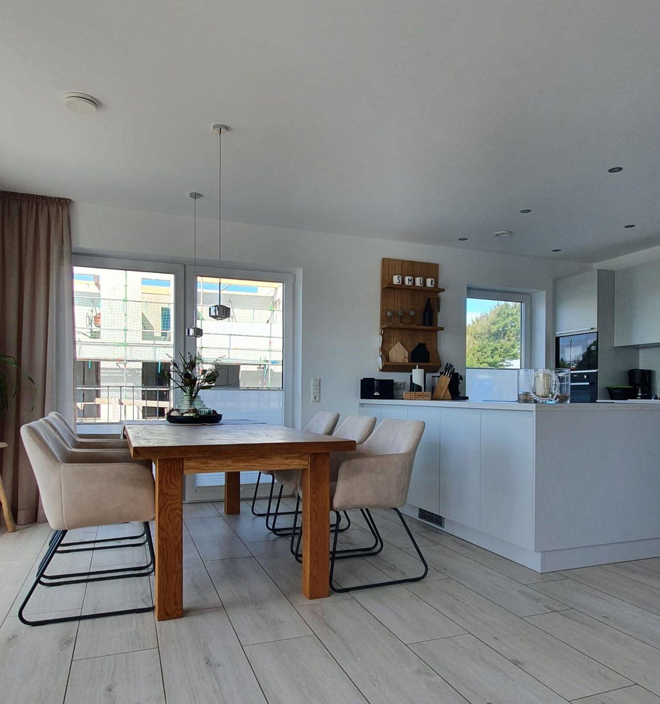 Die offene Küche ist hochwertig und mit modernsten Geräten ausgestattet. Ebenso befindet sich im Erdgeschoss ein modernes Bad mit bodengleicher Dusche und der Hauswirtschaftsraum.