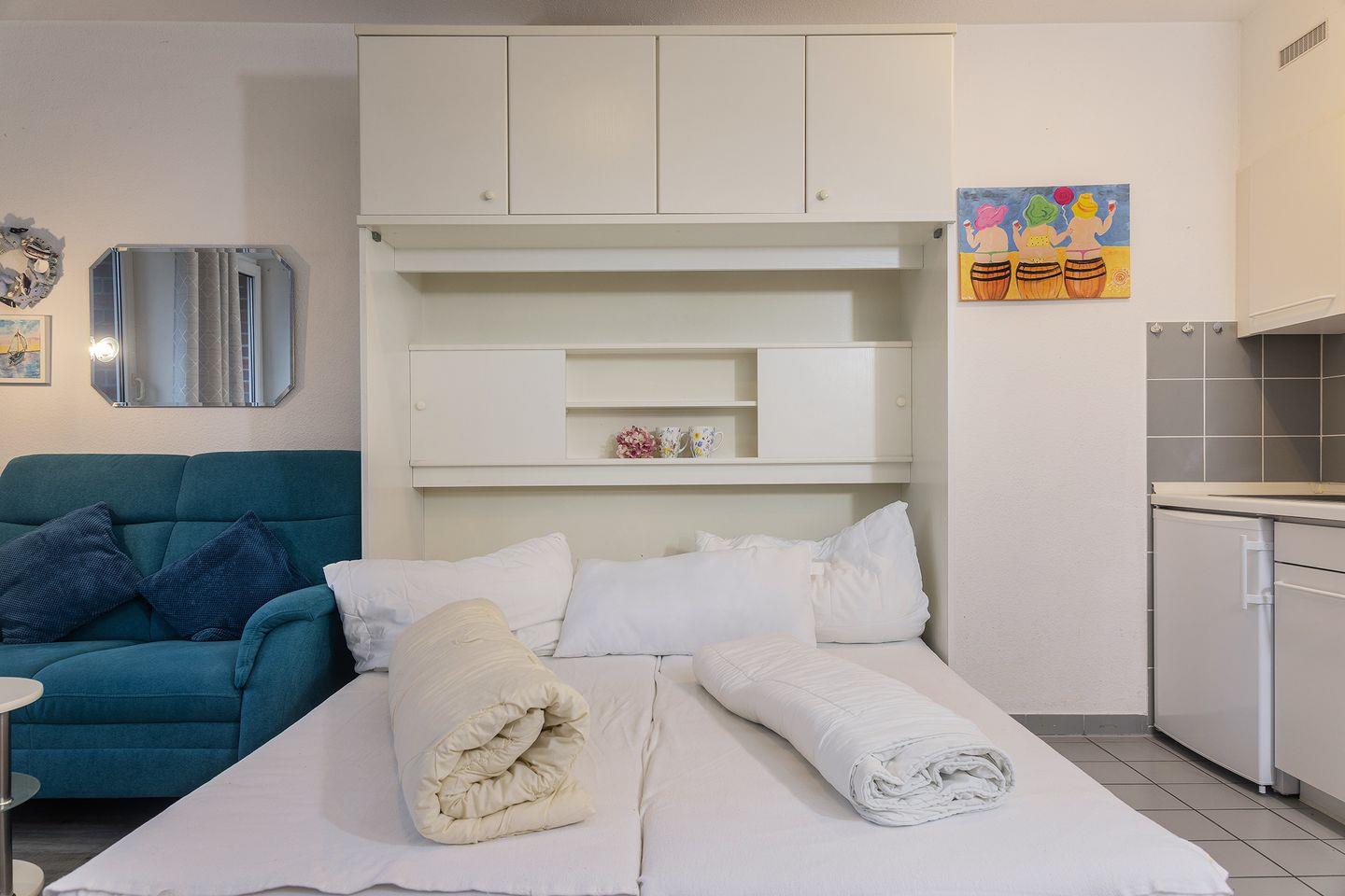 Wohnzimmer mit Schrankbett (2 Matratzen 180x90cm), Essecke, Sat -TV, DVD-Player sowie Stereoanlage, Küchenzeile