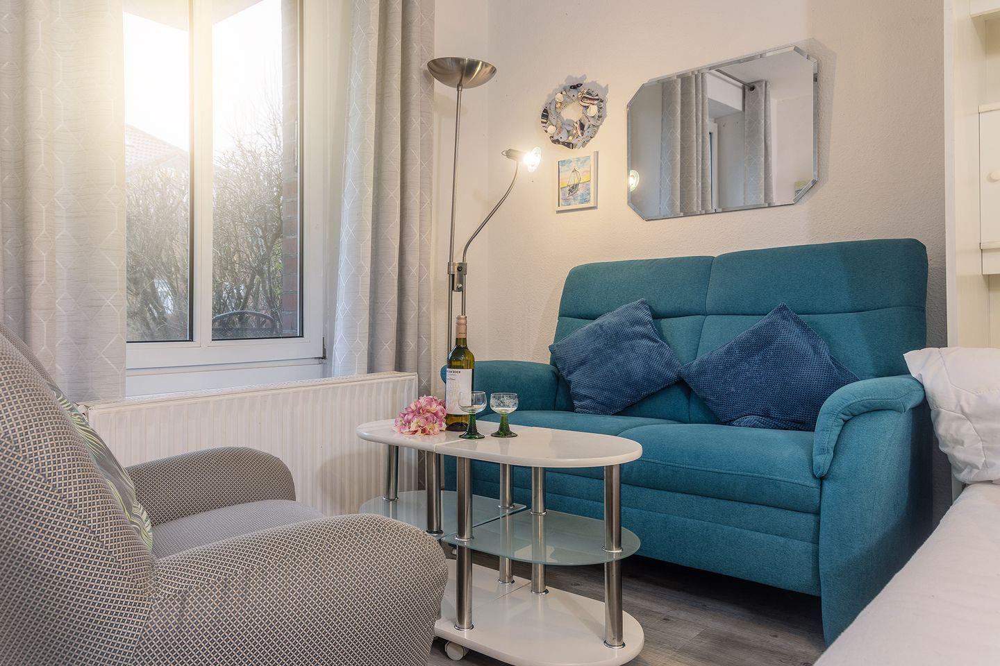 Strandnahe Kuschel-Koje: Die liebevoll eingerichtete Ferienwohnung bietet einen gemütlichen Wohnbereich und eine Terrasse im Grünen. Nur 300 m vom Strand entfernt!