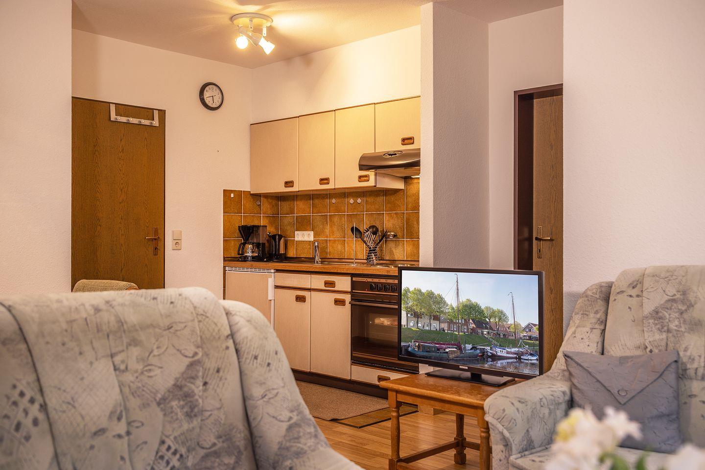 Wohnzimmer mit Essecke und Küchenzeile, Sat-TV sowie Stereoanlage