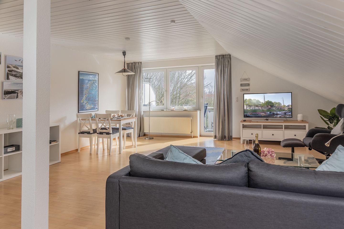 Diese geräumige Ferienwohnung verfügt über einen offenen und großen Wohn-/ Essbereich, eine gut ausgestattete Küche mit Backofen, Spülmaschine und Mikrowelle, ein geräumiges Bad mit Dusche, WC und Waschmaschine.