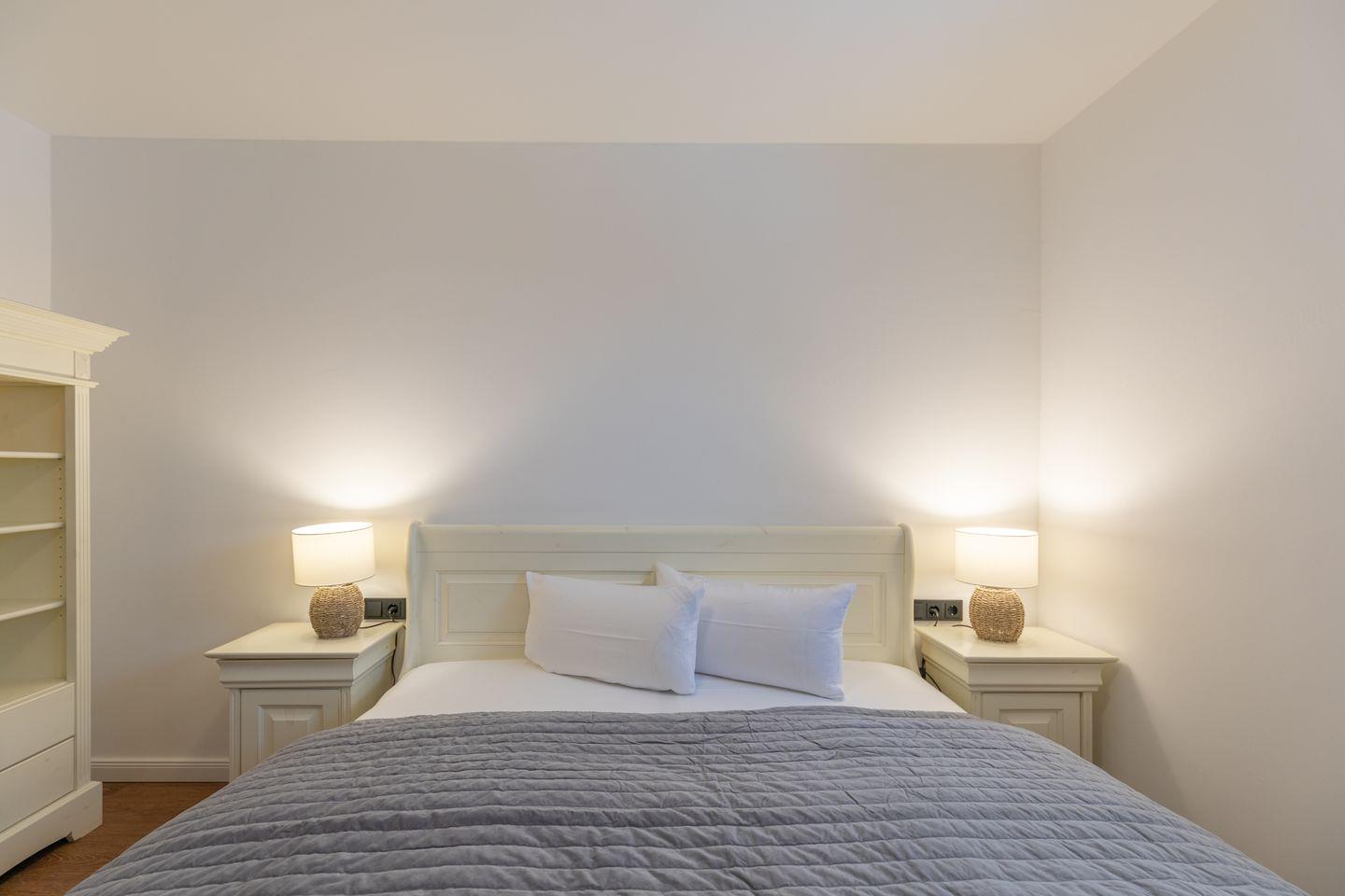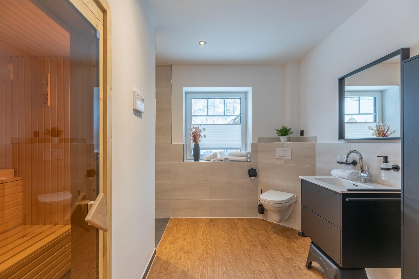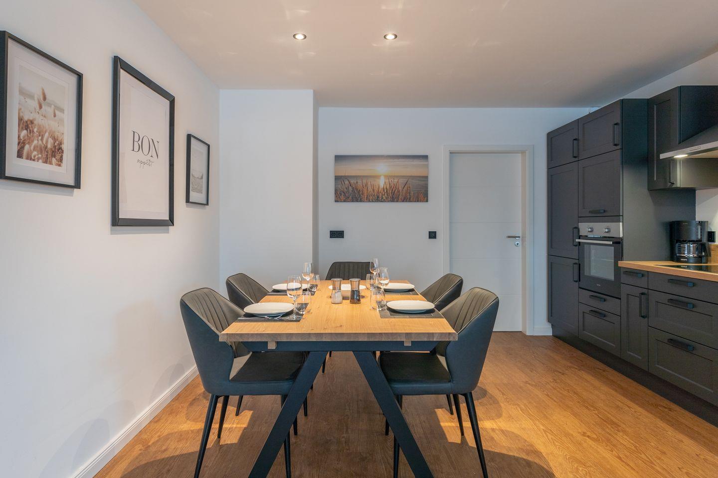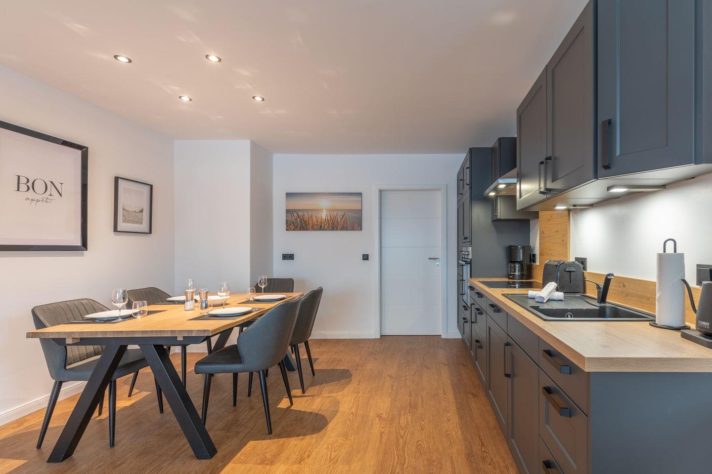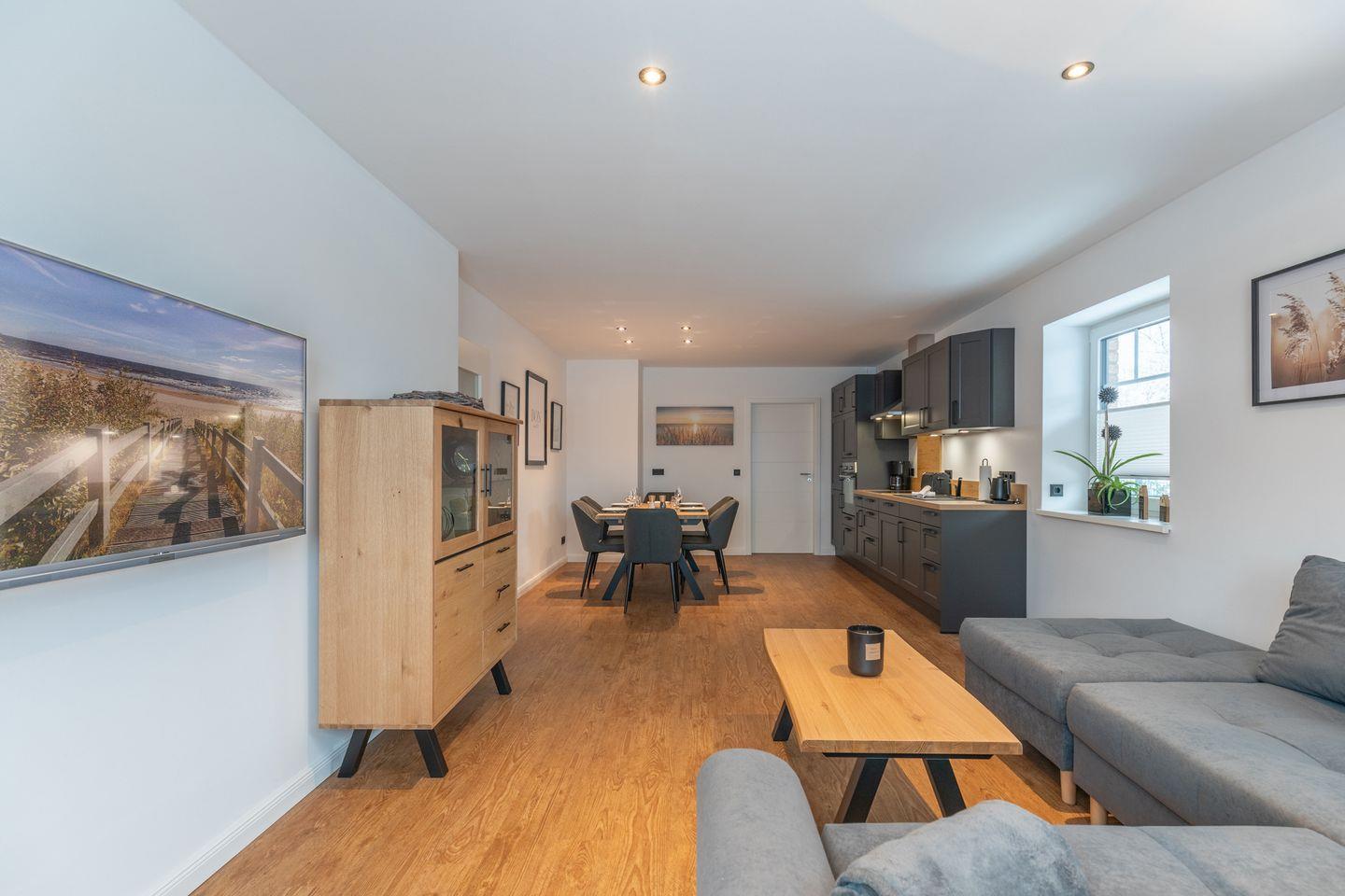 Die stilvoll und komfortabel eingerichtete Ferienwohnung ist gut 80 qm groß. Sie bietet ein geräumiges Wohnzimmer mit Flachbild-TV (SAT) und Sofaecke. Die offene Küche mit dem großen Esstisch ist mit einem Herd (Ceranfeld), Backofen, Geschirrspülmaschine und Kühlschrank, Toaster, Wasserkocher und Filterkaffeemaschine ausgestattet. In einem separaten Hauswirtschaftsraum stehen Ihnen Waschmaschine und Trockner zur Verfügung. Das Apartment verfügt über zwei Schlafzimmer (180 x 200 und 2x 90 x 200). Ein Hightlight ist das Duschbad mit Regendusche, Schwallbrause und Sauna.