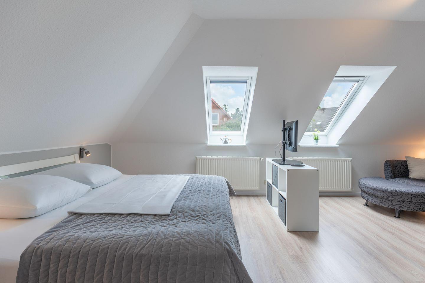 Das Schlafzimmer ist funktional gestaltet und bietet Platz für zwei Personen. Praktische Details wie eine Kommode, ein Ganzkörperspiegel und eine Garderobe schaffen zusätzlichen Stauraum. Die Unterkunft ist ein reines Nichtraucherobjekt und daher für Allergiker geeignet.