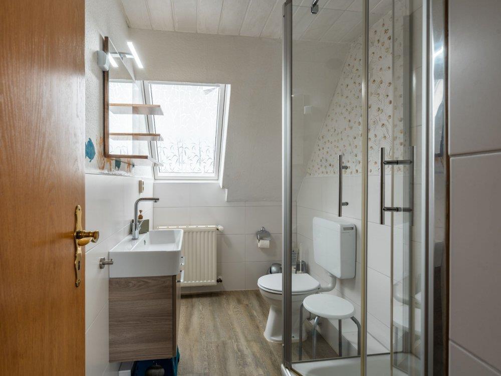 Badezimmer mit Fenster, Dusche, Waschbecken, WC, WC und Dusche