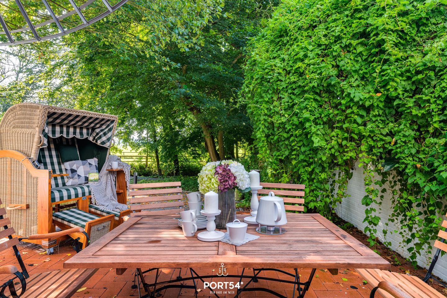 Zwei stilvolle Terrassen (Süd und Ost) mit hochwertigen Möbeln bieten den perfekten Ort, um die warmen Tage zu genießen. Ein Grill steht ebenfalls zur Verfügung. Im Strandkorb können Sie sich einfach mal zurück lehnen und die Ruhe genießen.