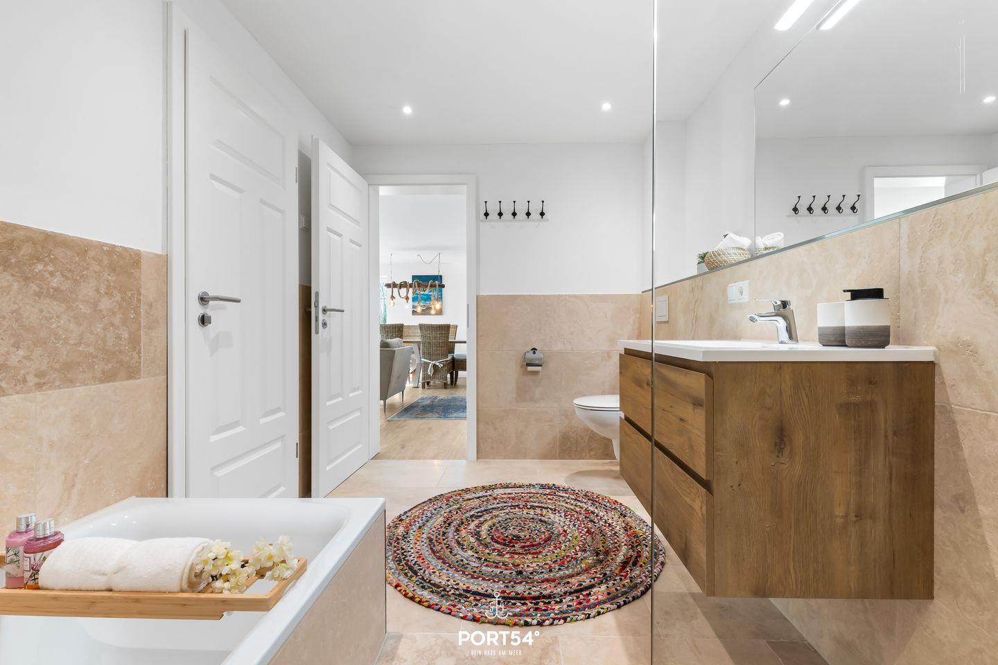 Mit 3 Schlafzimmern und einem modernen Wohnzimmer mit offener, voll ausgestatteter Küche bietet das Ferienhaus ausreichend Platz für bis zu 6 Personen. Die beiden Badezimmer sind komfortabel eingerichtet, eines davon mit einer Badewanne und beide mit offenen, bodentiefen Duschen für ein luxuriöses Badeerlebnis.