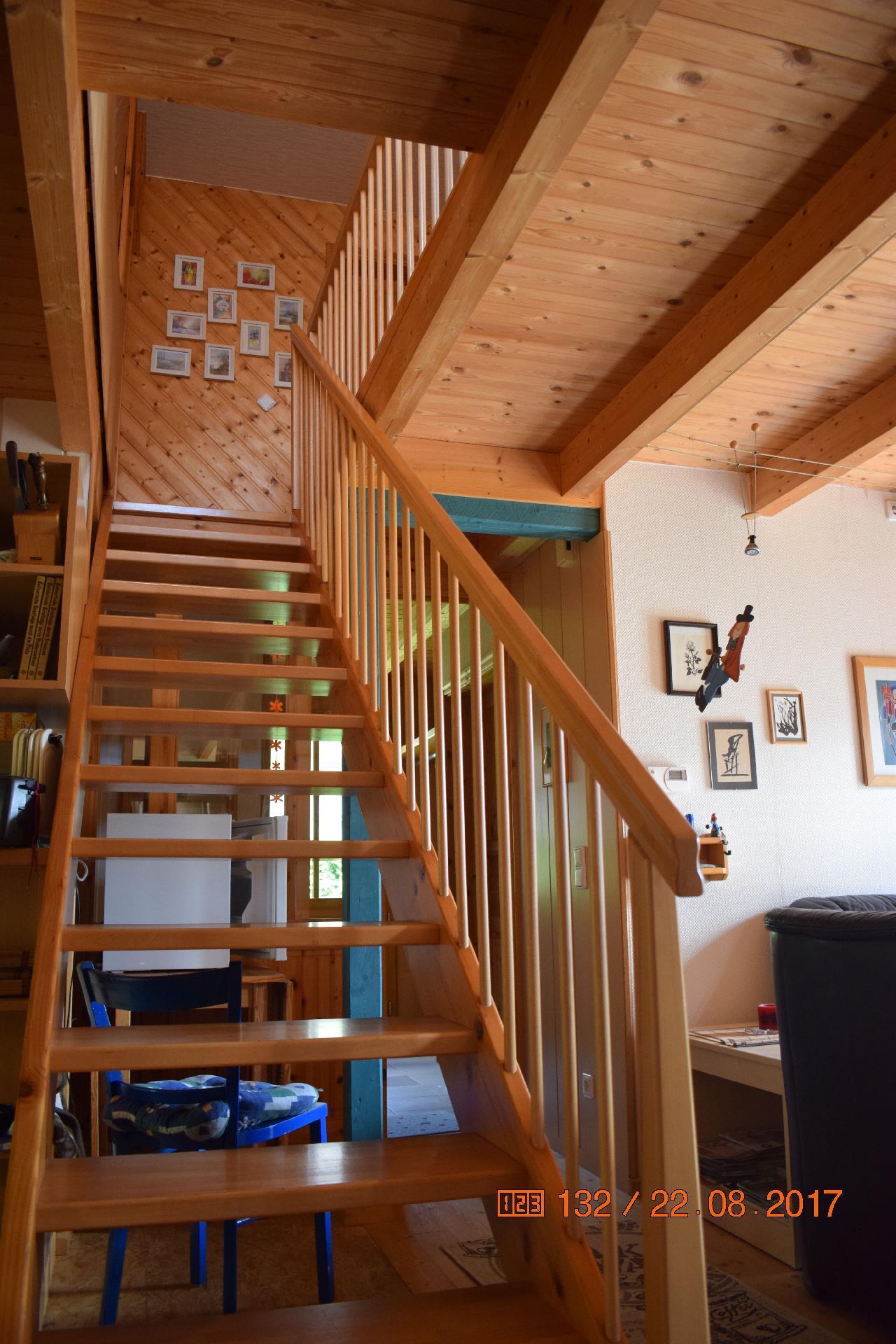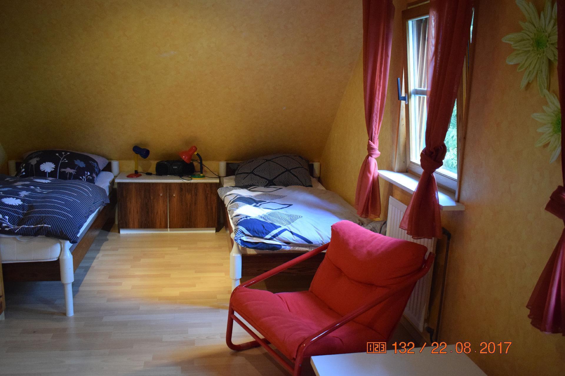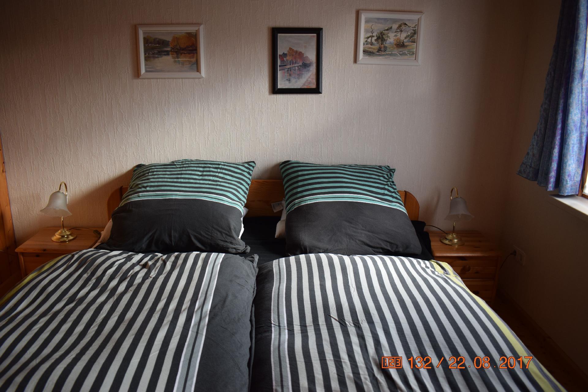 Es gibt 2 Etagen. In der unteren Etage befindet sich ein Schlafzimmer mit Doppelbett (1,80 m) und ein Badezimmer, sowie Küche und Wohnraum mit einer offenen Treppe zum Obergeschoss. In allen Räumen befindet sich eine Heizung (Gasheizung). Im Obergeschoss sind weitere 3 Zimmer und ein Badezimmer. 2 Schlafräume mit je einem Bett und zusätzlich mit einer Bettkastenliege (0,90 m) 1 Schlafraum mit 3 Einzelbetten (0,90 m).