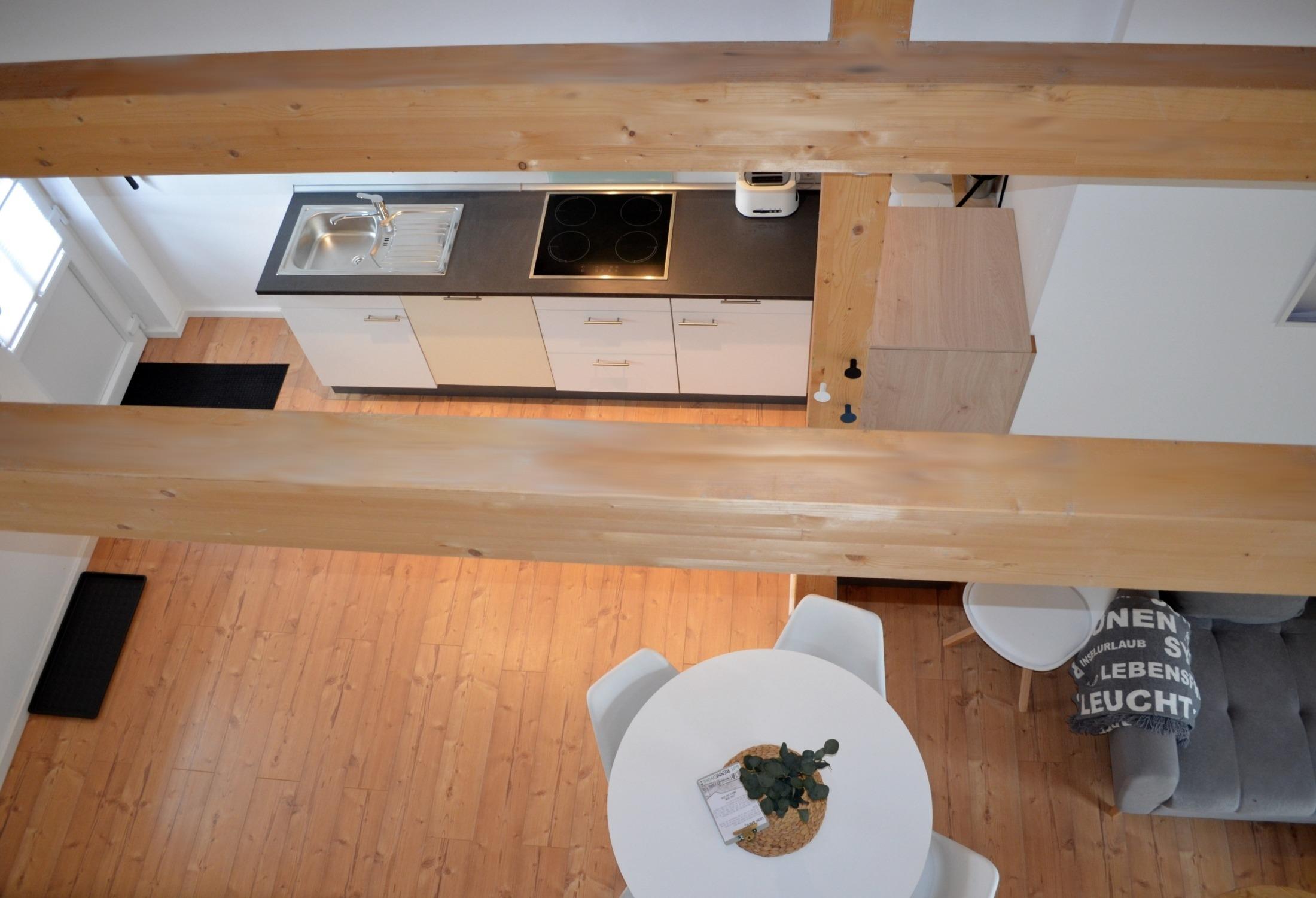 Der gemütliche Wohn- und Essbereich in dieser Ferienwohnung ist bis zur Dachspitze hin nach oben offen; die sichtbare Balkenlage macht es unheimlich wohnlich. Zwei Schlafzimmer bieten bis zu vier Personen einen gemütlichen Schlafplatz. Im ca. 12m² großen Badezimmer wird unter der ebenerdigen Rainshower-Dusche relaxt und entspannt.