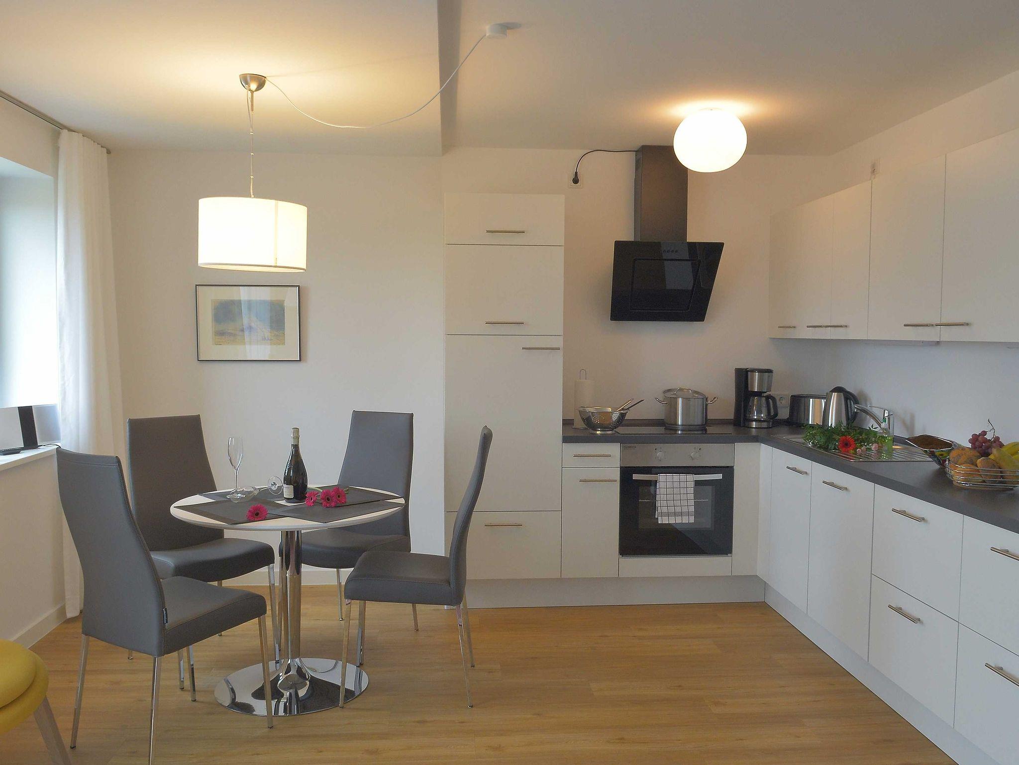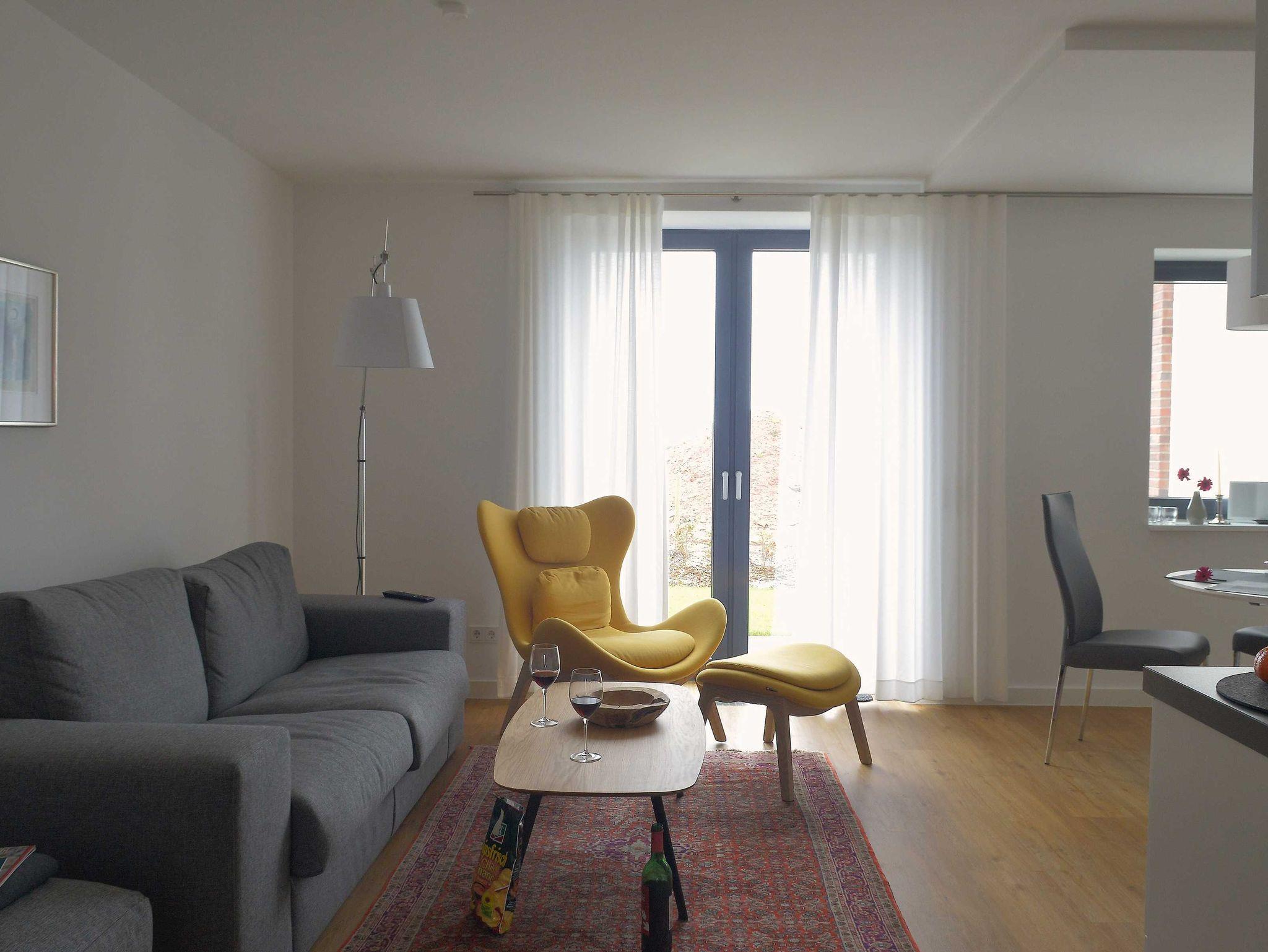 Die luxuriöse Wohnung hat ca. 55 qm Wohnfläche und befindet sich im Erdgeschoss. Der Wohnbereich mit offener, komplett ausgestatteter Küche und Essplatz hat einen Zugang zur Terrasse und einen unverbauten Blick auf die Nordsee und das grüne Oberland. Eine zweite Terrasse befindet sich auf der südlichen Sonnen-Seite der Wohnung.