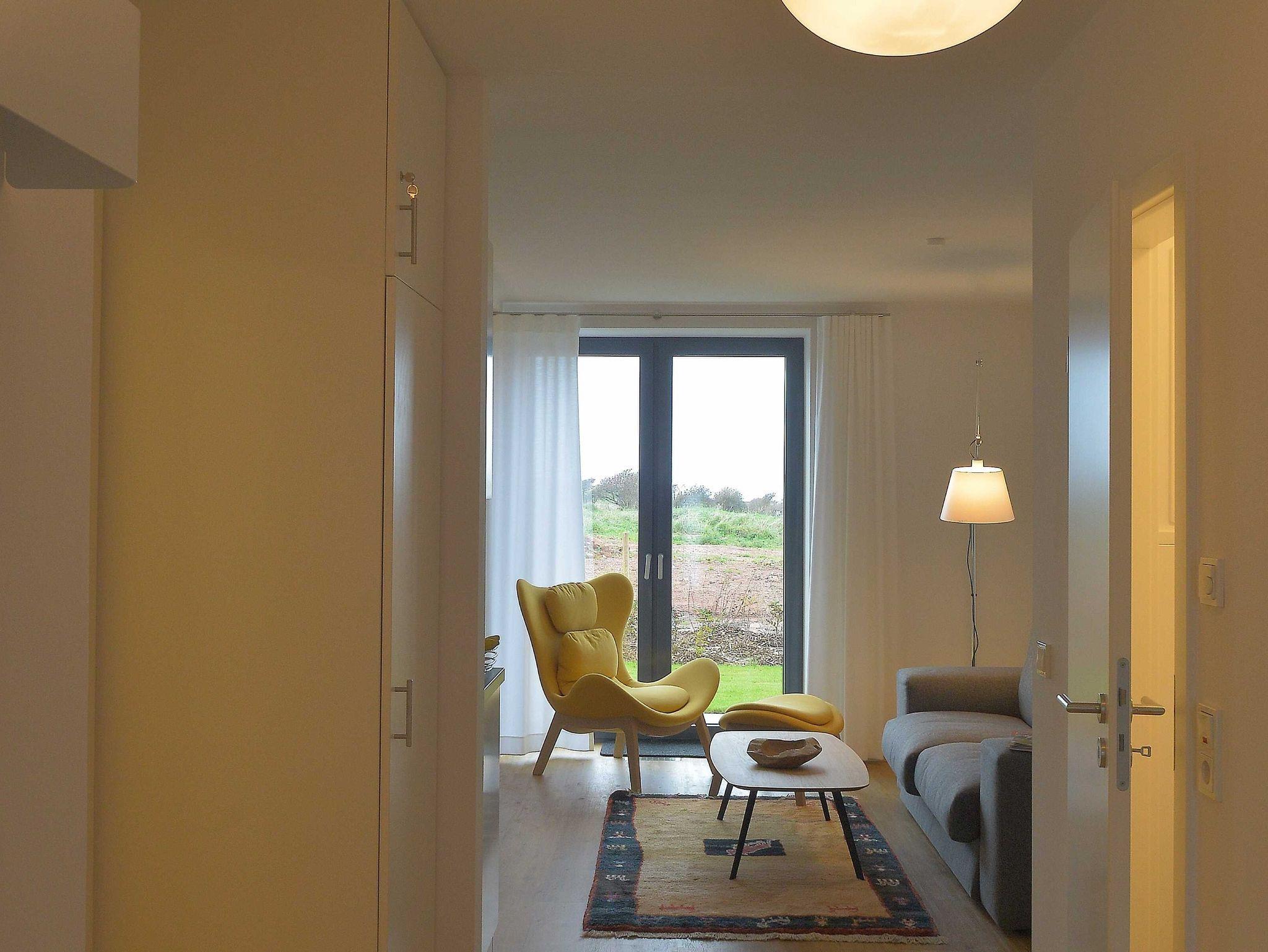 Die luxuriöse Wohnung hat ca. 55 qm Wohnfläche und befindet sich im Erdgeschoss. Der Wohnbereich mit offener, komplett ausgestatteter Küche und Essplatz hat einen Zugang zur Terrasse und einen unverbauten Blick auf die Nordsee und das grüne Oberland. Eine zweite Terrasse befindet sich auf der südlichen Sonnen-Seite der Wohnung.