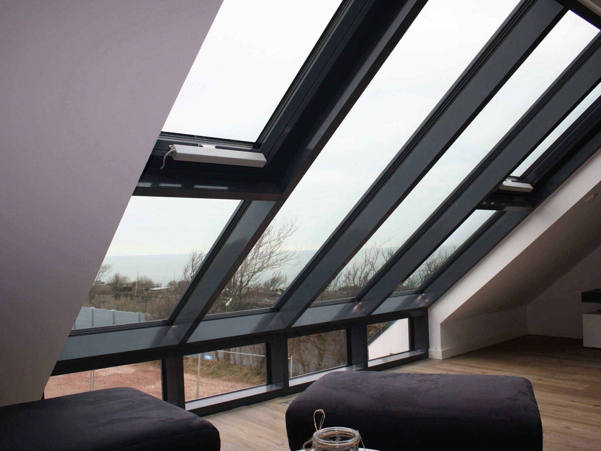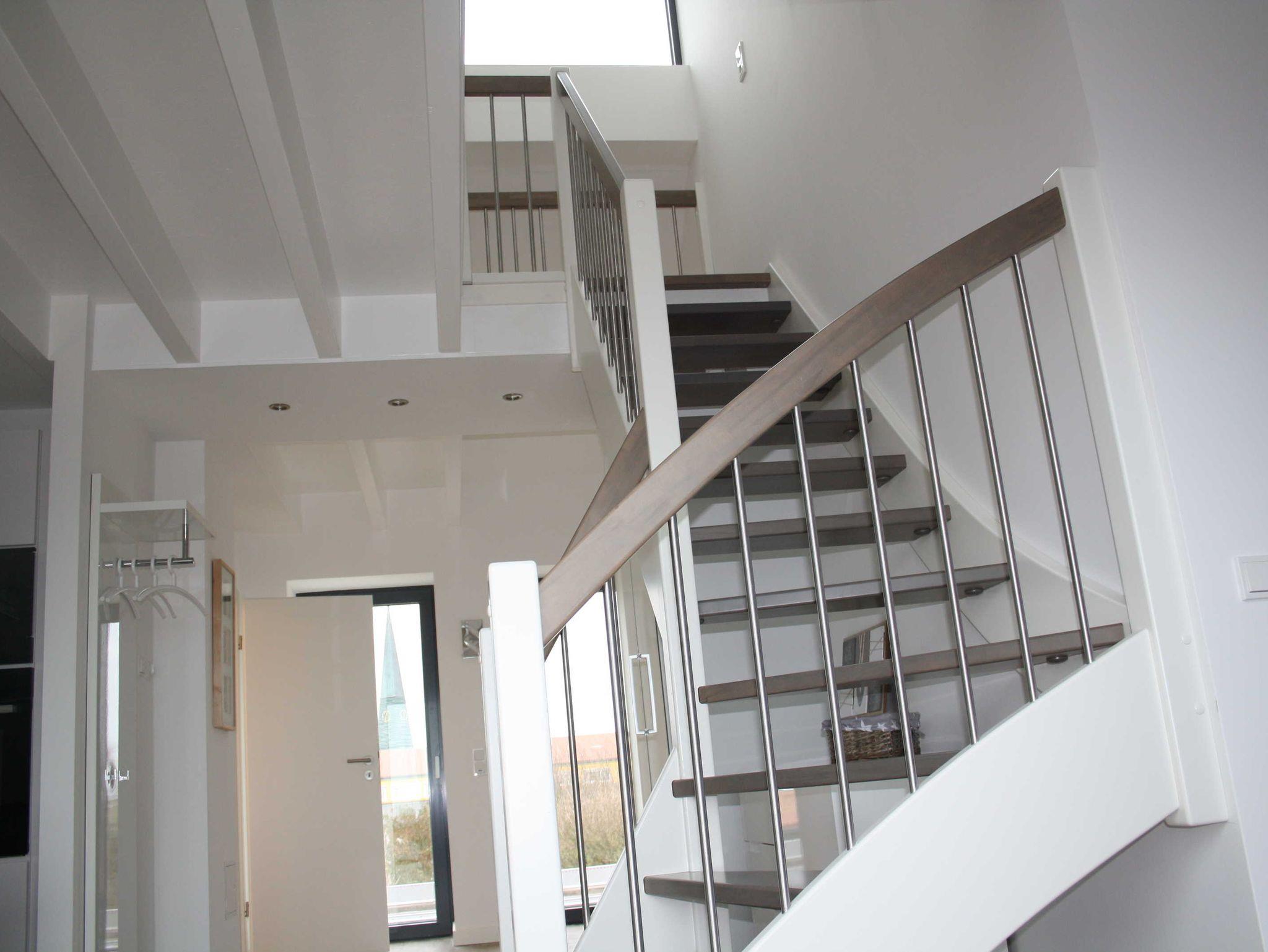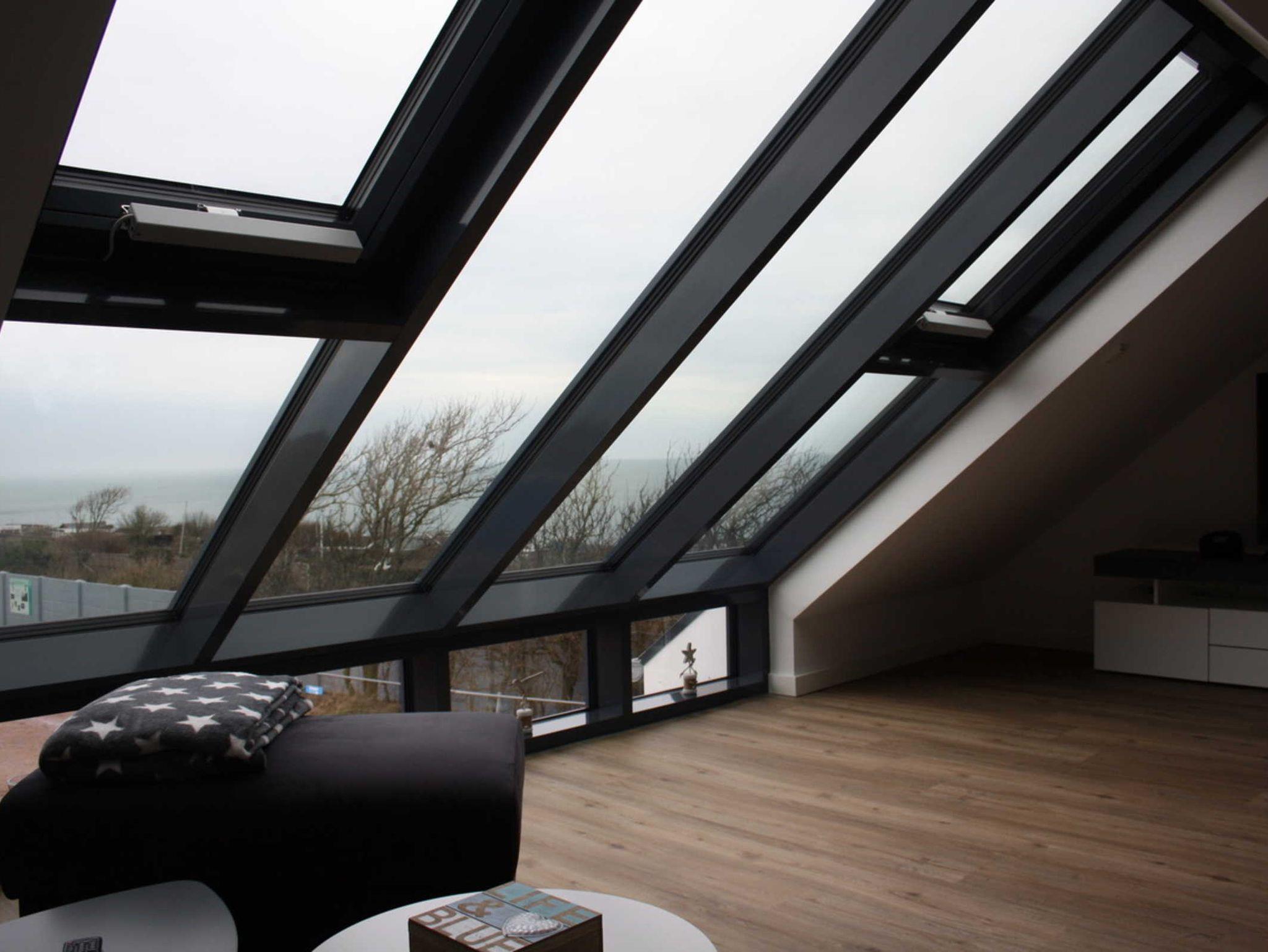 Sehr hochwertige Ausstattung. Schlafempore mit Blick auf die vorgelagerte Düne.