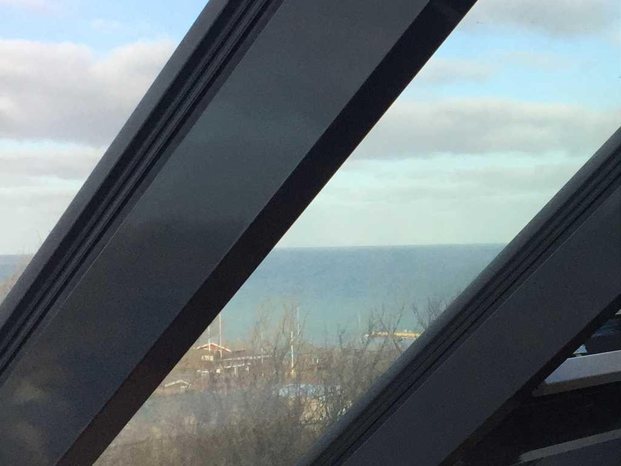 Schlafcouch mit hochwertigem Lattenrost. Großes Panoramafenster mit Blick auf die Nordsee und auf den grünen Teil der Insel.