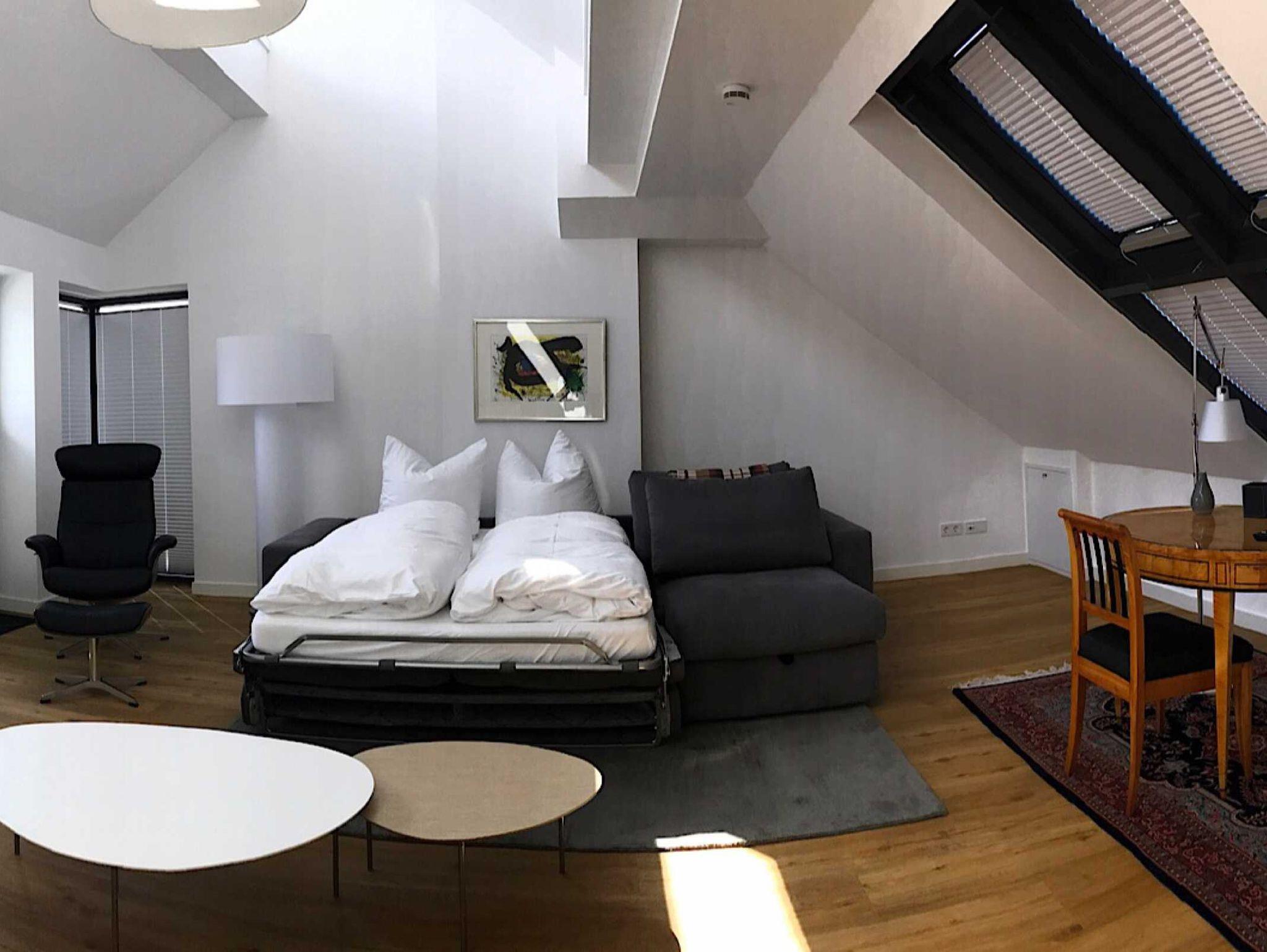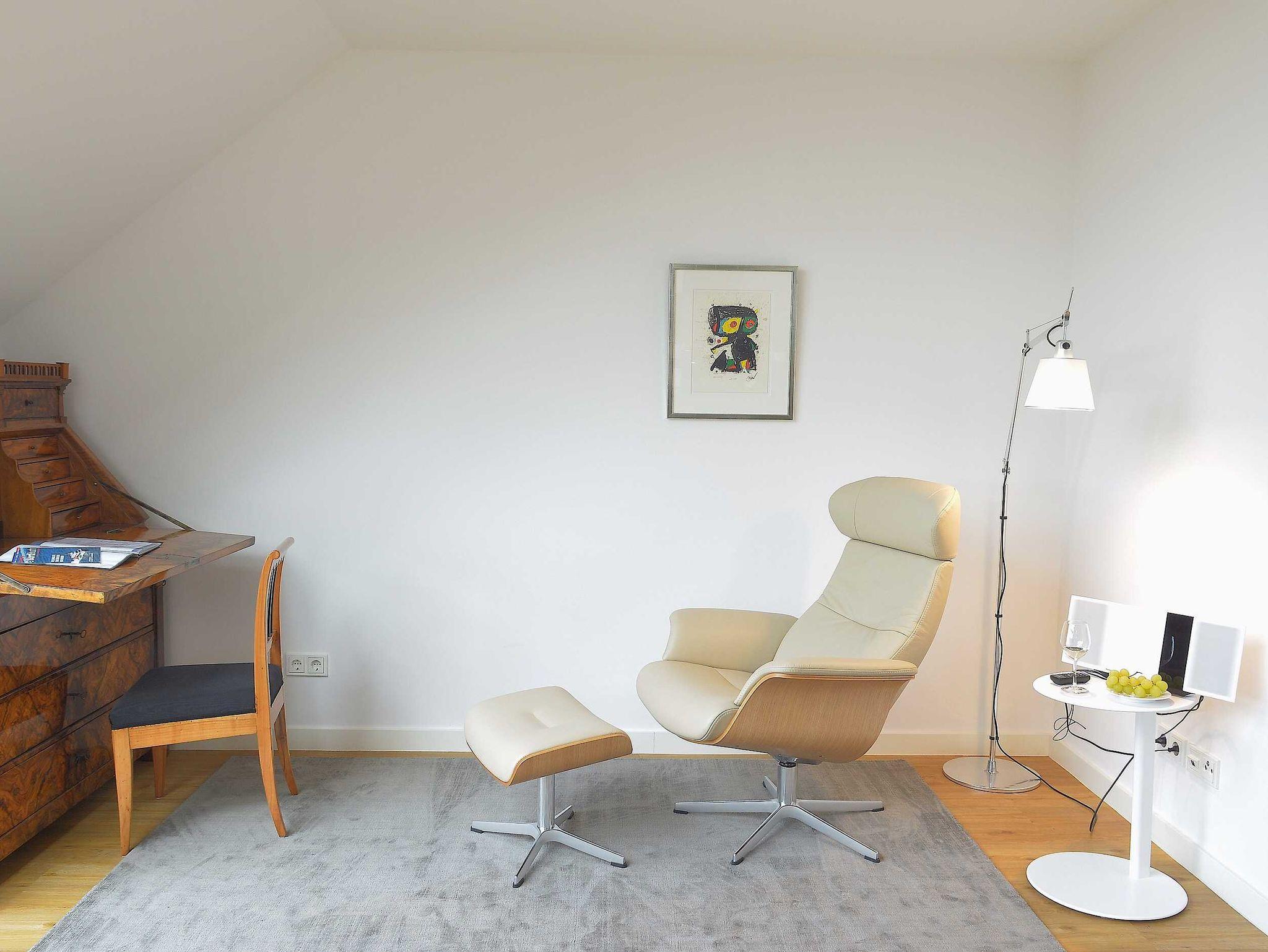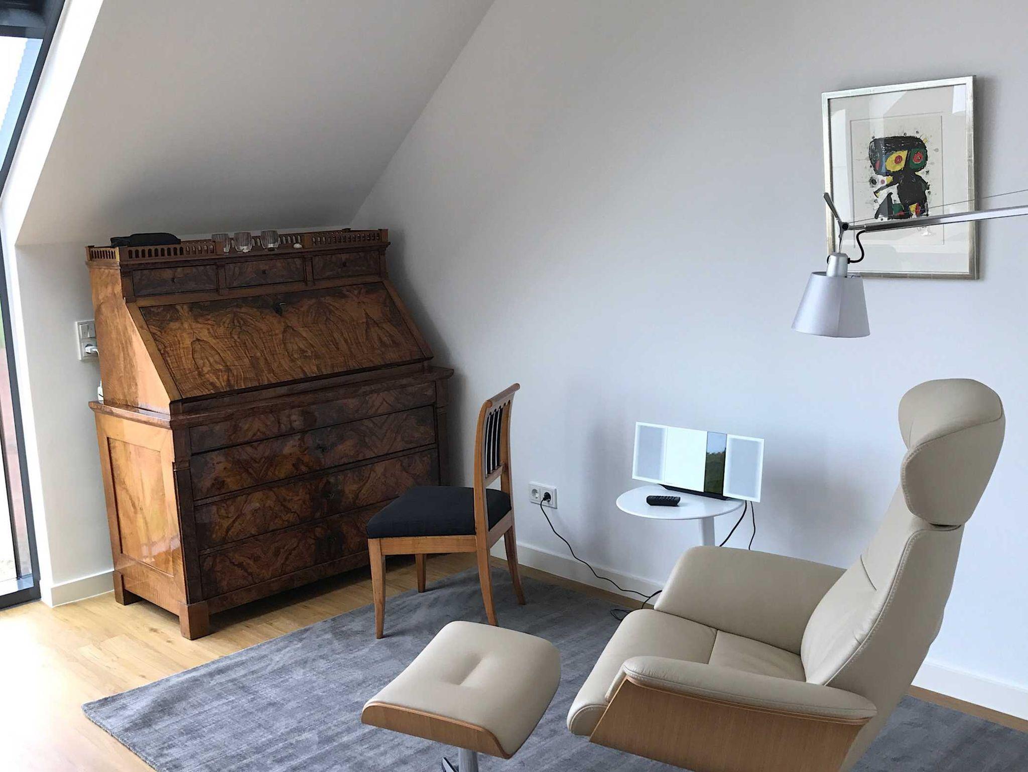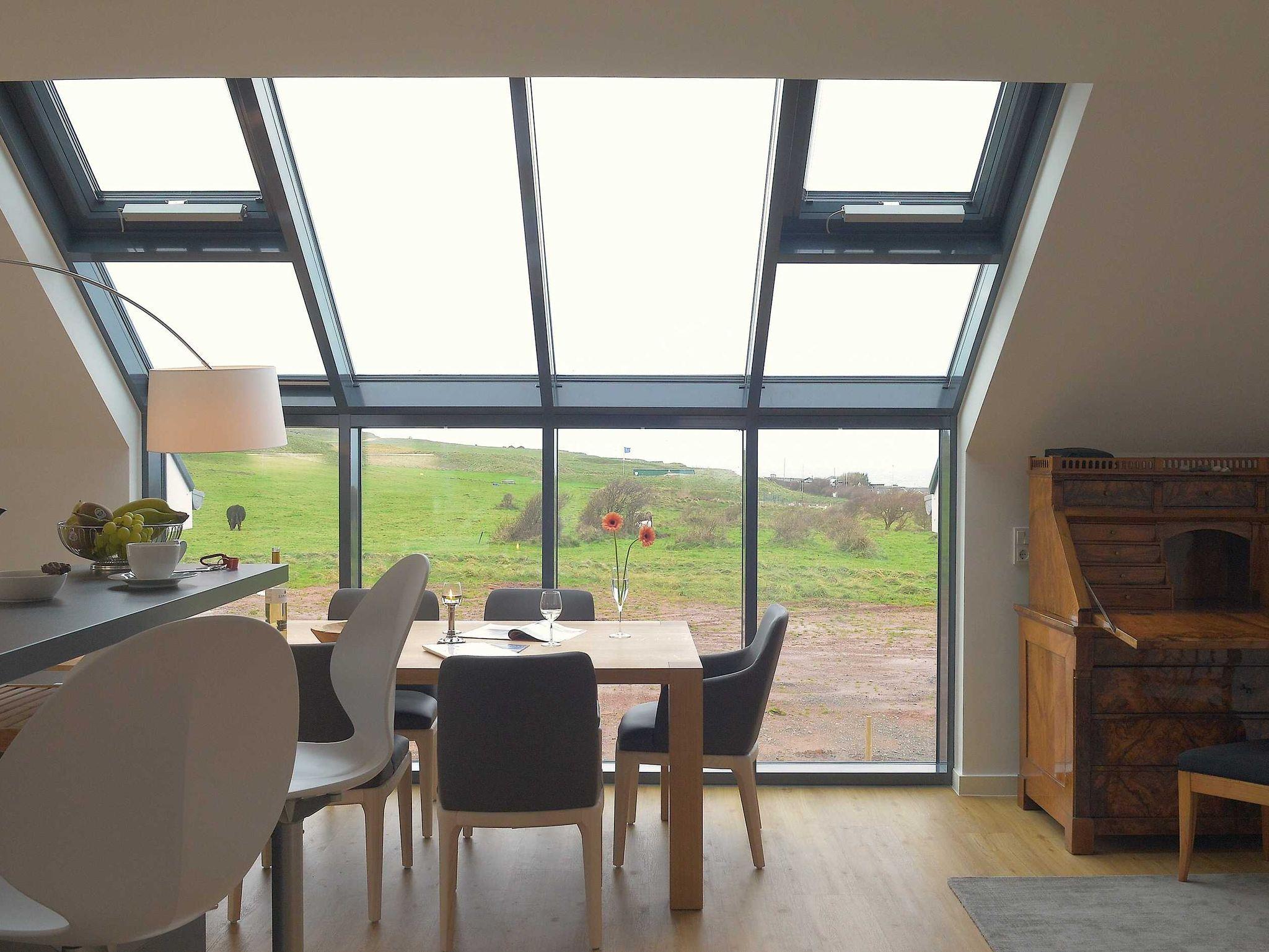 Die luxuriöse Wohnung hat ca. 79 qm Wohnfläche und verfügt in der unteren Etage über eine komplett ausgestattete Küche mit Geschirrspüler, einen großzügigen Essbereich mit Blick auf das Meer und ins Grüne, gestaltet wie ein Wintergarten. Bad mit Dusche und WC, Schlafzimmer mit einem komfortablen Doppelbett. Im Studio in der oberen Ebene befindet sich ein Wohn/Schlafbereich mit Blick auf die Nordsee durch das Panoramadachfenster und Zugang zur Dachterrasse mit Blick auf den Leuchtturm und die Düne. WLAN, TV und Radio/Dockingstation sehen zur Verfügung. Bettwäsche und Handtücher sind inklusive und werden bei längeren Aufenthalten gewechselt.