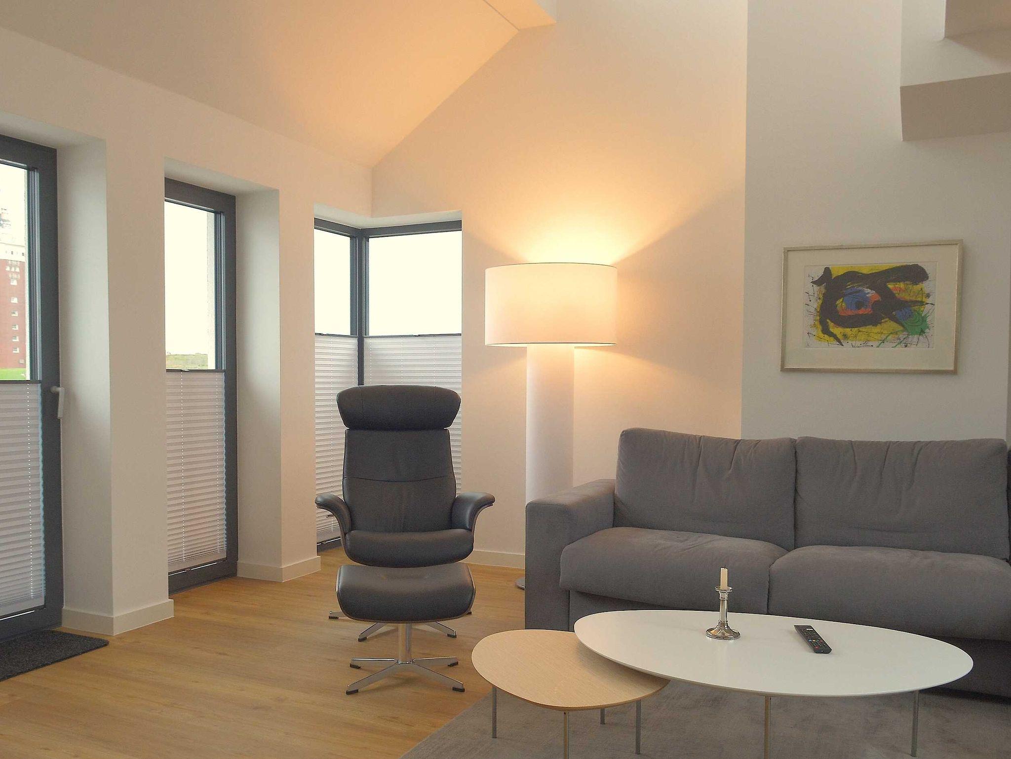 Die luxuriöse Wohnung hat ca. 79 qm Wohnfläche und verfügt in der unteren Etage über eine komplett ausgestattete Küche mit Geschirrspüler, einen großzügigen Essbereich mit Blick auf das Meer und ins Grüne, gestaltet wie ein Wintergarten. Bad mit Dusche und WC, Schlafzimmer mit einem komfortablen Doppelbett. Im Studio in der oberen Ebene befindet sich ein Wohn/Schlafbereich mit Blick auf die Nordsee durch das Panoramadachfenster und Zugang zur Dachterrasse mit Blick auf den Leuchtturm und die Düne. WLAN, TV und Radio/Dockingstation sehen zur Verfügung. Bettwäsche und Handtücher sind inklusive und werden bei längeren Aufenthalten gewechselt. Es stehen Waschmaschinen und Trockner gegen Gebühr (Münzgeräte) im Untergeschoss zur Verfügung.