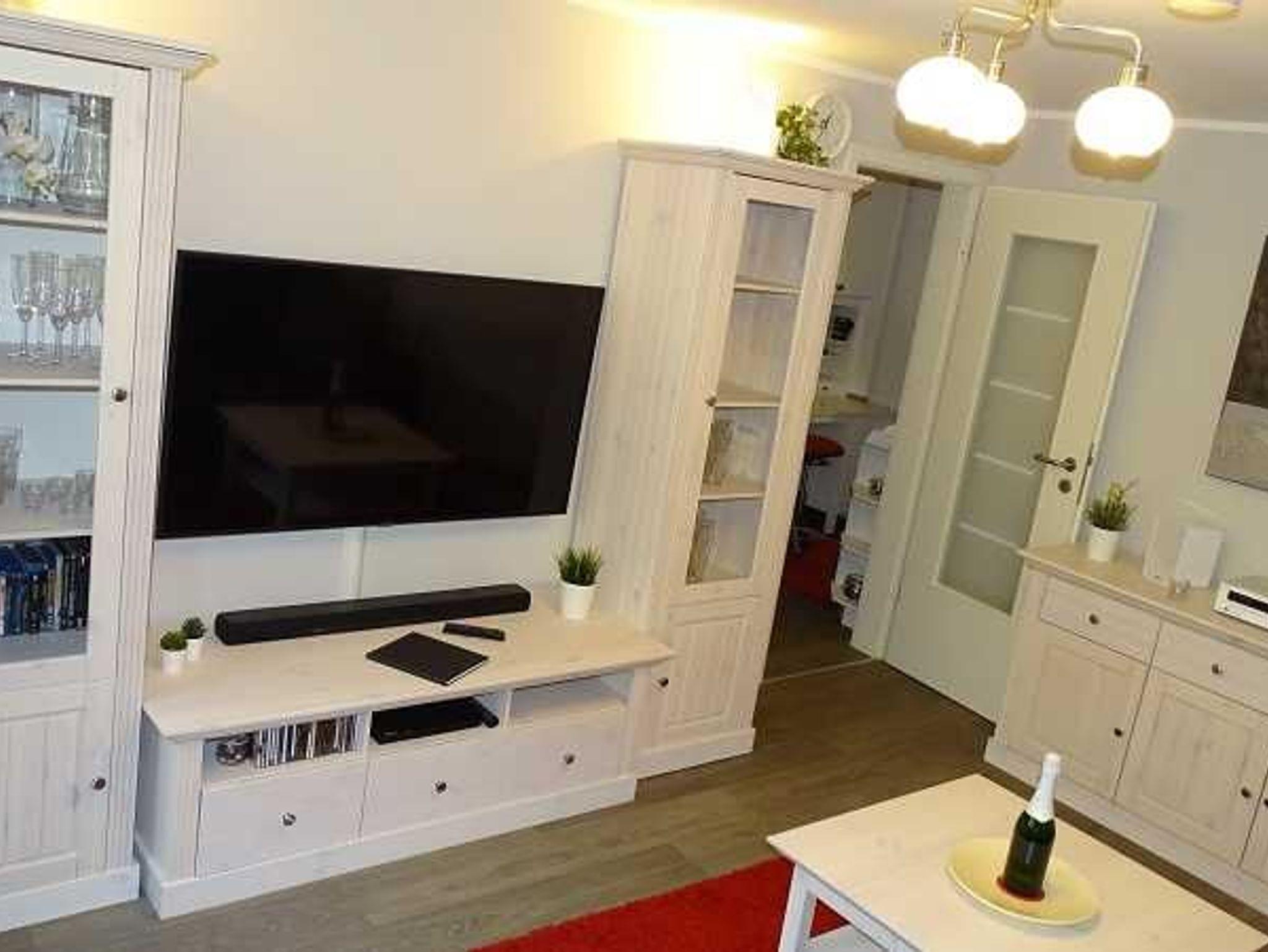 · Wohnzimmer mit hochwertiger Ledercouch, 55 TV mit BluRay ? Player, Soundbar und separater Musik-Anlage.