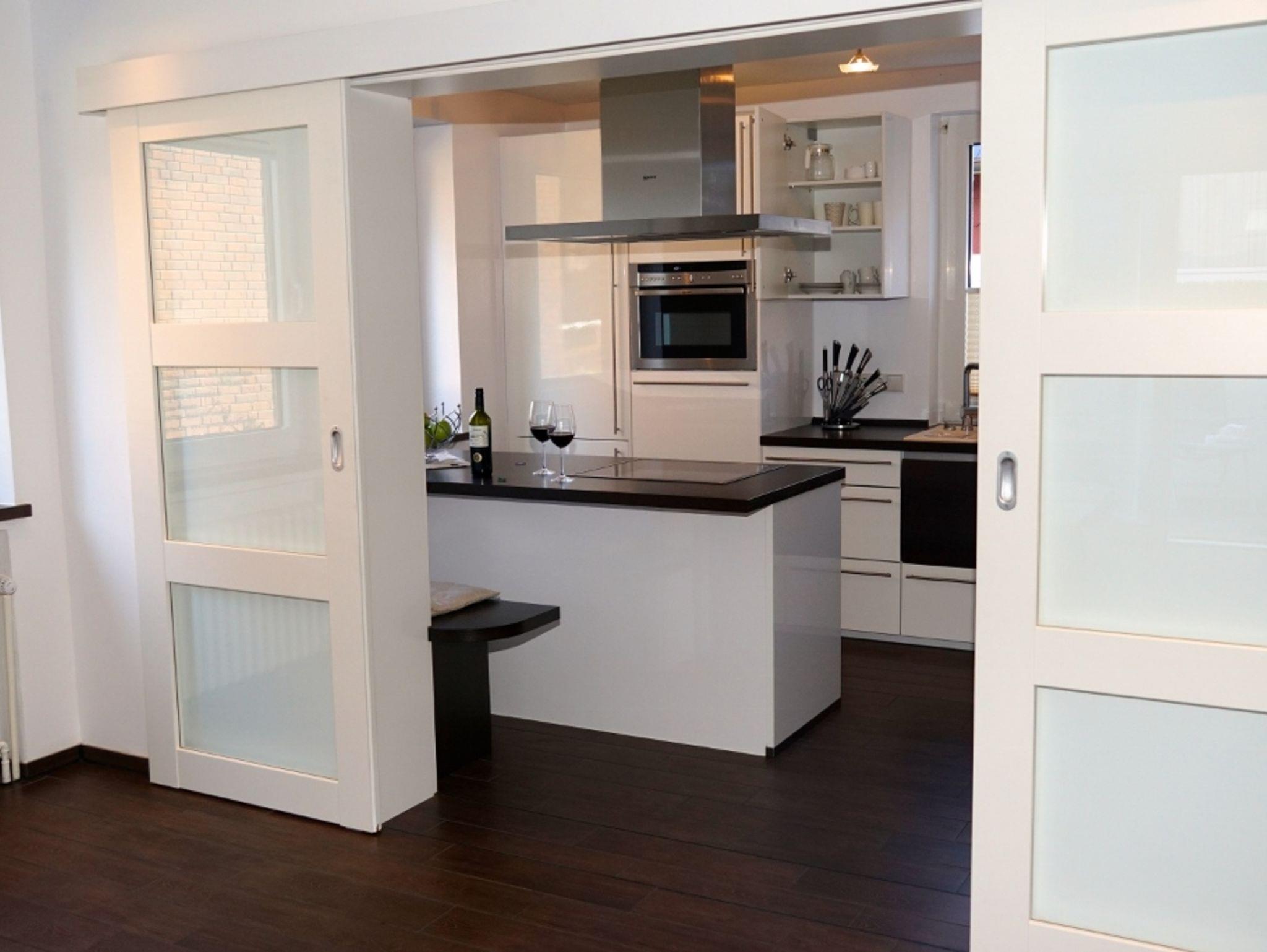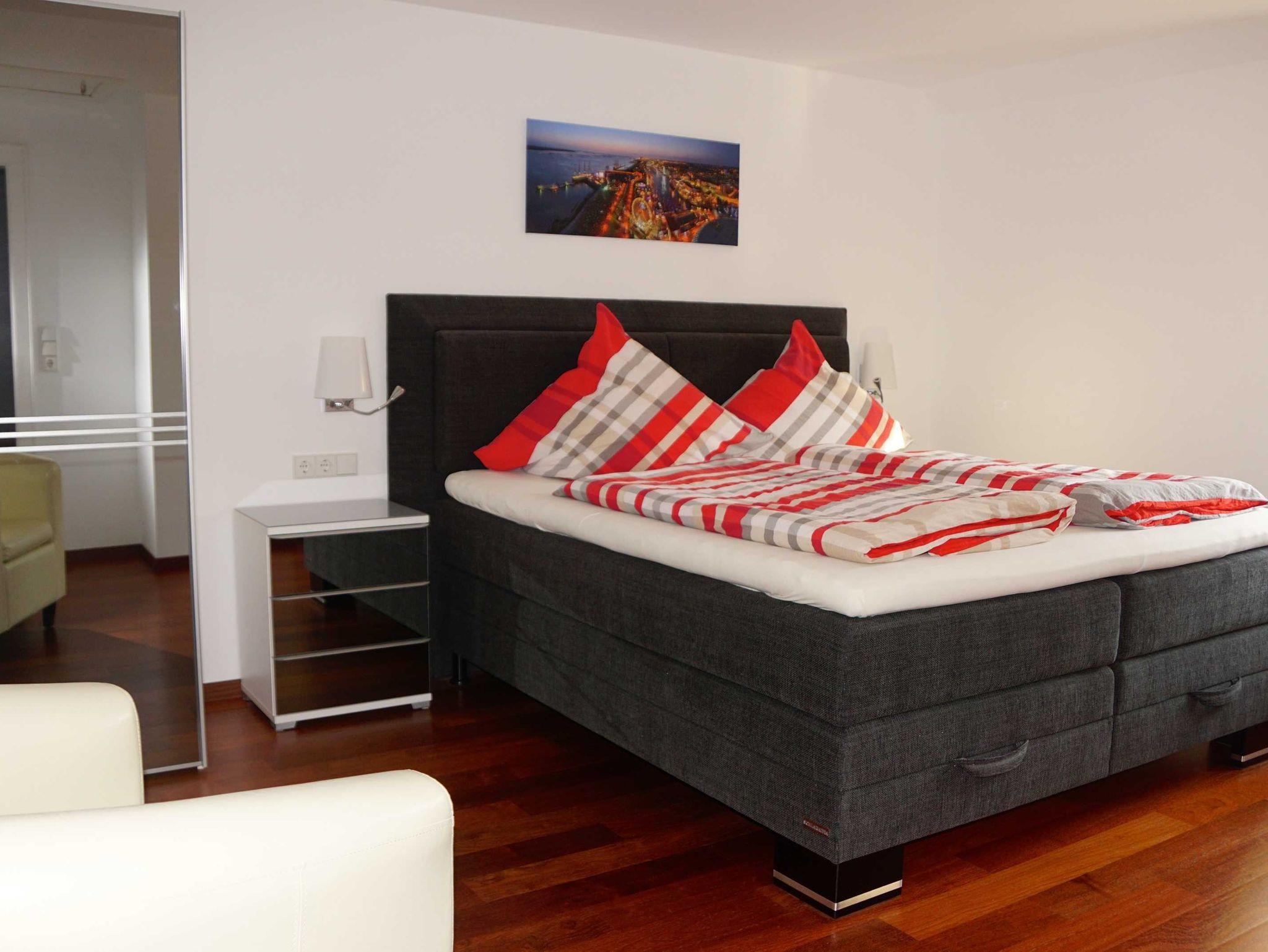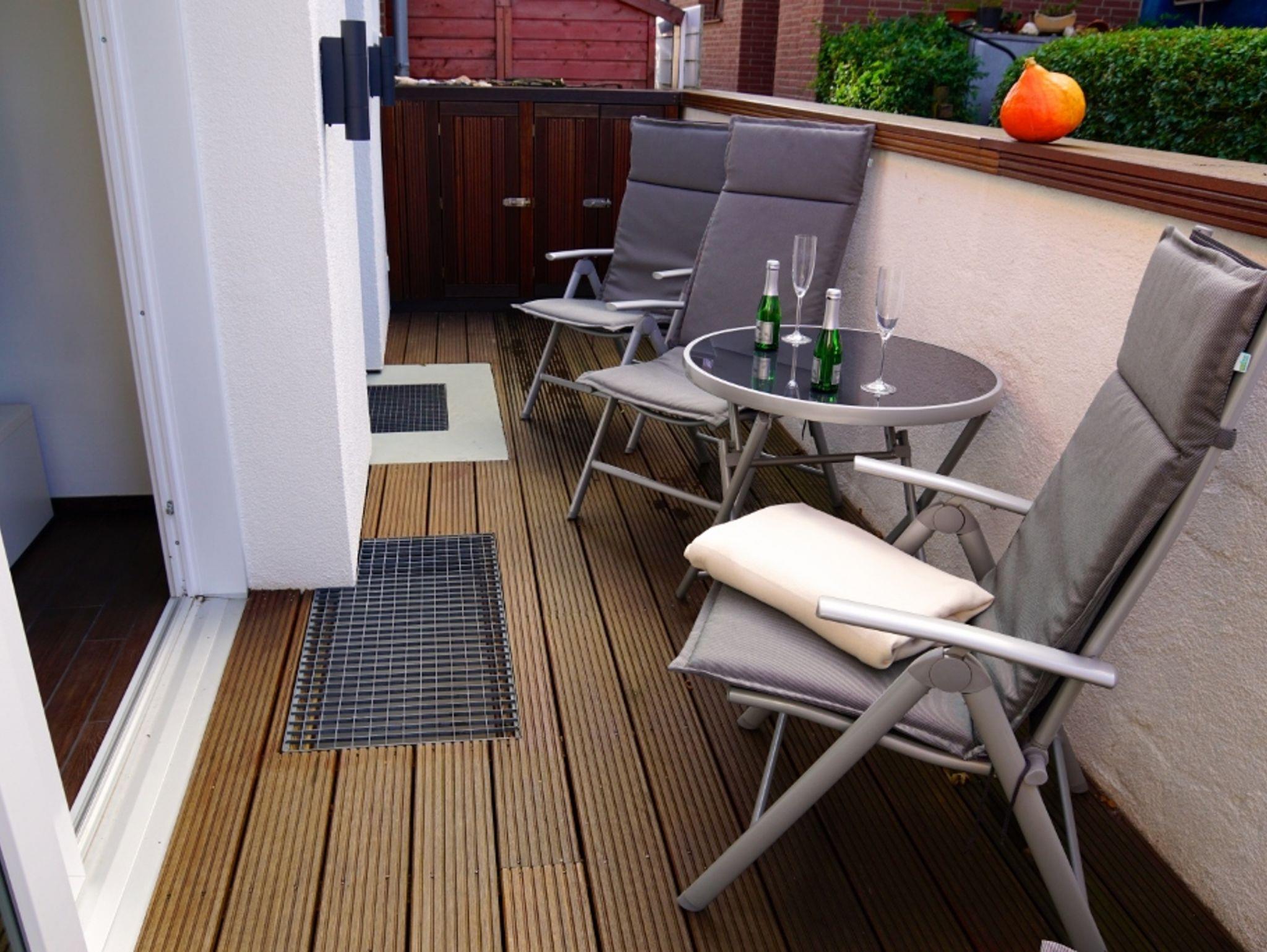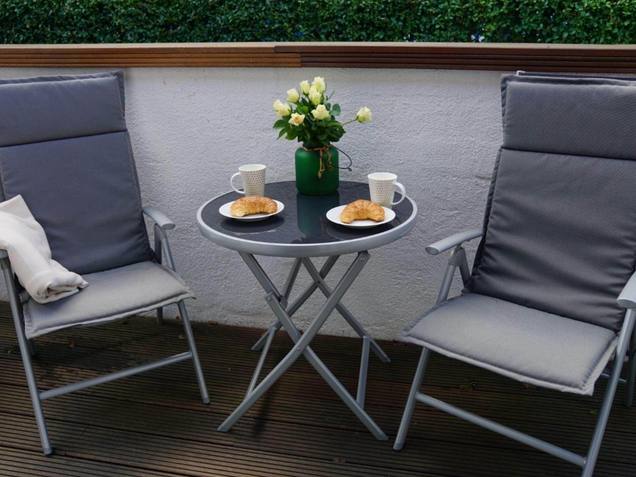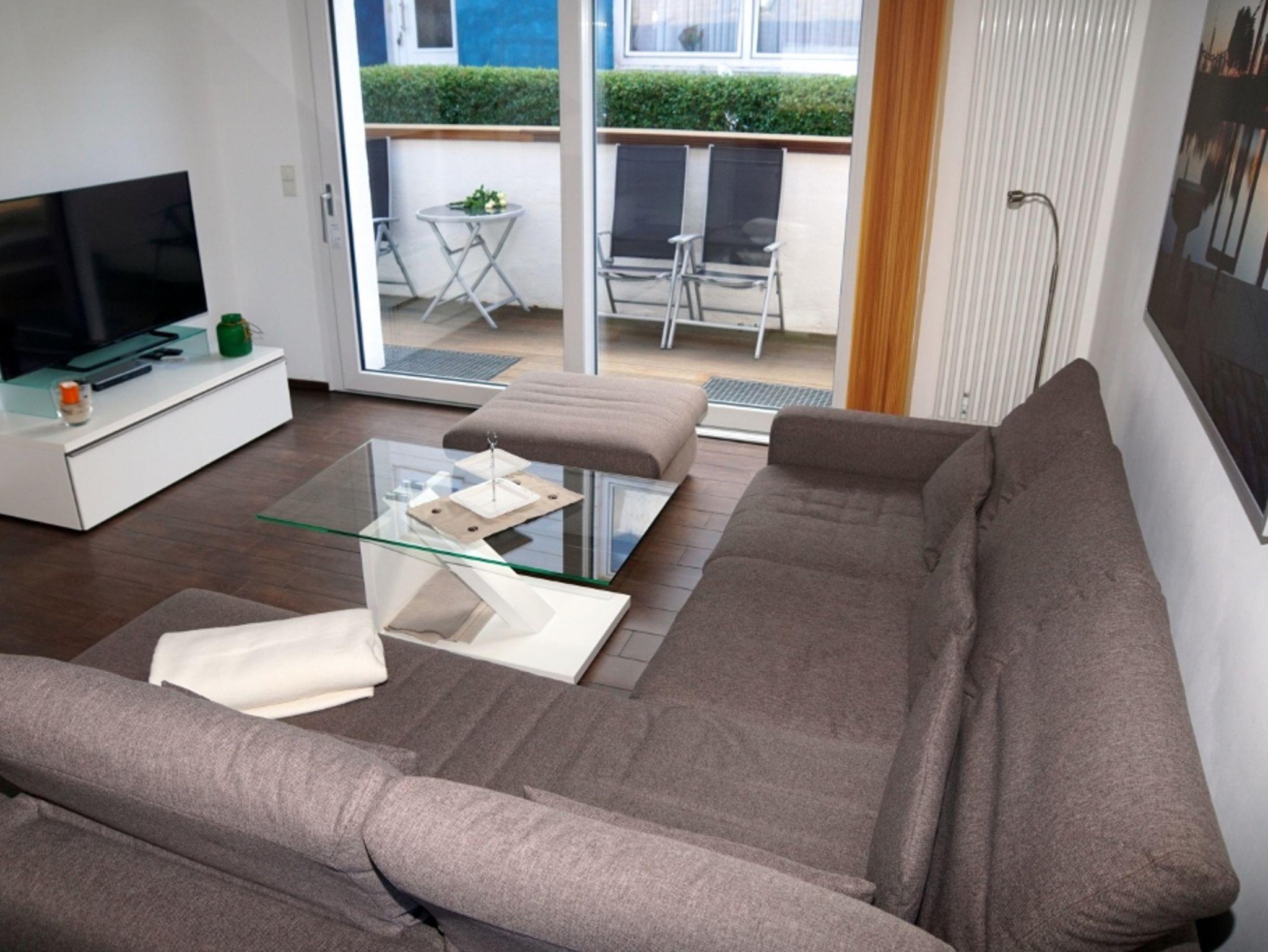 Das Wohnzimmer bietet durch Schiebe-Glastüren einen Zugang zur kleinen Sonnenterrasse.