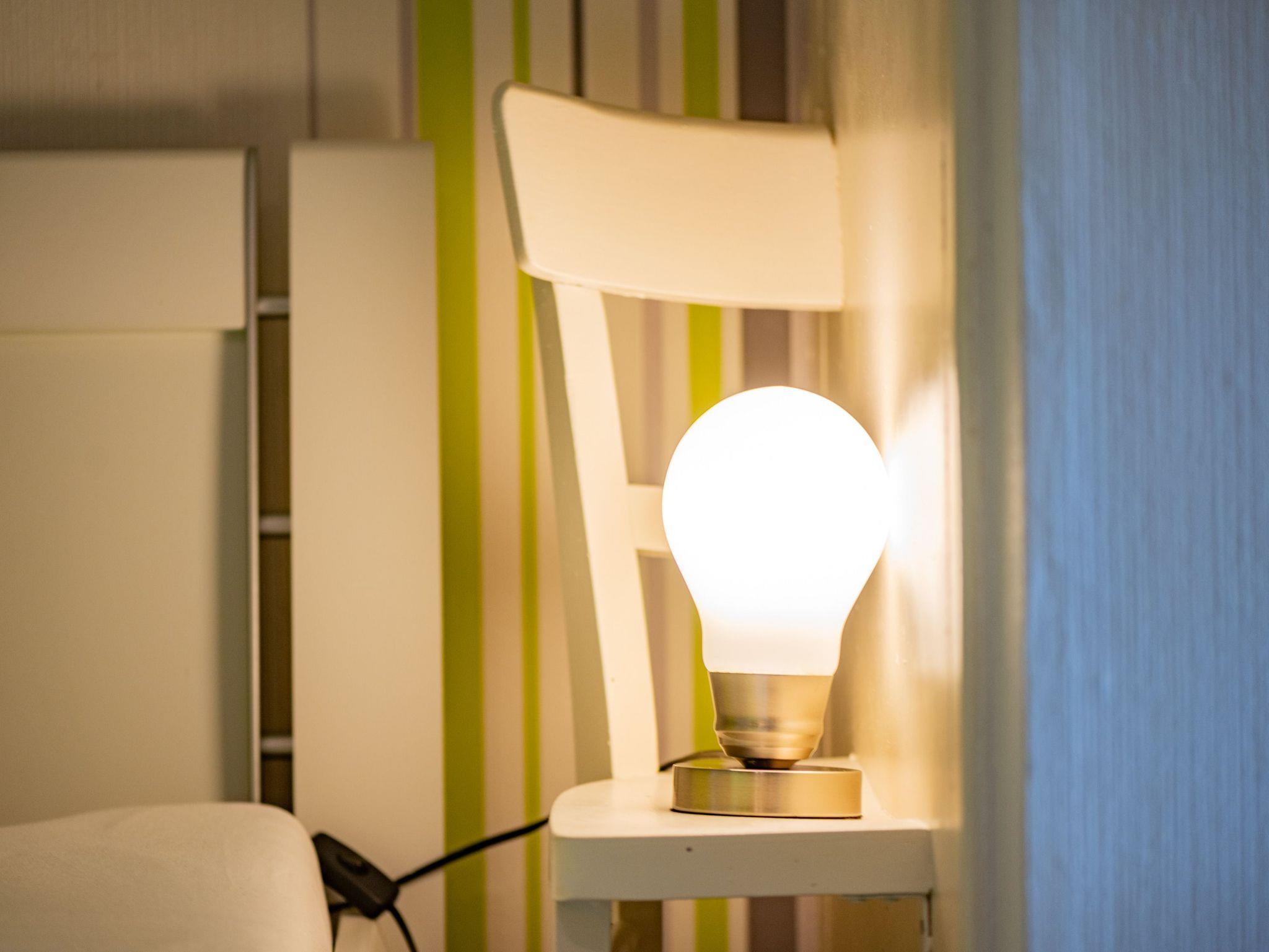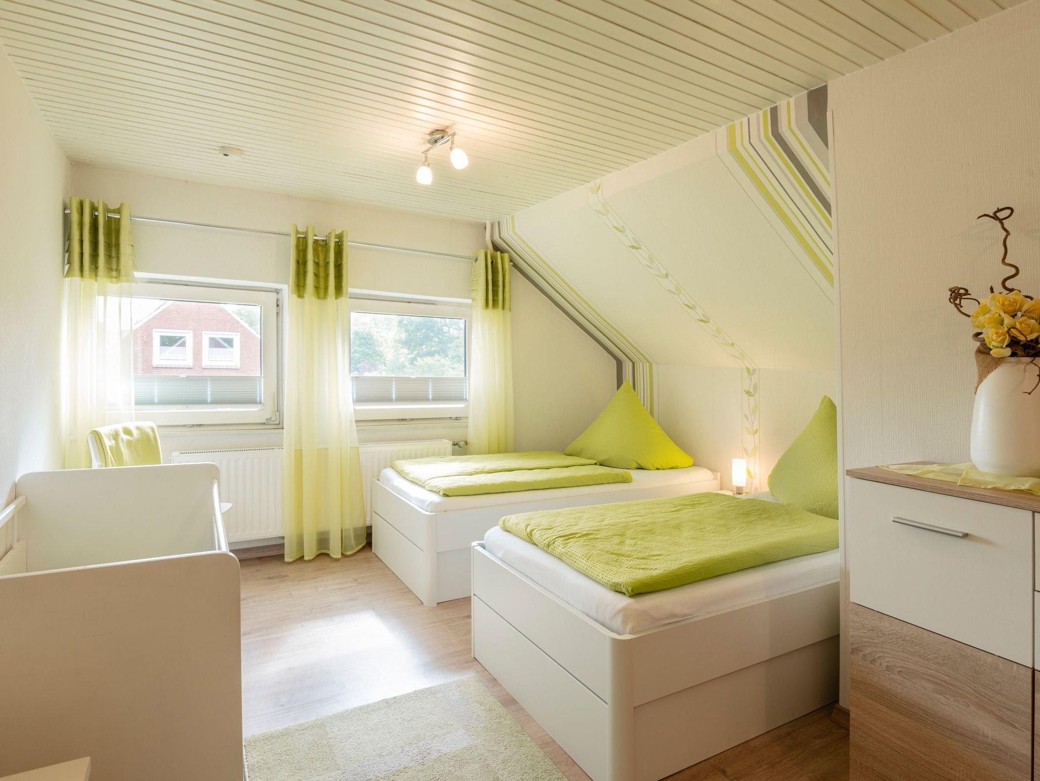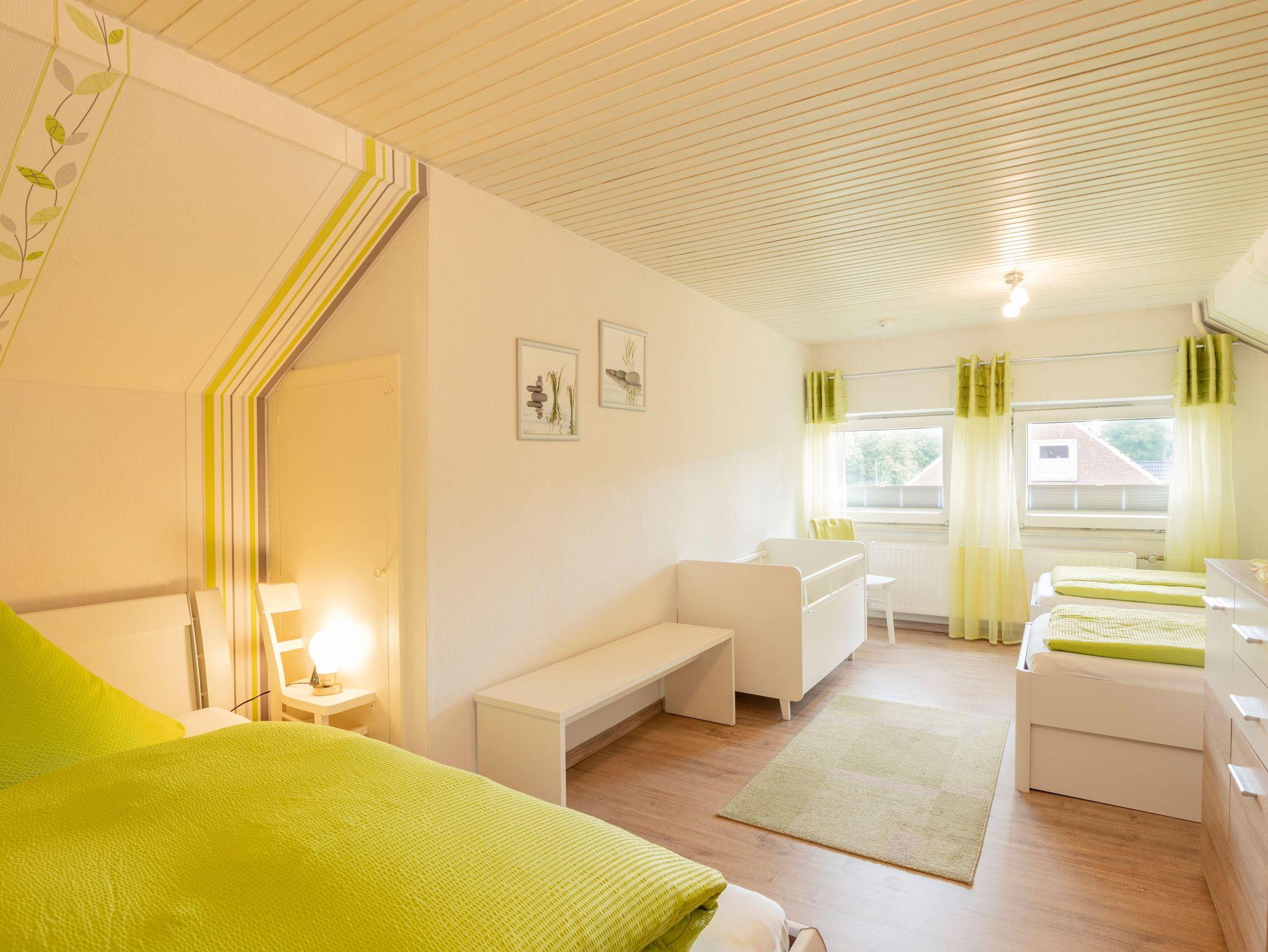 Im Obergeschoss befindet sich ein großes und geschmackvoll eingerichtetes Mehrbettzimmer. Es verfügt über zwei Einzelbetten (0,90 m x 2,00 m) die bei Bedarf zusammen gestellt werden können, sowie ein drittes Bett (1,40 m x 2,00 m) und ein zusätzliches Kindergitterbett.