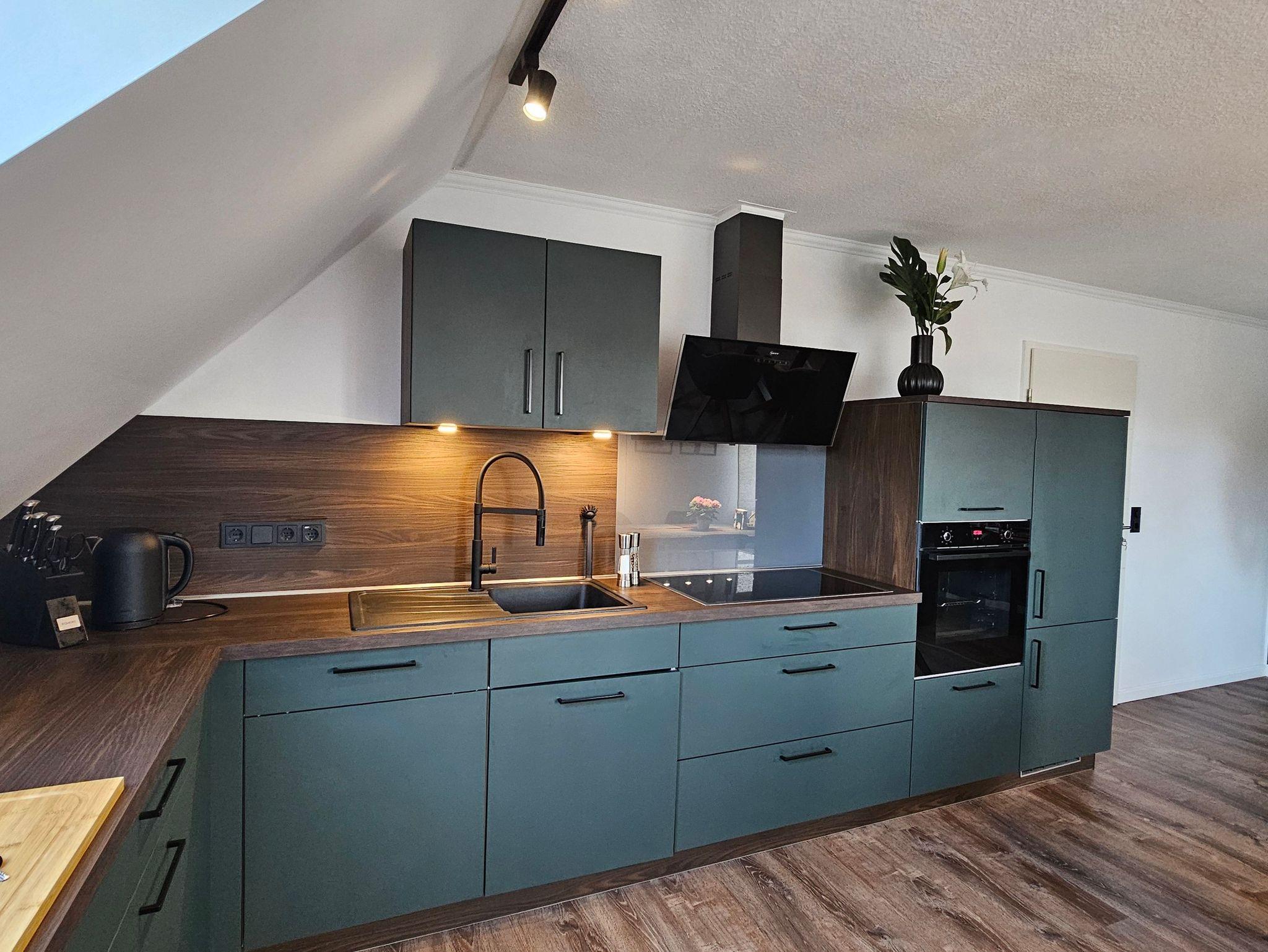 Die neue, große Einbauküche ist mit diversen Zusatzgeräten (Spülmaschine, Mikrowelle, Backofen, Induktionskochfeld, Senseo-Kaffemaschine, Filter-Kaffeemaschine, Toaster, Mixer, Wasserkocher, Kühl- Gefrierkombination etc.) komplett ausgestattet.