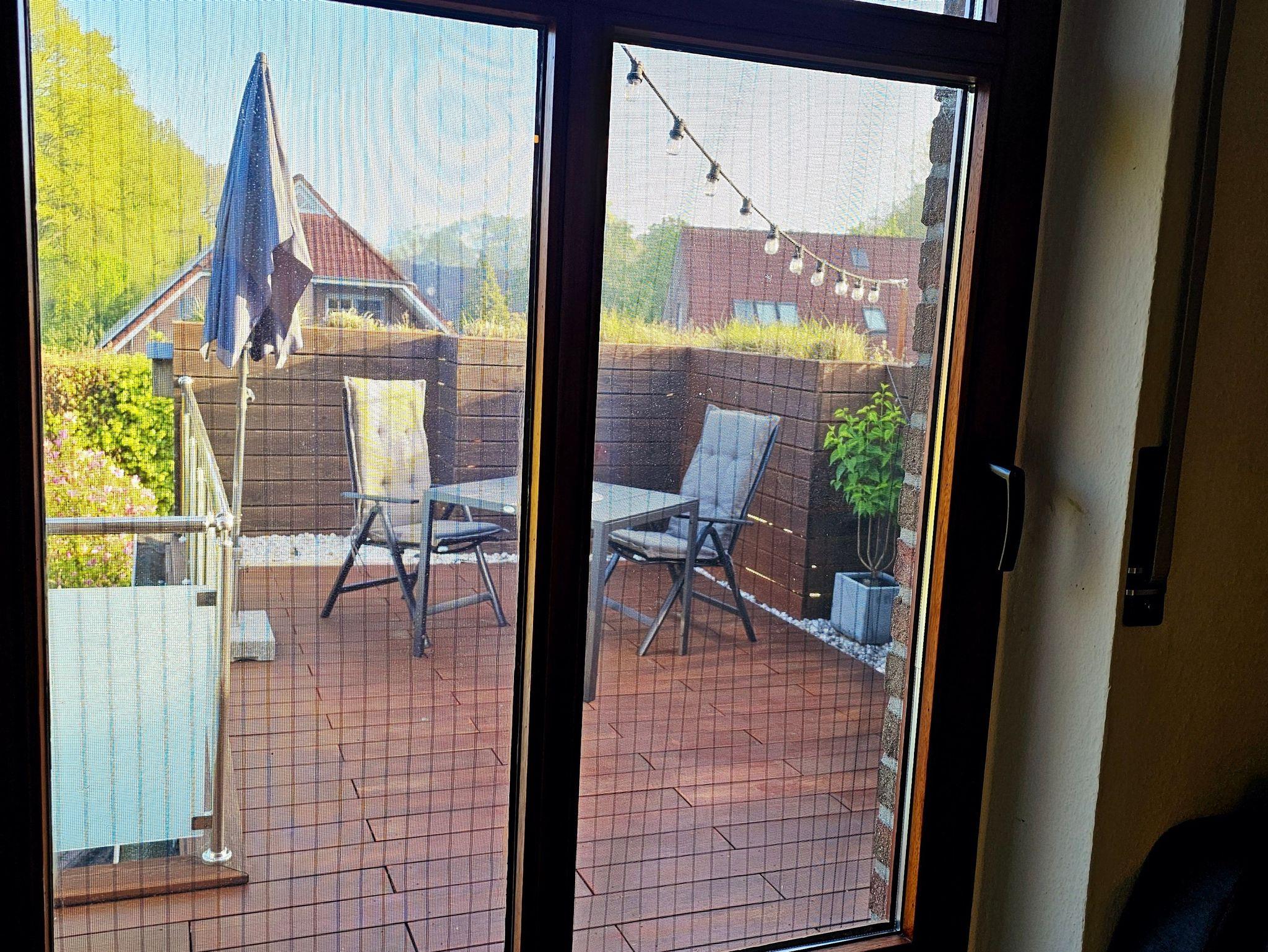 Die Ferienwohnung hat einen eigenen Haupteingang. Der Wohnbereich ist ausgestattet mit einer gemütlichen Sitzgarnitur und einem 55 Zoll Flachbildschirmfernseher. Durch die Außentür gelangt man direkt auf eine Dachterrasse. Hier lässt sich die gute ostfriesische Luft genießen oder morgens z.B. gemütlich frühstücken. Eine Grillmöglichkeit (WMF-Elektro-Grill) ist dort ebenfalls vorhanden.