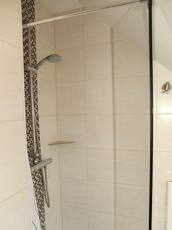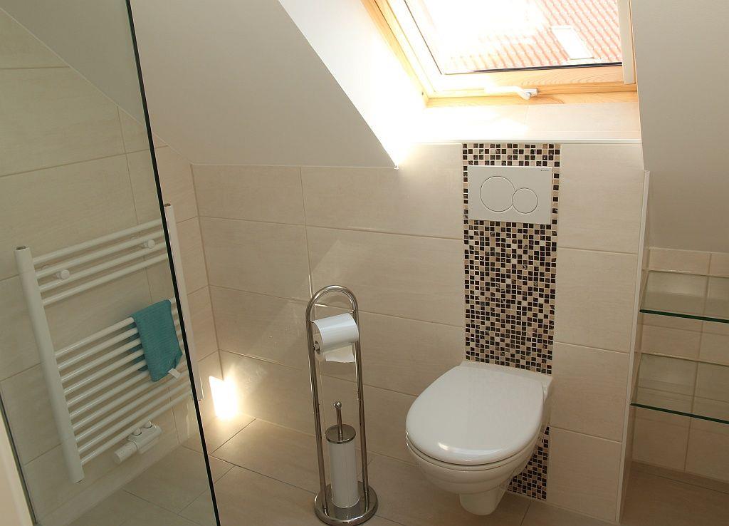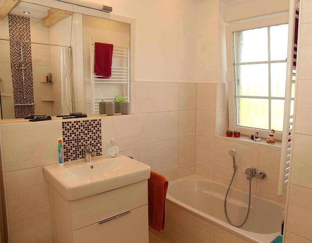 Ein Schlafzimmer mit Doppelbett, Kleiderschrank und Fernseher sowie ein Bad mit Badewanne, Dusche, WC, Waschbecken und Föhn sind noch im Erdgeschoss zu finden. Ebenso ein Abstellraum mit Waschmaschine und Trockner.