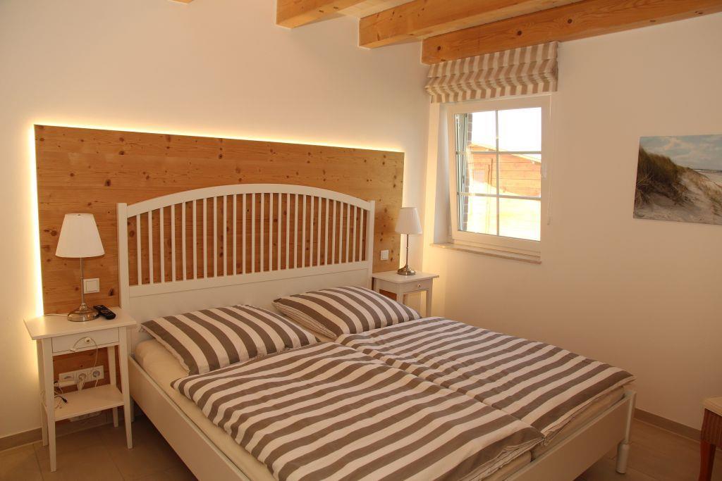 Offene Treppe vom Wohnraum ins Obergeschoss in eine offene Galerie. Von hier geht es in ein kleineres Schlafzimmer mit Doppelbett, Kleiderschrank und Fernseher, ein zweites größeres Schlafzimmer mit Kleiderschrank und Fernseher und in ein kleines Duschbad mit WC und Waschbecken.