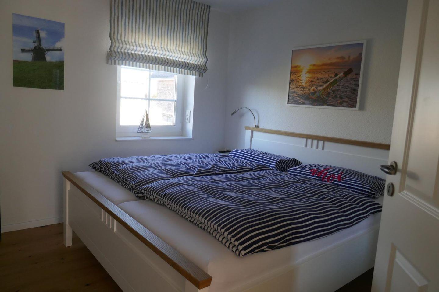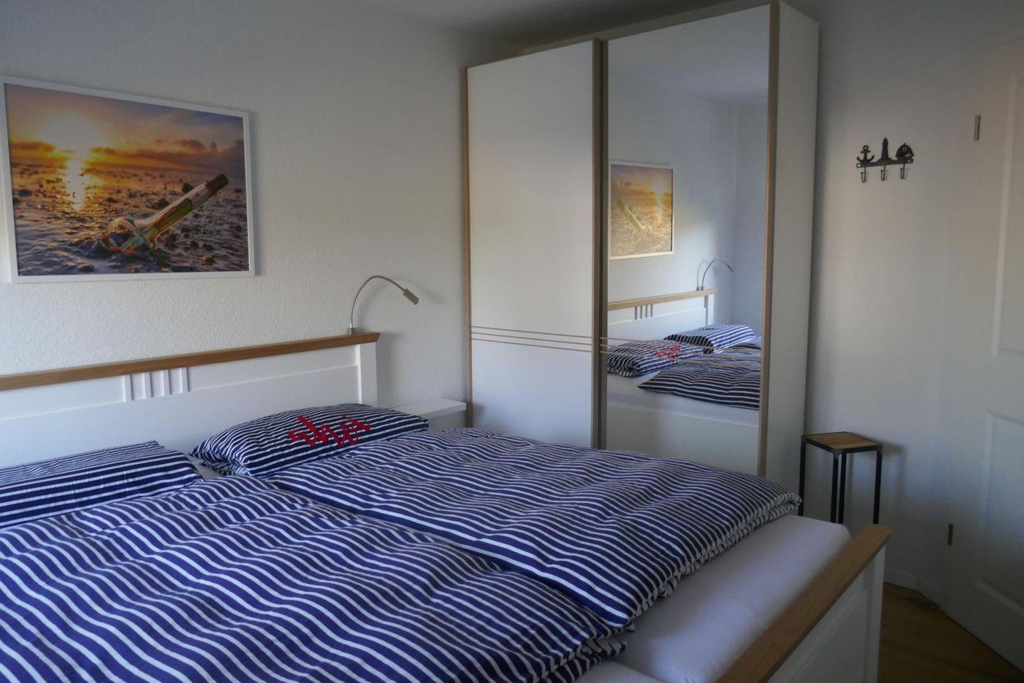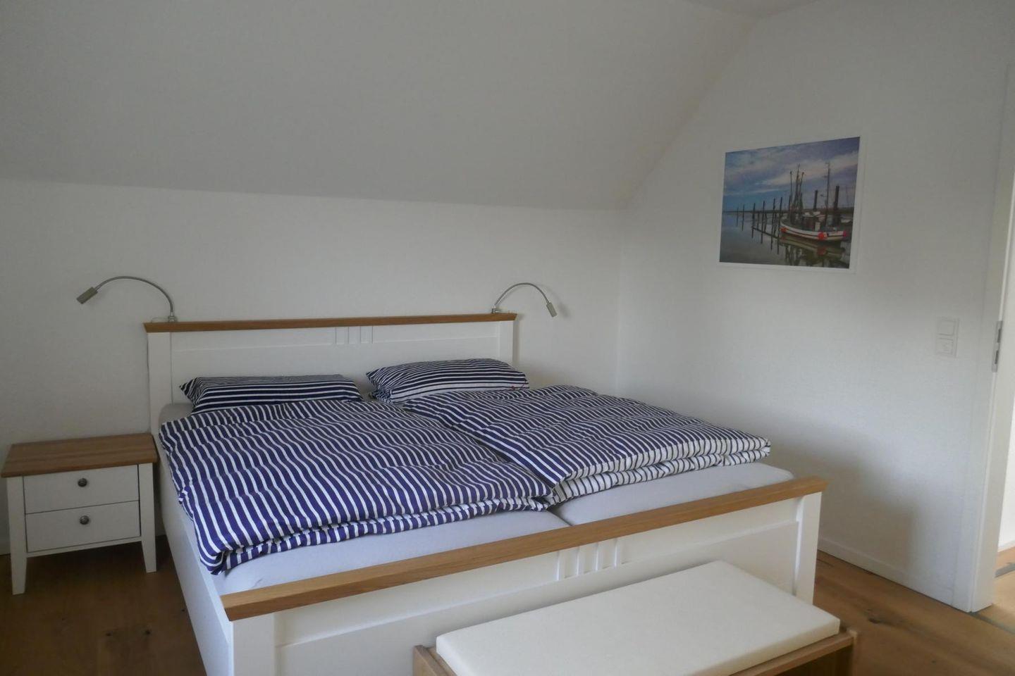 Im Obergeschoss des Hauses erwarten Sie die beiden anderen Schlafzimmer (eines mit Doppelbett, Schrankwand und der Seekiste des Steuermanns, das andere mit 2 Einzelbetten und großem Kleiderschrank). Auch diese Schlafzimmer sind mit schwenkbaren Flachbildfernsehern ausgestattet. Ein zweites Duschbad komplettiert das Obergeschoss. Ein Trip-Trap-Stuhl für Kinder sowie ein Babybett mit Matratze werden im Haus vorgehalten und können bei Bedarf und entsprechender Voranmeldung kostenfrei genutzt werden.